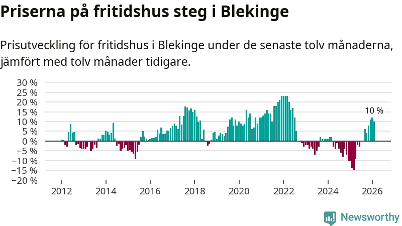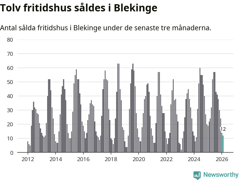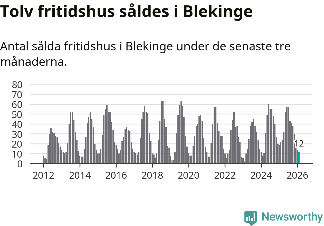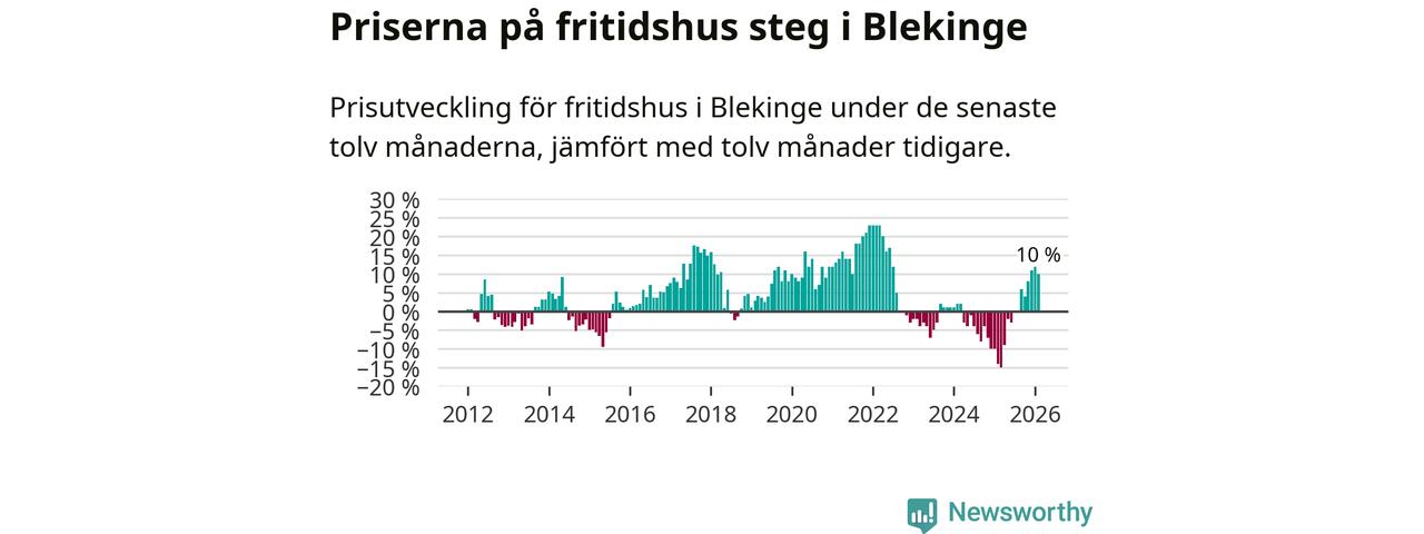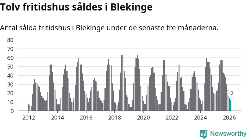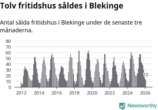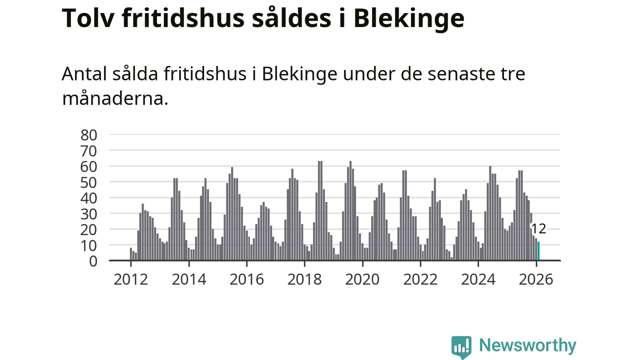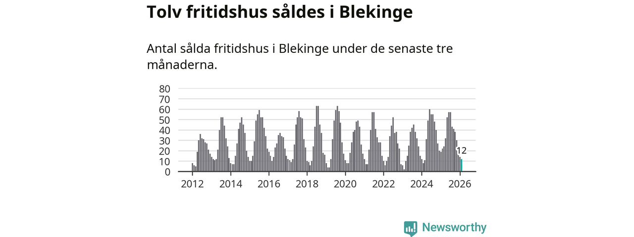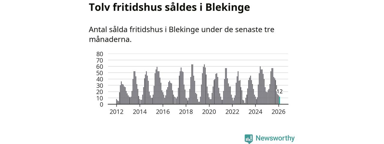 Sammanlagt såldes tolv fritidshus i Blekinge län mellan december 2025 och februari till ett genomsnittligt pris på 2,4 miljoner kronor. I fjol gjordes 22 affärer vid den här tiden på året.