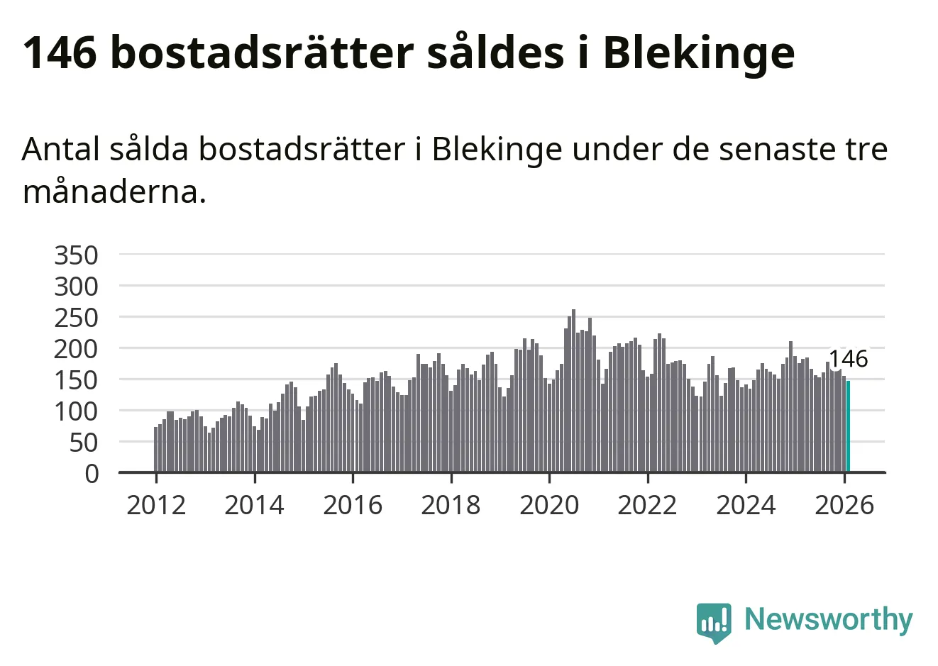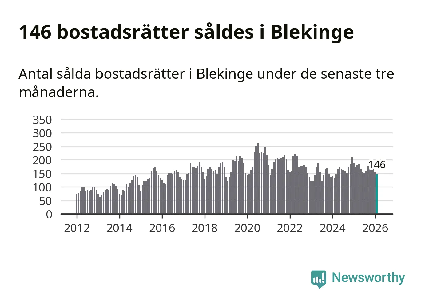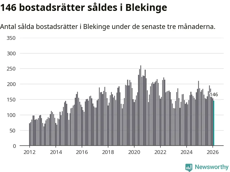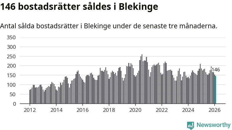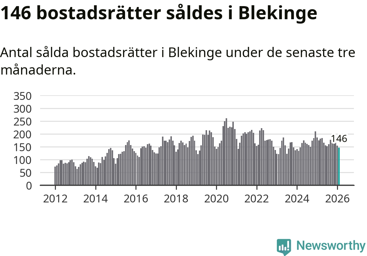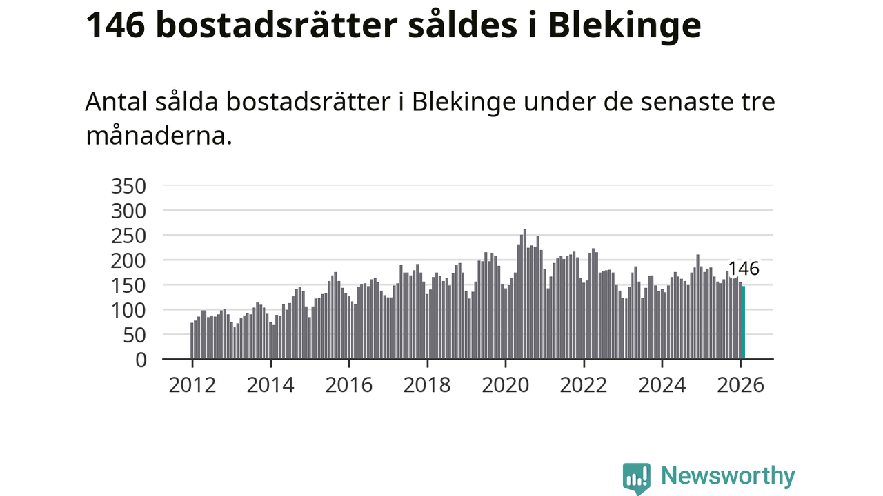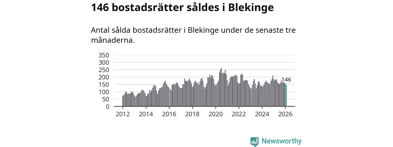 Sammanlagt såldes 146 bostadsrätter i Blekinge län mellan december och februari till ett genomsnittligt pris på 1,6 miljoner kronor. I fjol gjordes 175 affärer vid den här tiden på året.