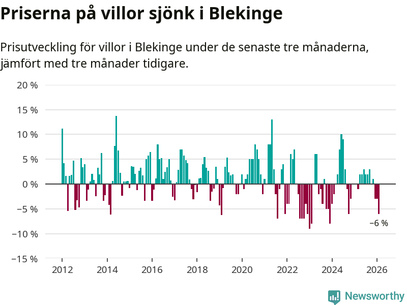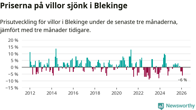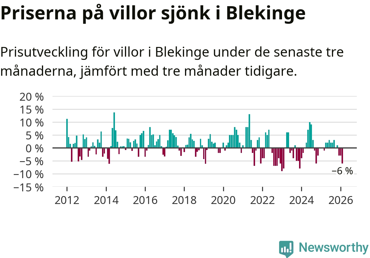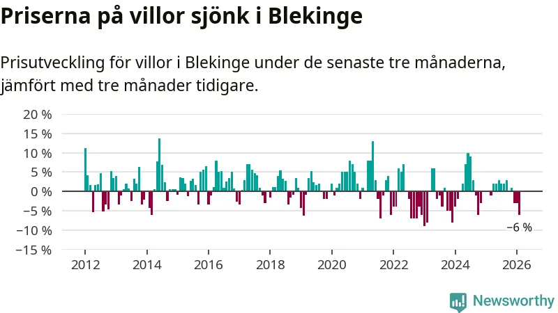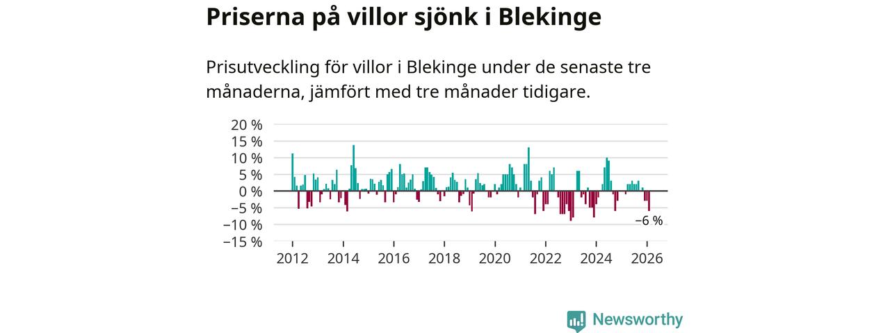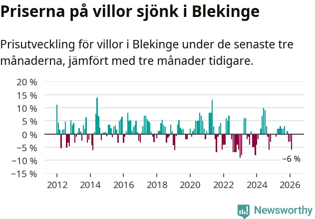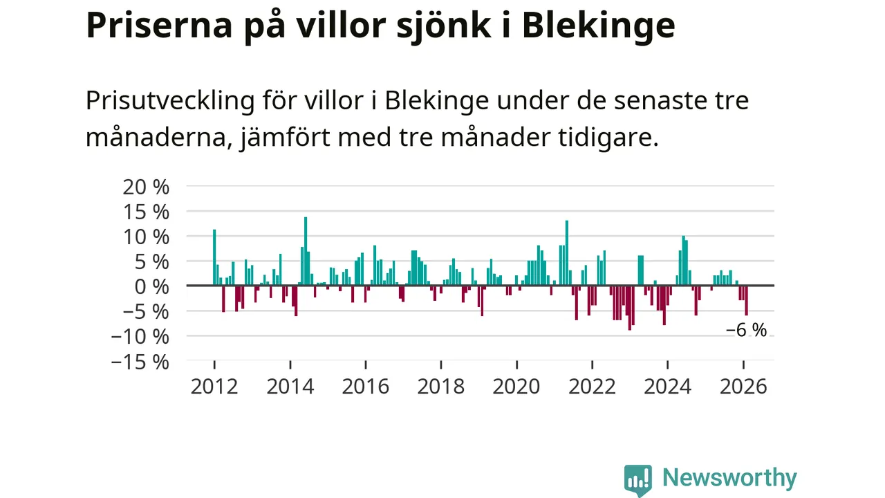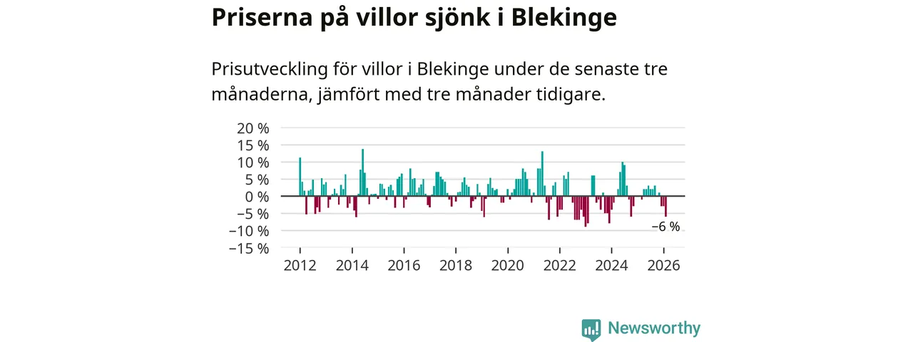 Villapriserna sjönk mellan december och februari med 6 procent i Blekinge län. Det är en betydande nedgång jämfört med det gångna året då priserna i snitt stått stilla.