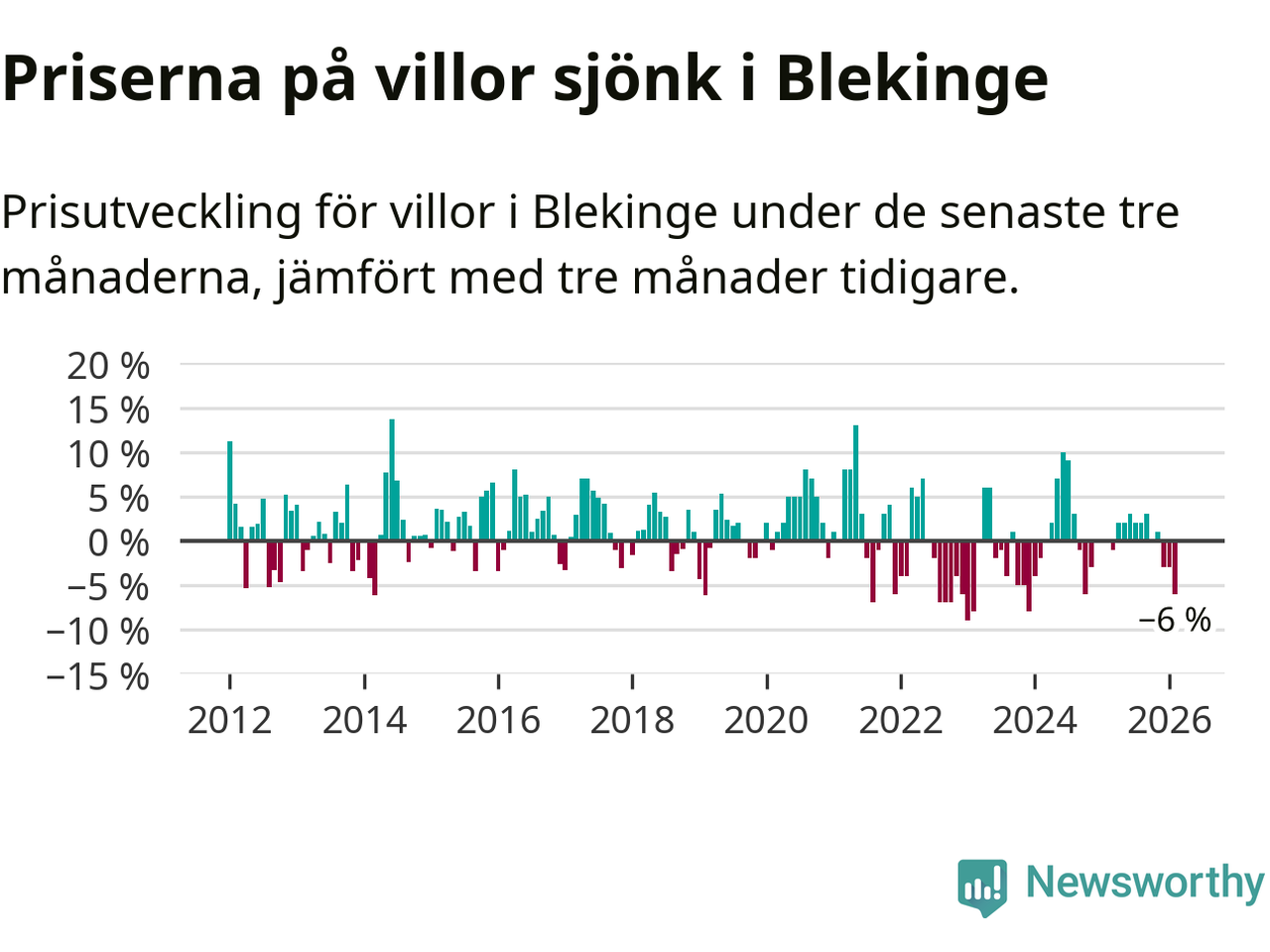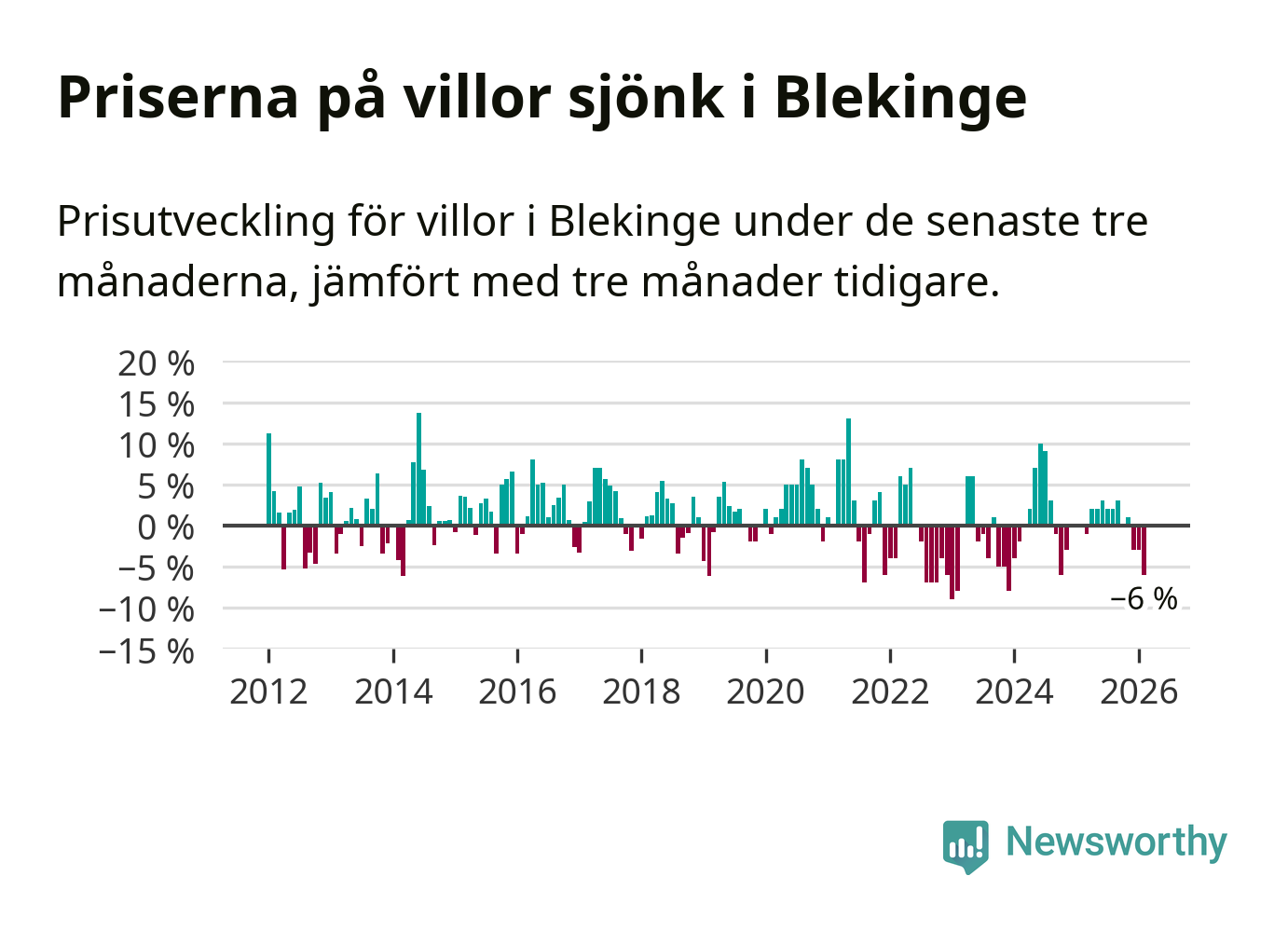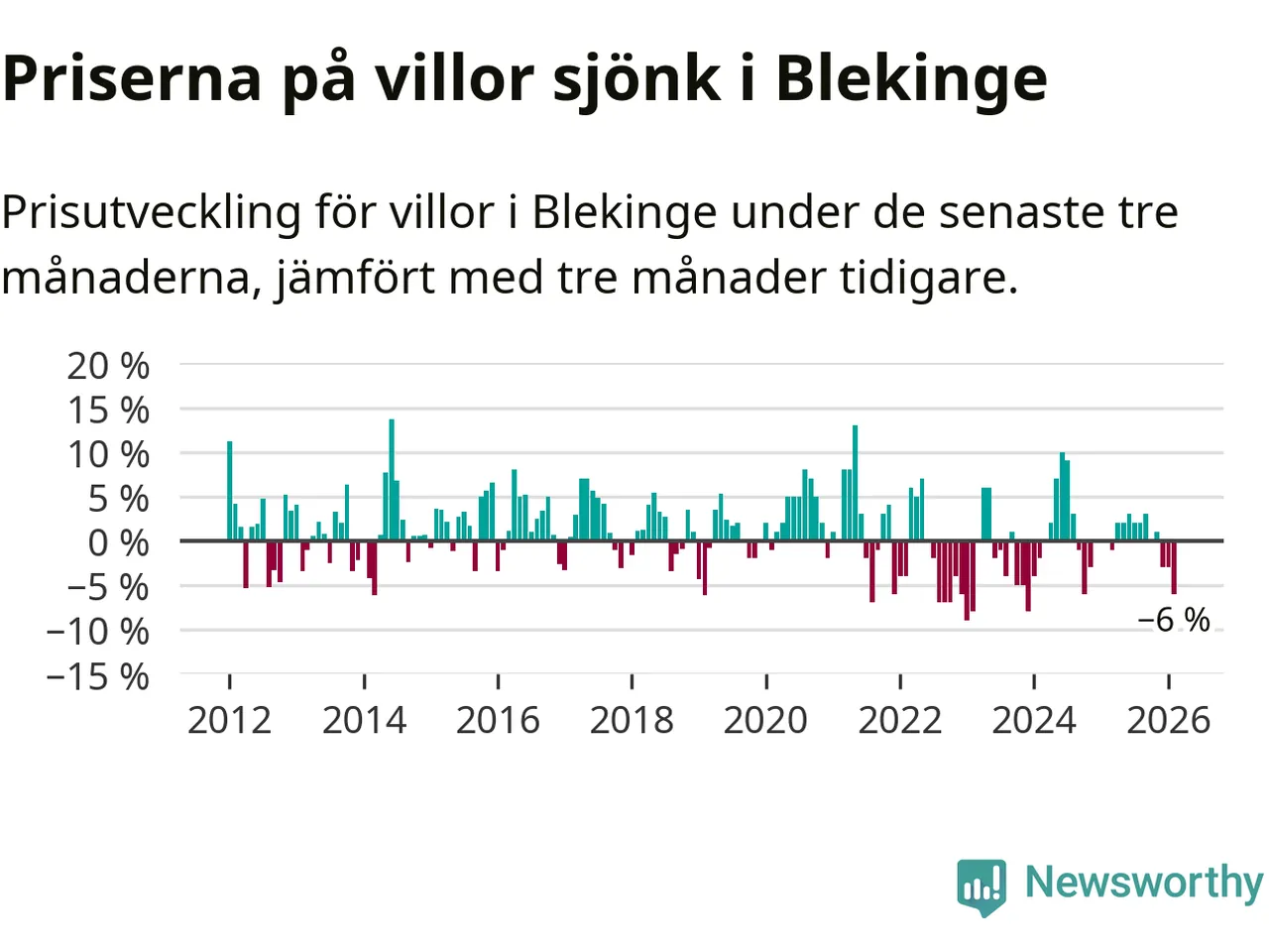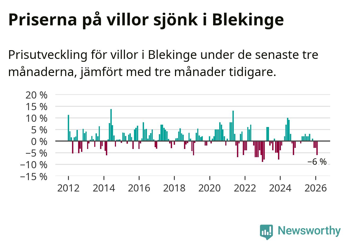 Villapriserna sjönk mellan december och februari med 6 procent i Blekinge län. Det är en betydande nedgång jämfört med det gångna året då priserna i snitt stått stilla.