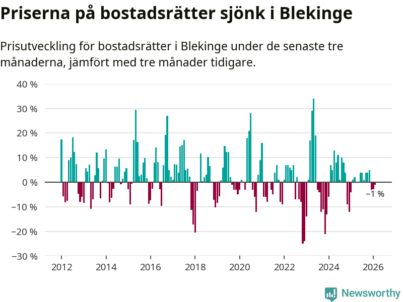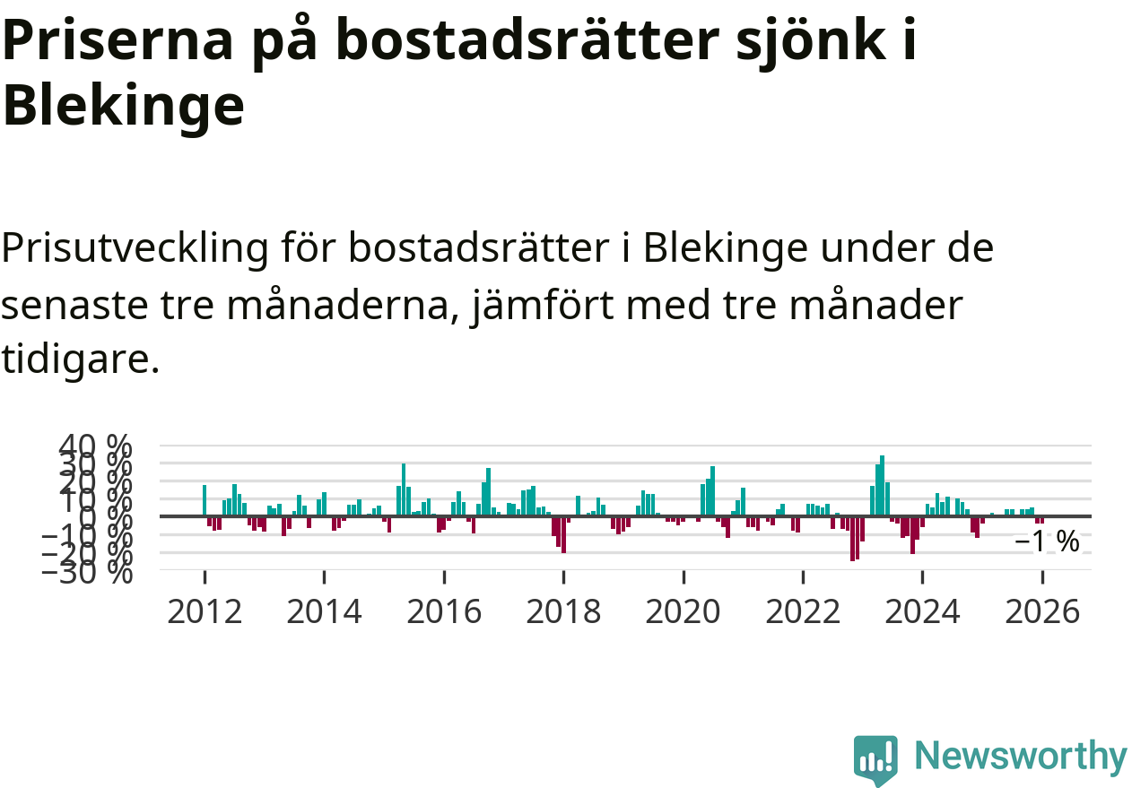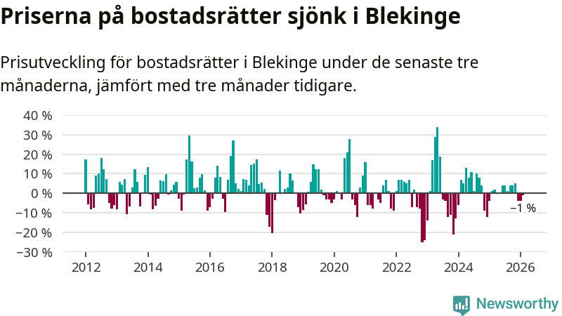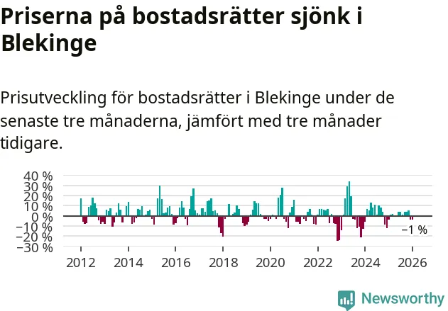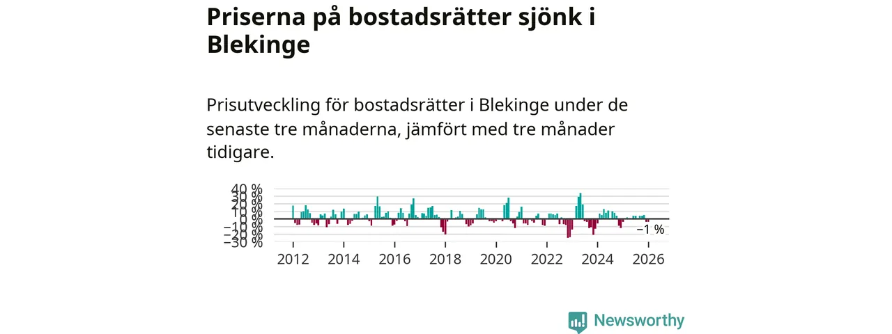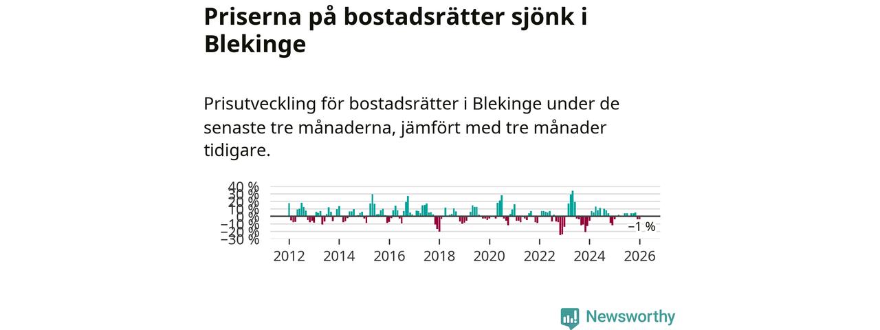 Priserna på bostadsrätter har gått ner i Blekinge län. Medelpriset på försäljningarna under de senaste tre månaderna visar på en nedgång med 1 procent.