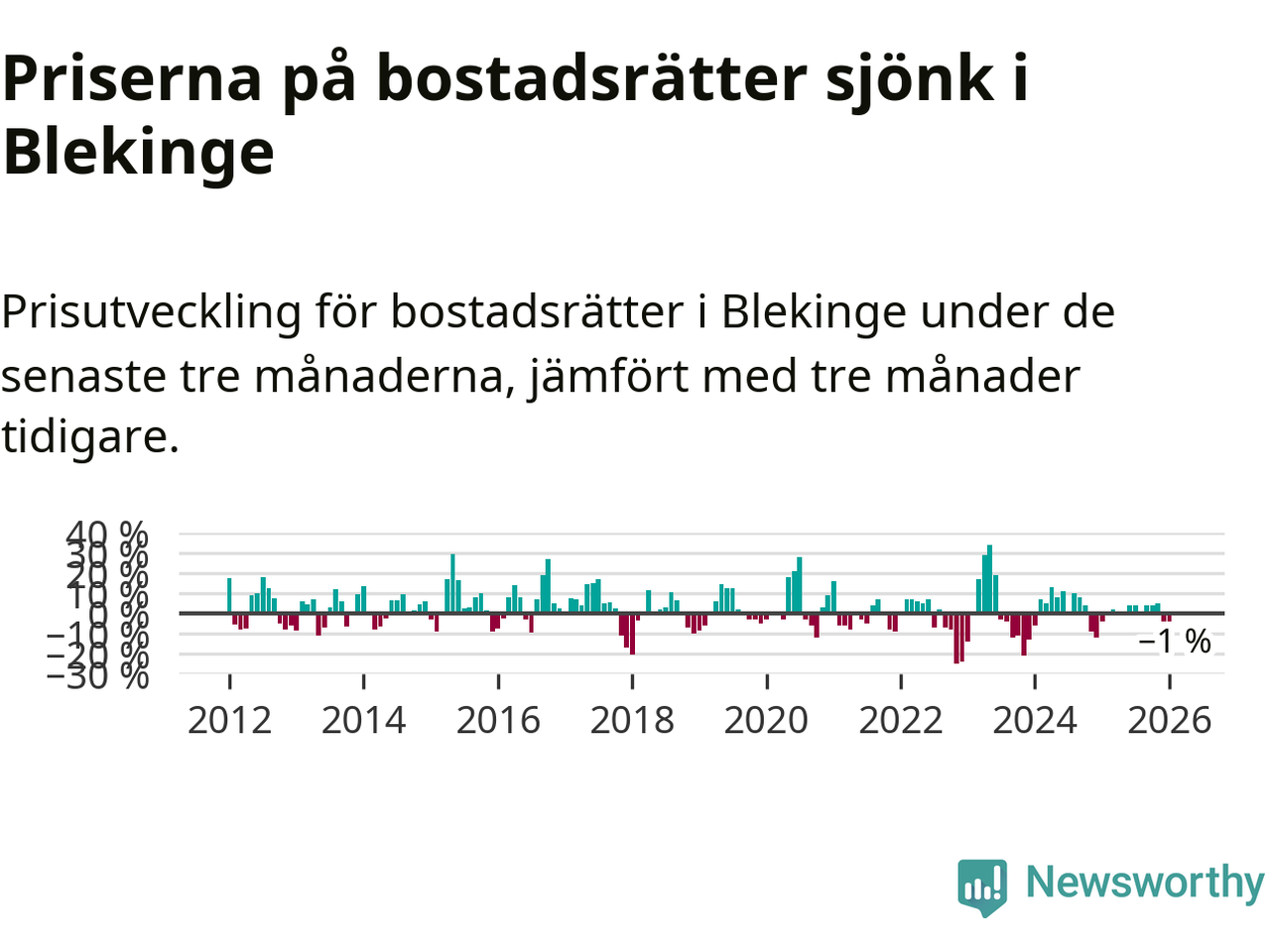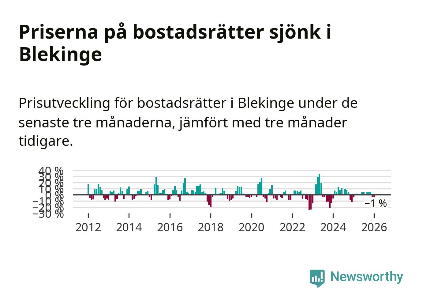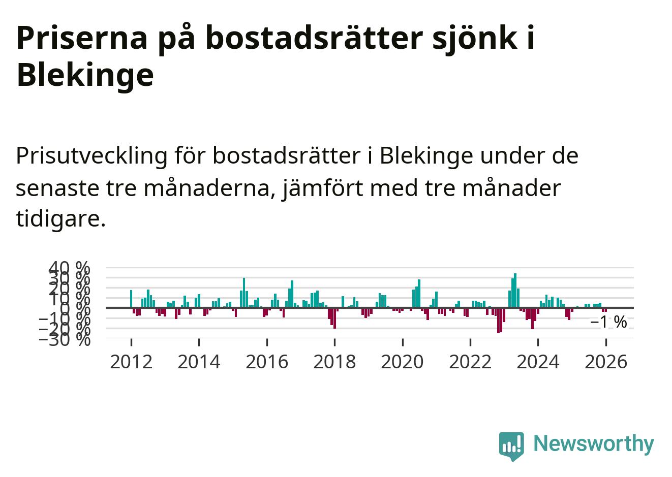 Priserna på bostadsrätter har gått ner i Blekinge län. Medelpriset på försäljningarna under de senaste tre månaderna visar på en nedgång med 1 procent.