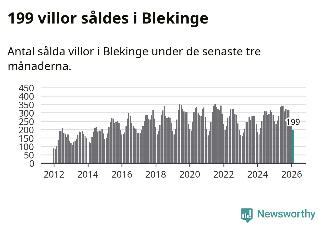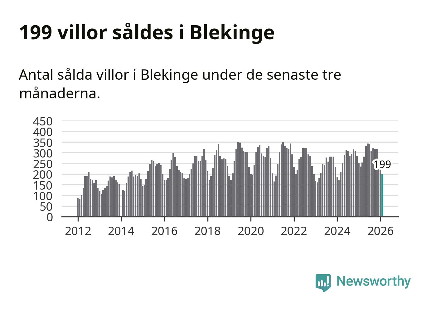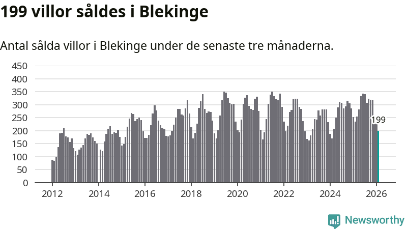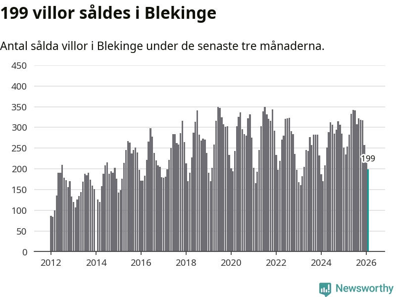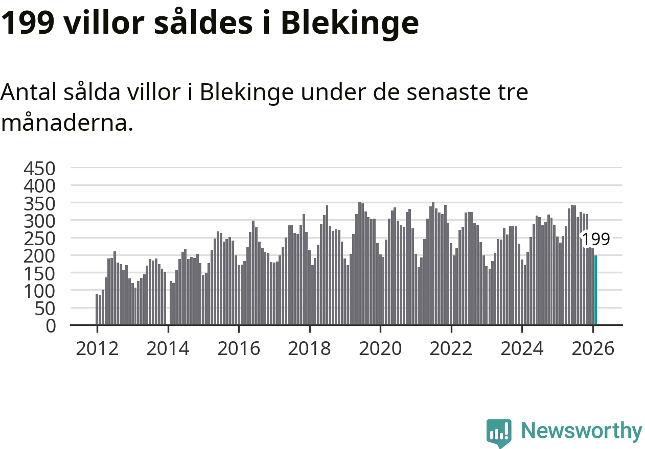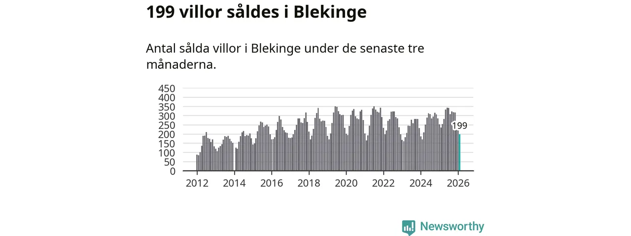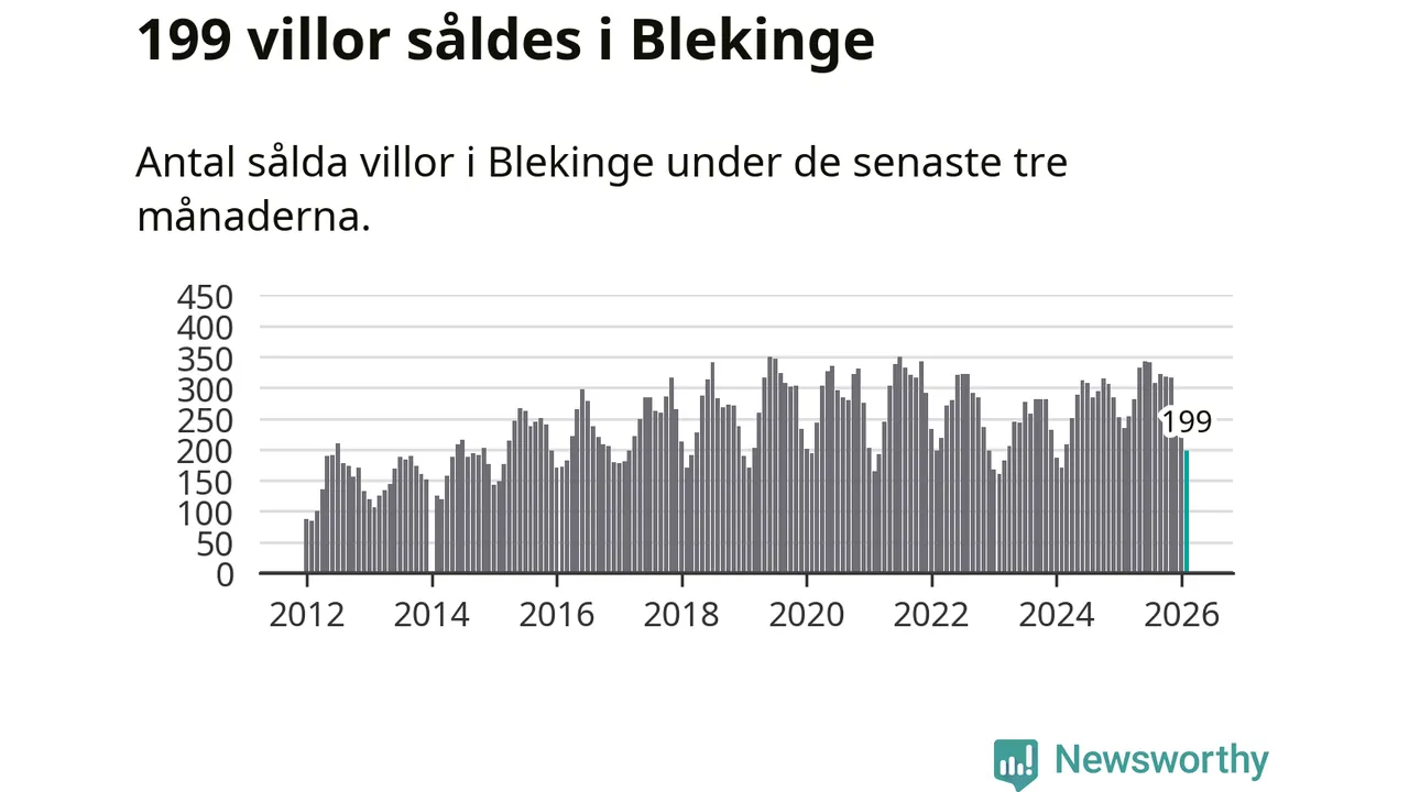 Sammanlagt såldes 199 villor i Blekinge län mellan december och februari till ett genomsnittligt pris på 2,2 miljoner kronor. I fjol gjordes 235 affärer vid den här tiden på året.