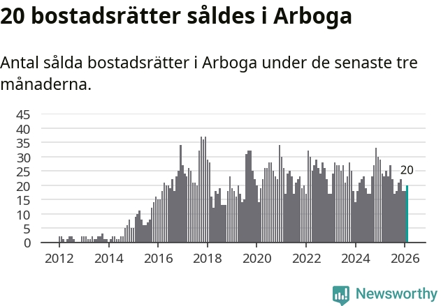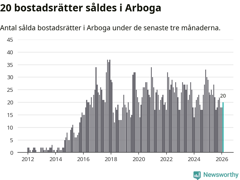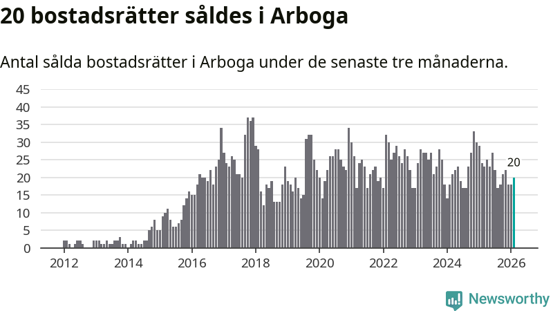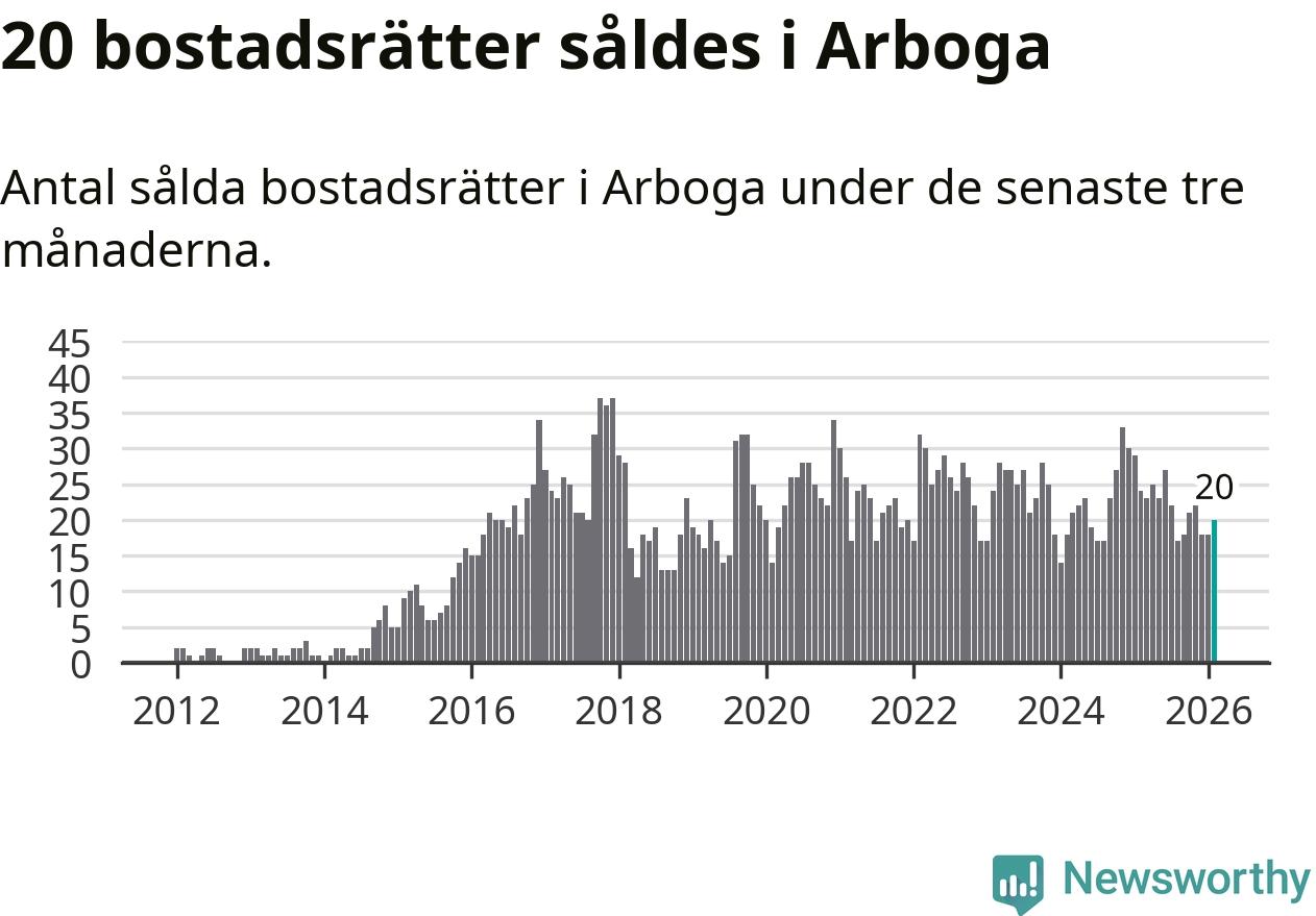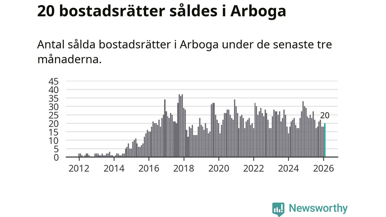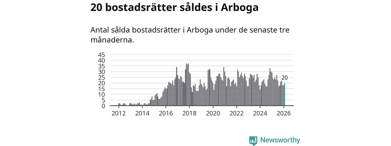 Mellan december och februari gjordes sammanlagt 20 affärer med bostadsrätter i Arboga kommun. Det kan jämföras med 24 vid motsvarande tid i fjol.