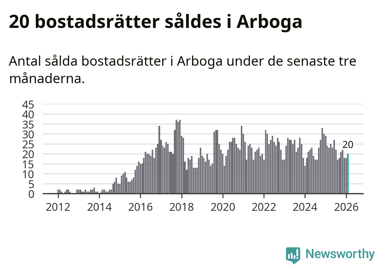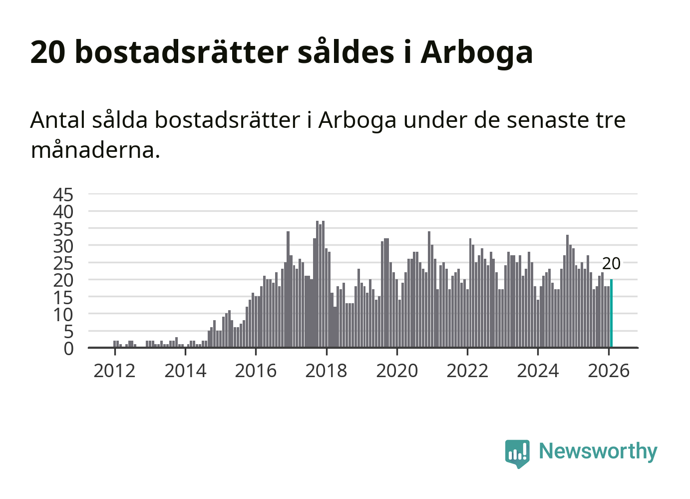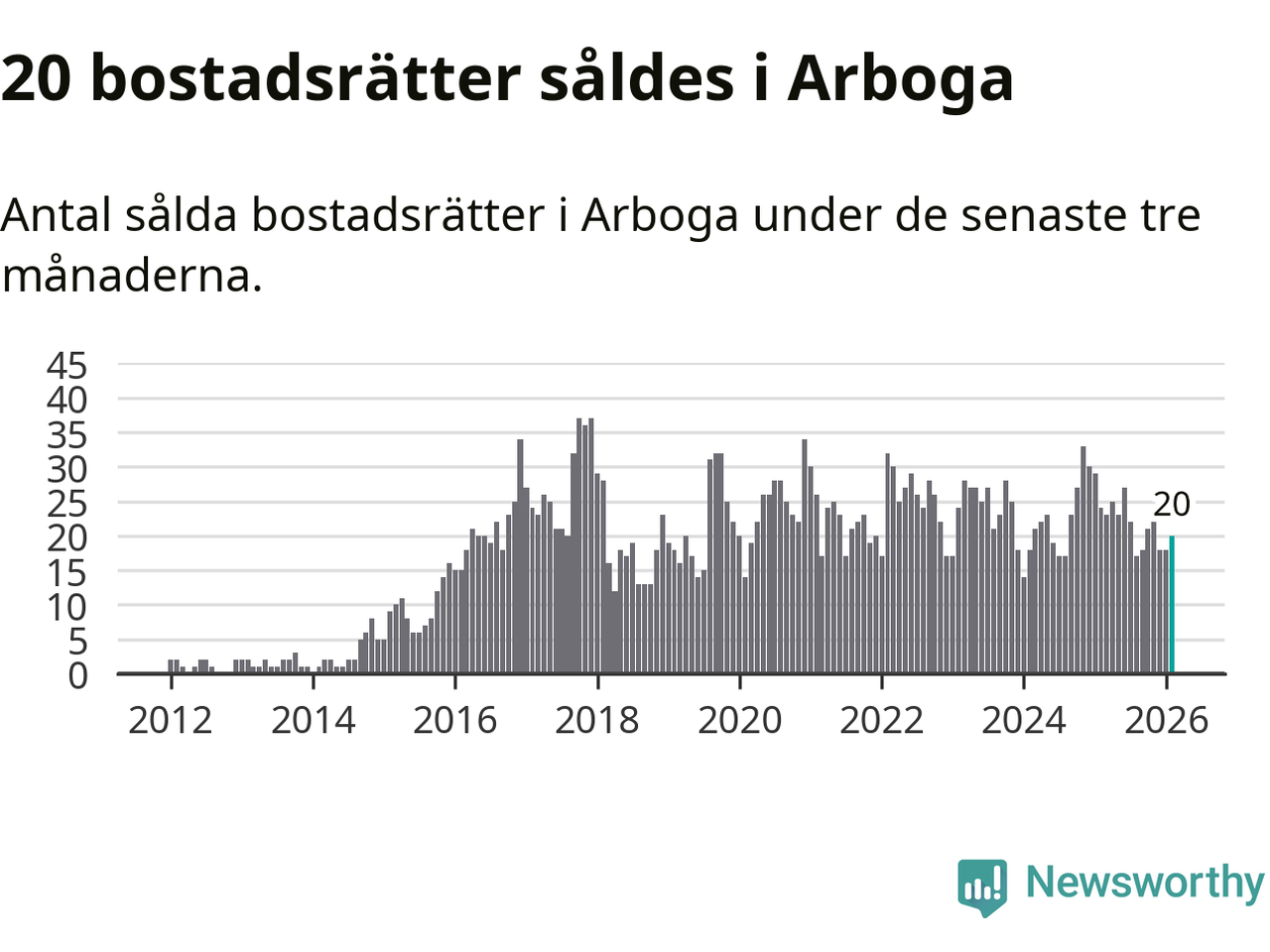 Mellan december och februari gjordes sammanlagt 20 affärer med bostadsrätter i Arboga kommun. Det kan jämföras med 24 vid motsvarande tid i fjol.
