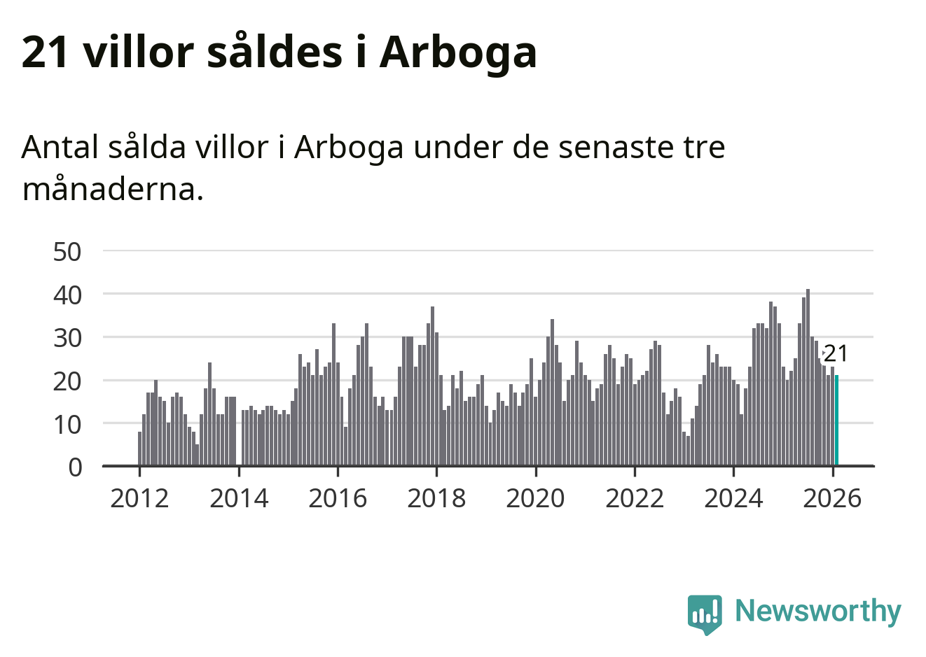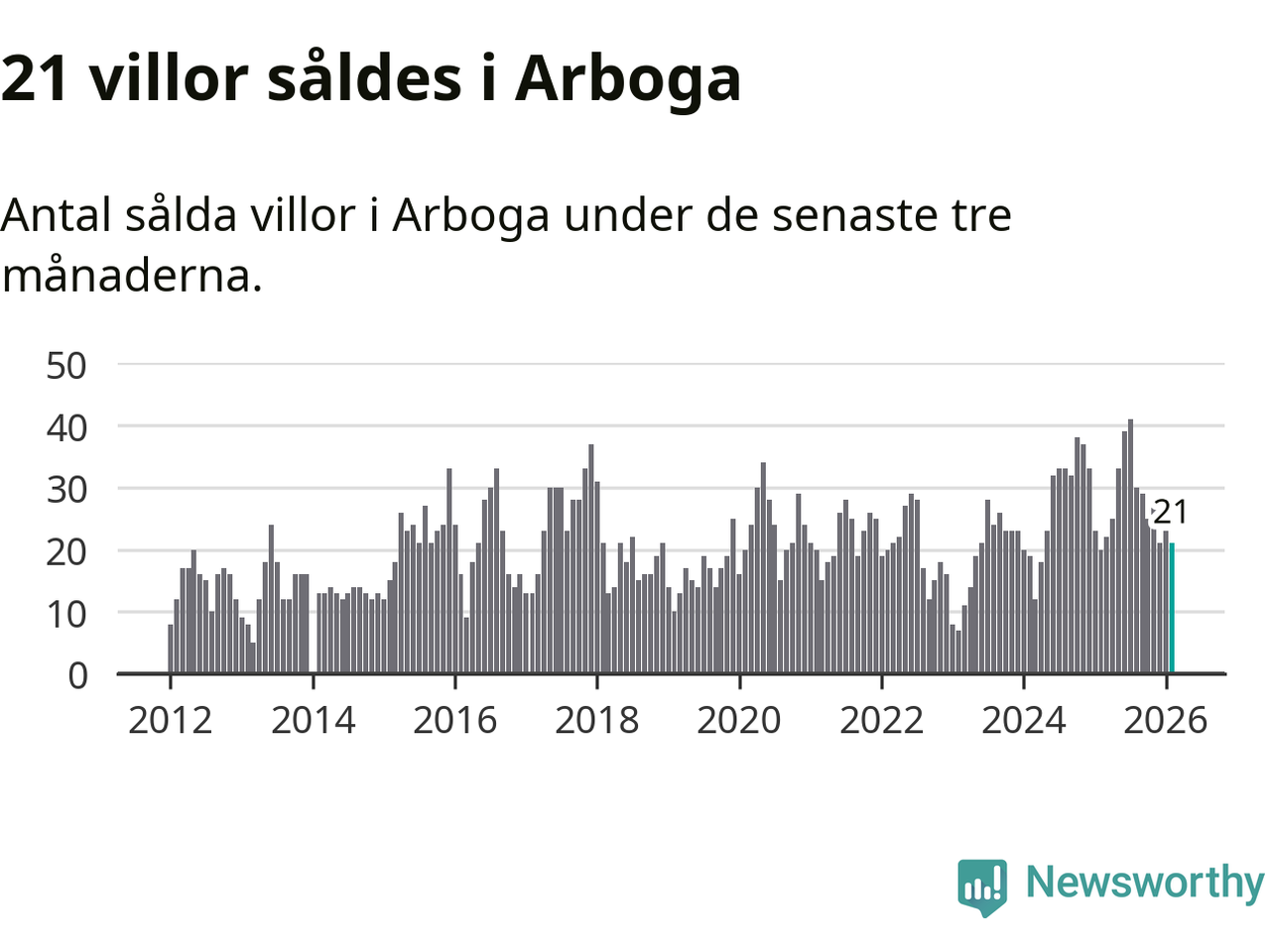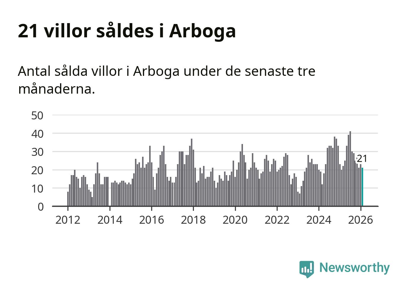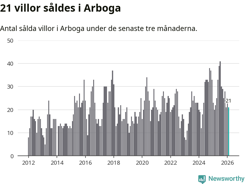 Mellan december och februari gjordes sammanlagt 21 affärer med villor i Arboga kommun. Det kan jämföras med 20 vid motsvarande tid i fjol.