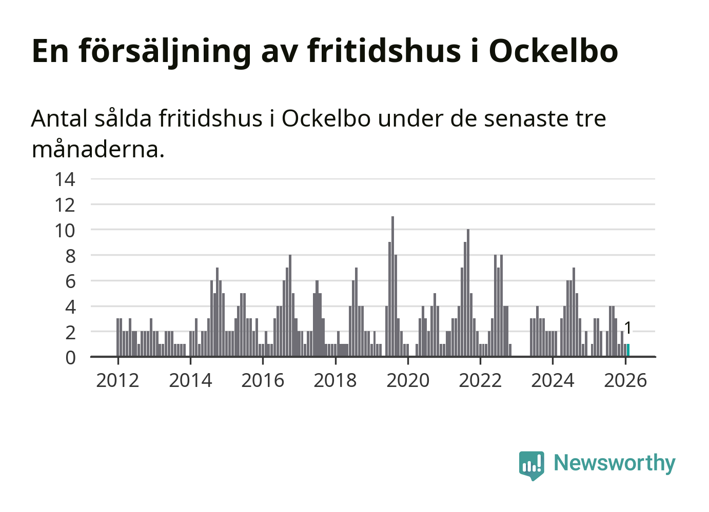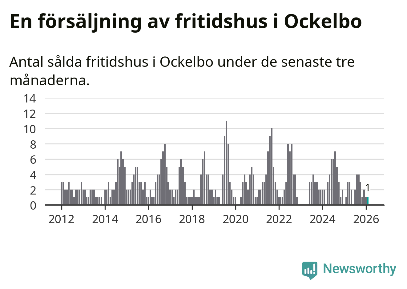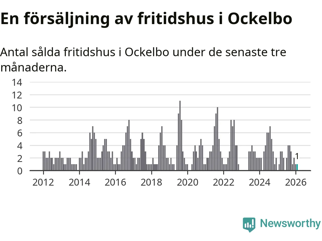Mellan december och februari gjordes sammanlagt en affär med fritidshus i Ockelbo kommun. Det är lika många affärer som vid motsvarande tid i fjol.
