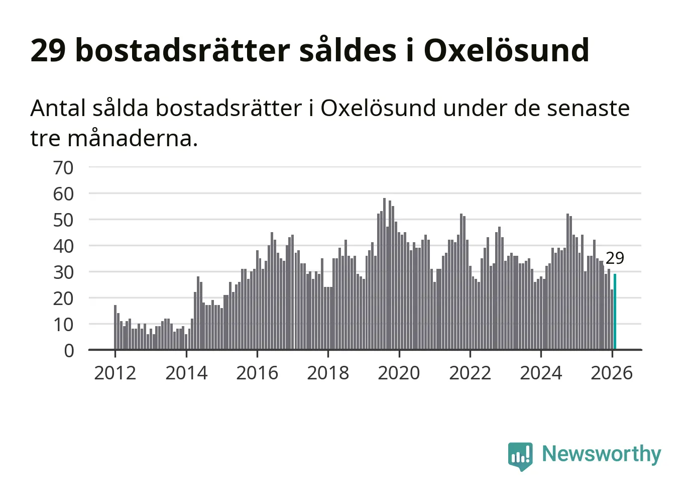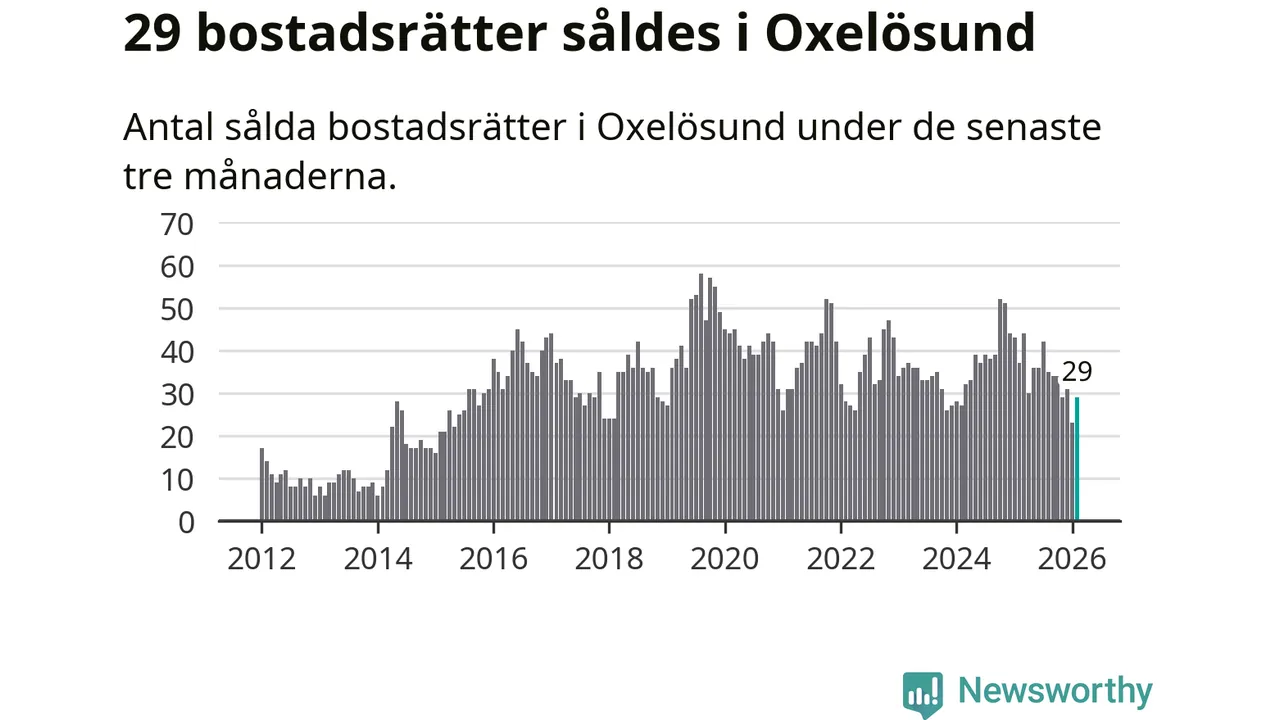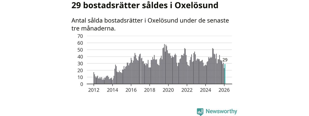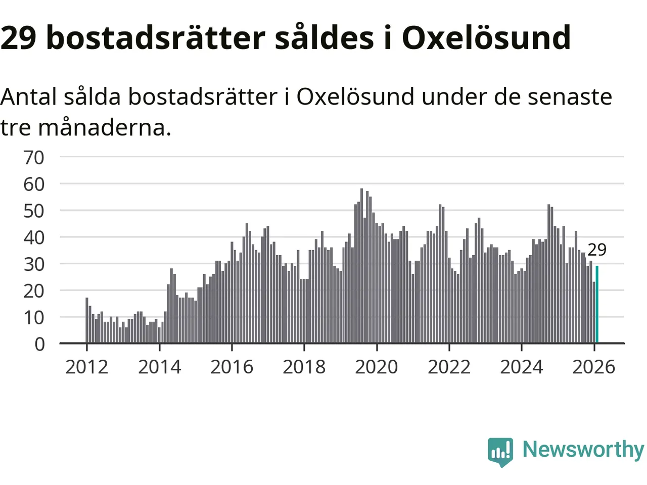 Sammanlagt såldes 29 bostadsrätter i Oxelösunds kommun mellan december och februari till ett genomsnittligt pris på 0,6 miljoner kronor. I fjol gjordes 37 affärer vid den här tiden på året.