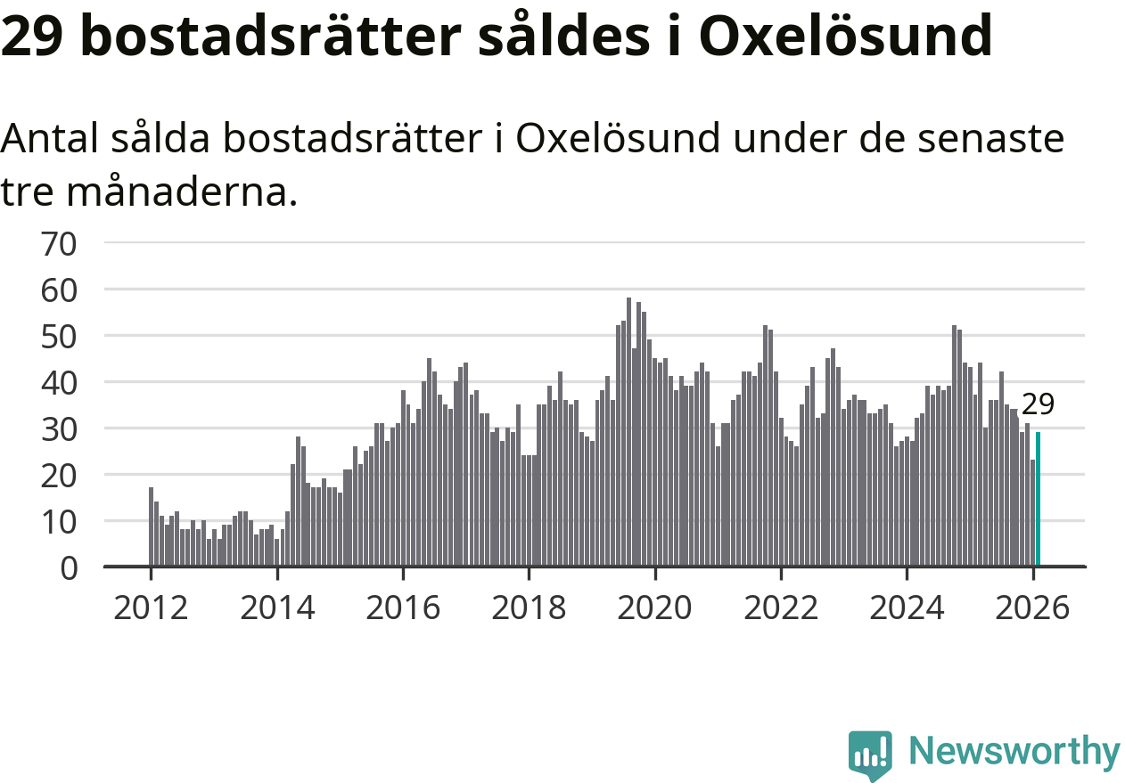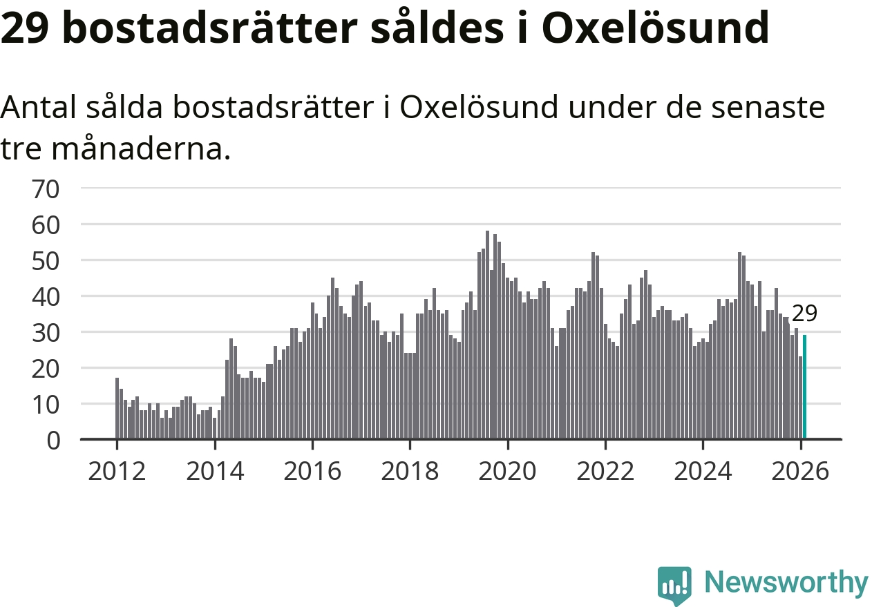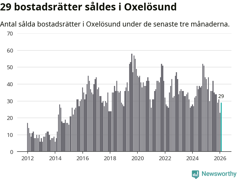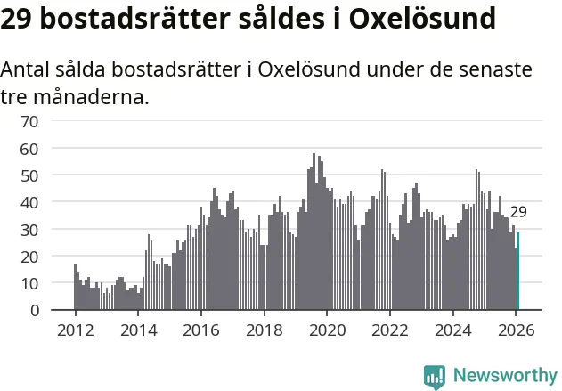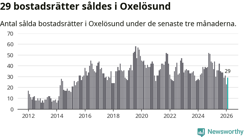 Sammanlagt såldes 29 bostadsrätter i Oxelösunds kommun mellan december och februari till ett genomsnittligt pris på 0,6 miljoner kronor. I fjol gjordes 37 affärer vid den här tiden på året.