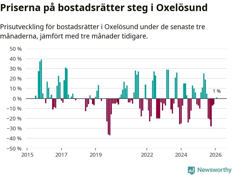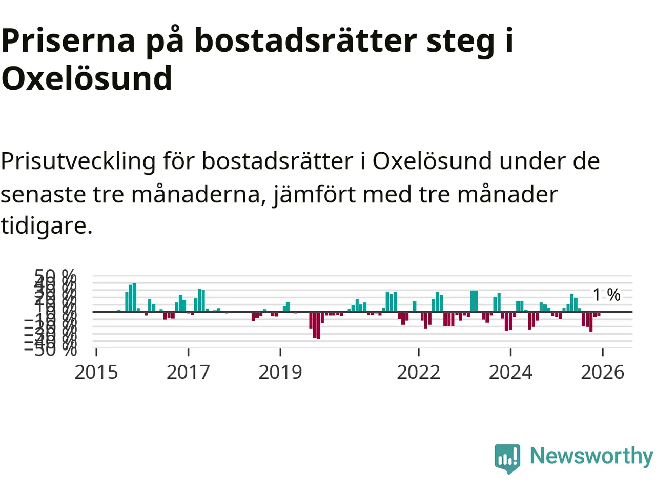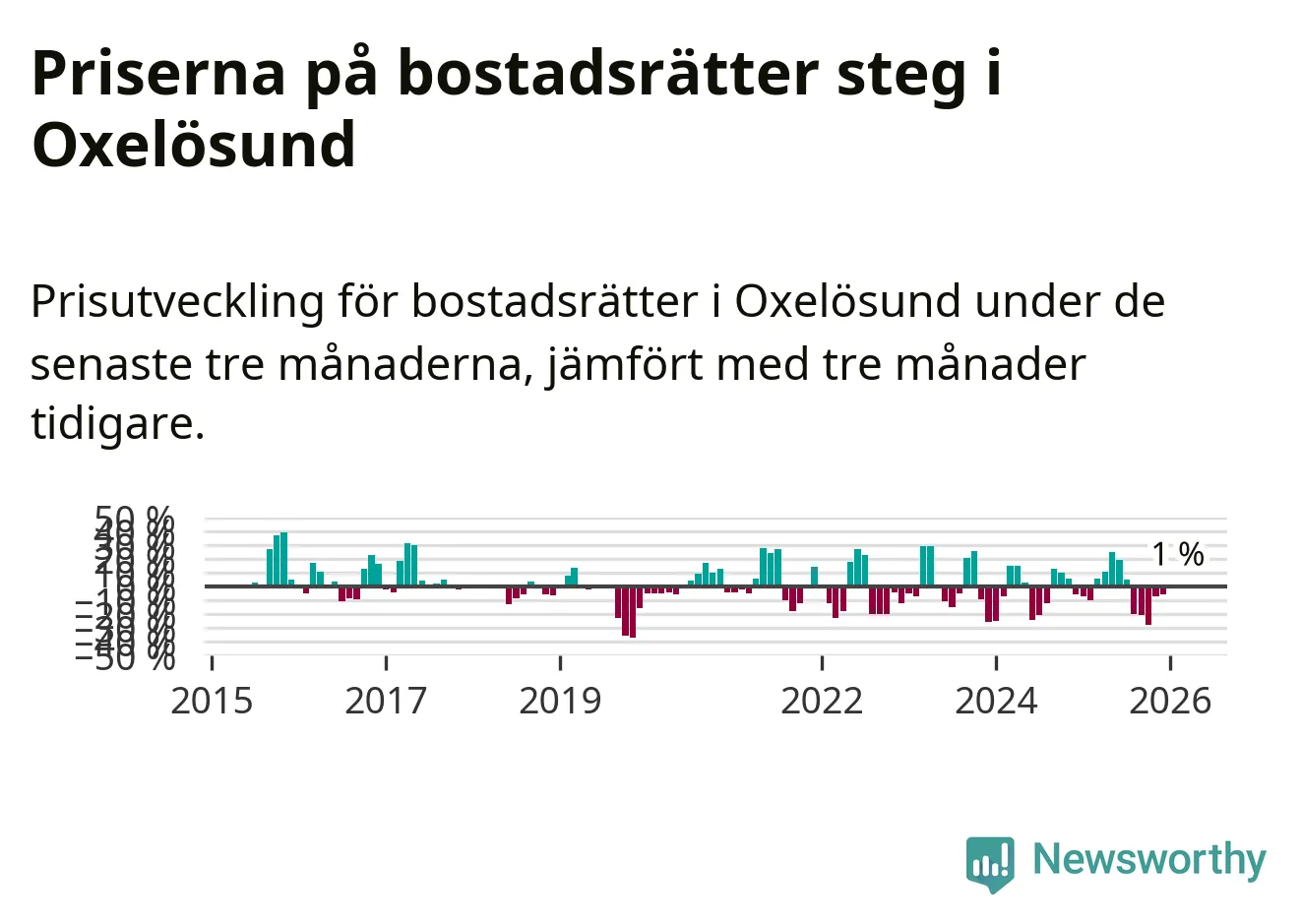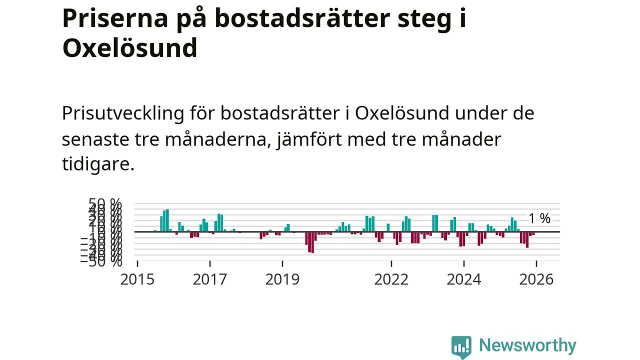 Priserna på bostadsrätter har gått upp i Oxelösunds kommun. Medelpriset på försäljningarna under de senaste tre månaderna visar på en uppgång med 1 procent.