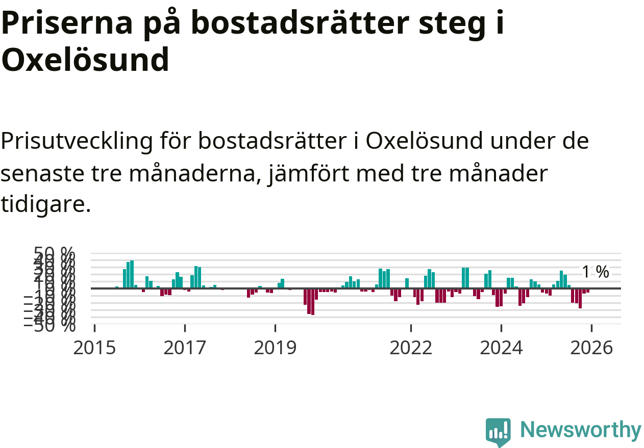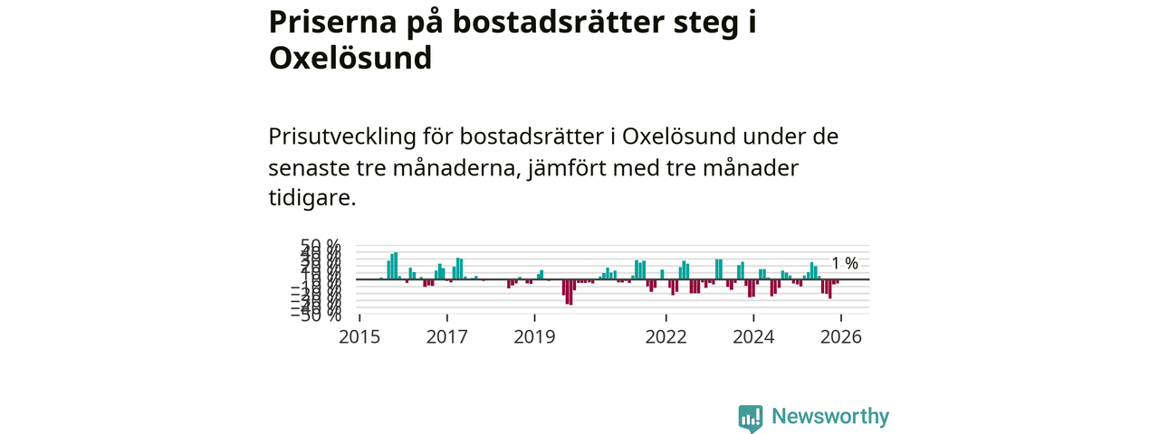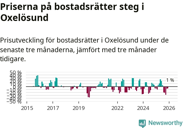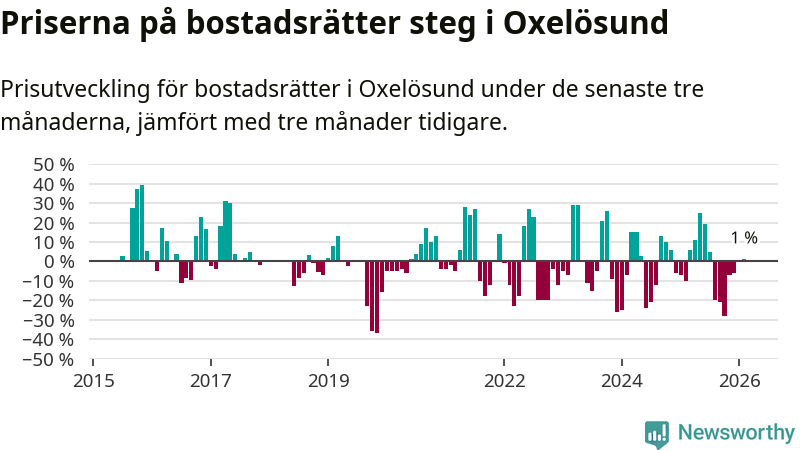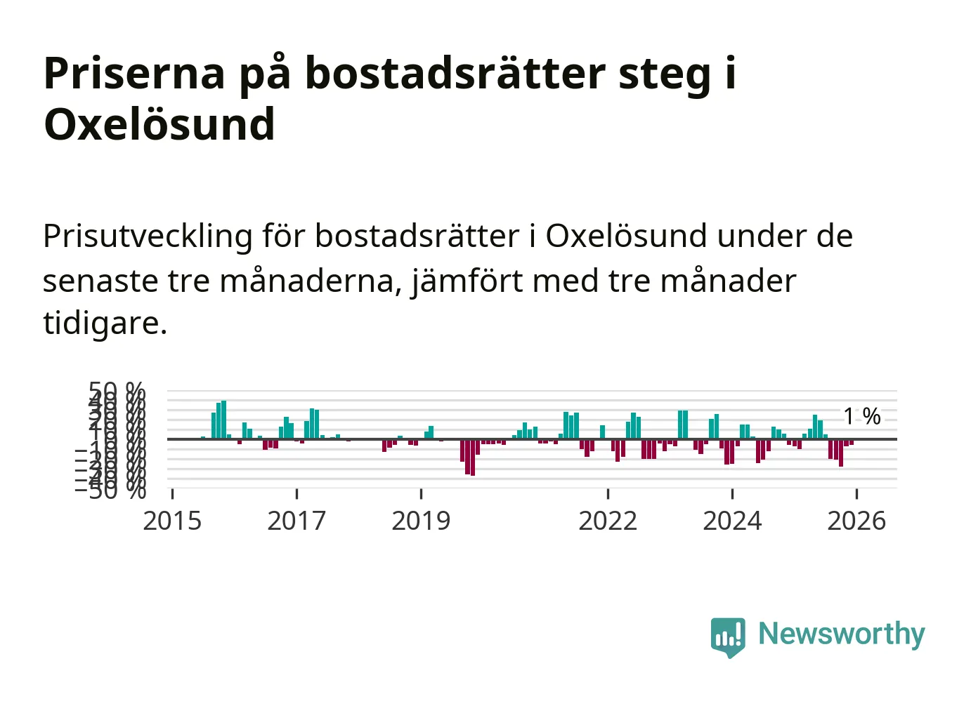 Priserna på bostadsrätter har gått upp i Oxelösunds kommun. Medelpriset på försäljningarna under de senaste tre månaderna visar på en uppgång med 1 procent.