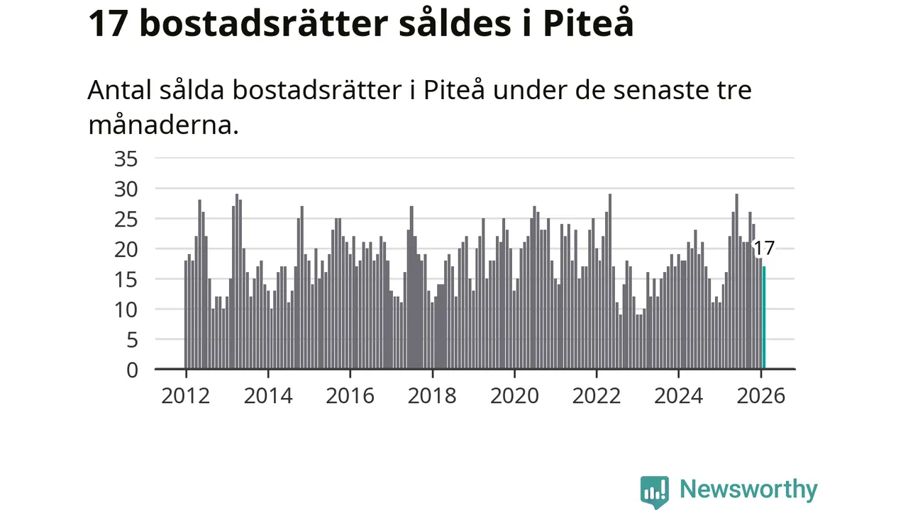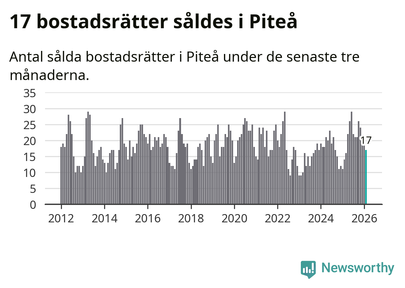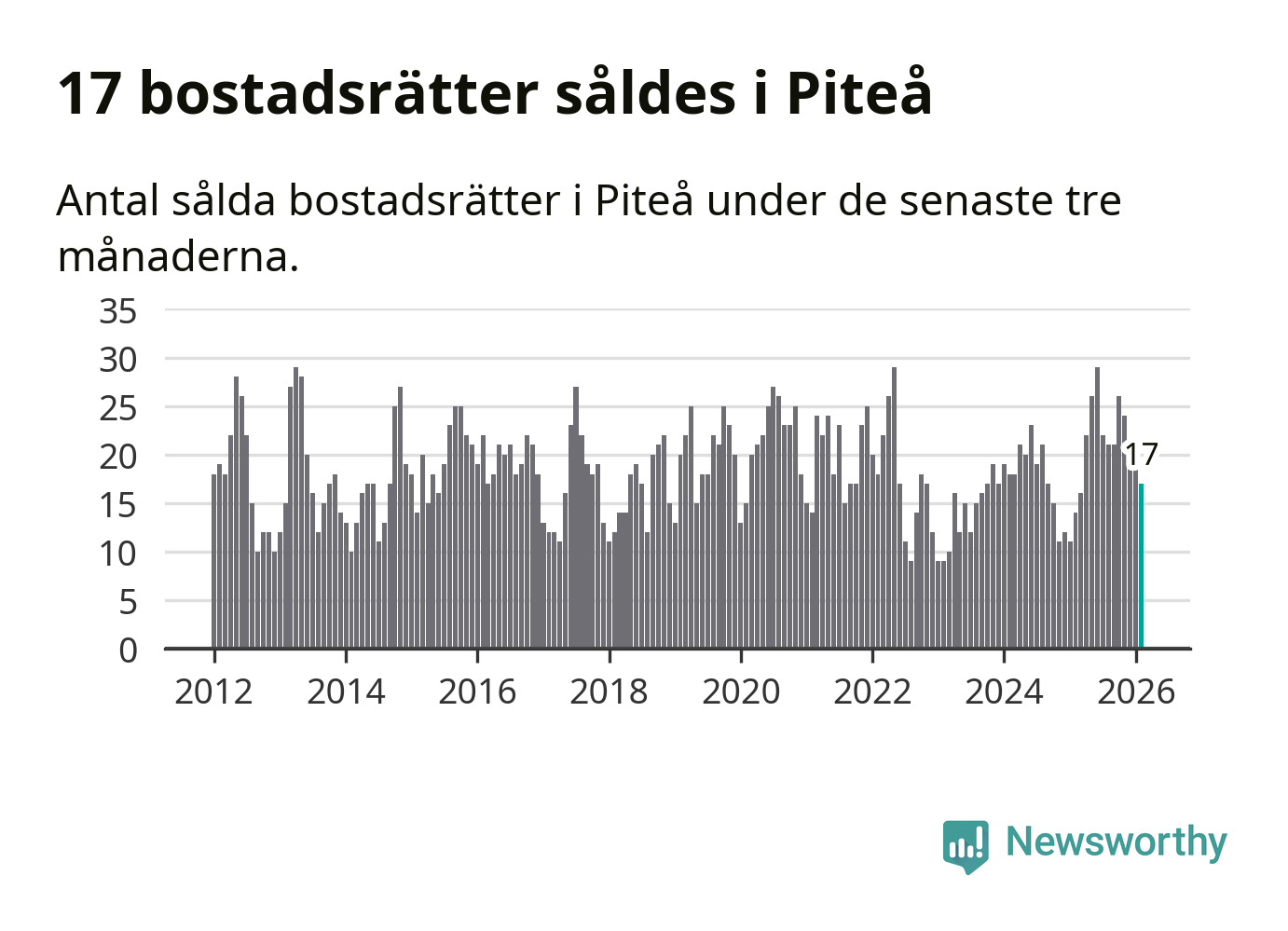 Mellan december och februari gjordes sammanlagt 17 affärer med bostadsrätter i Piteå kommun. Det kan jämföras med 14 vid motsvarande tid i fjol.