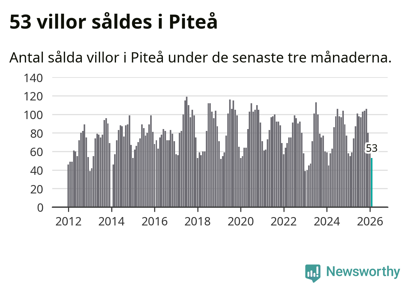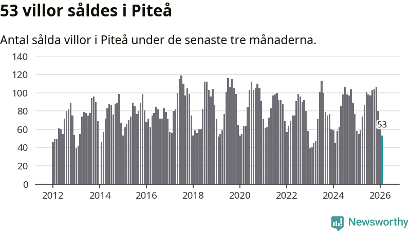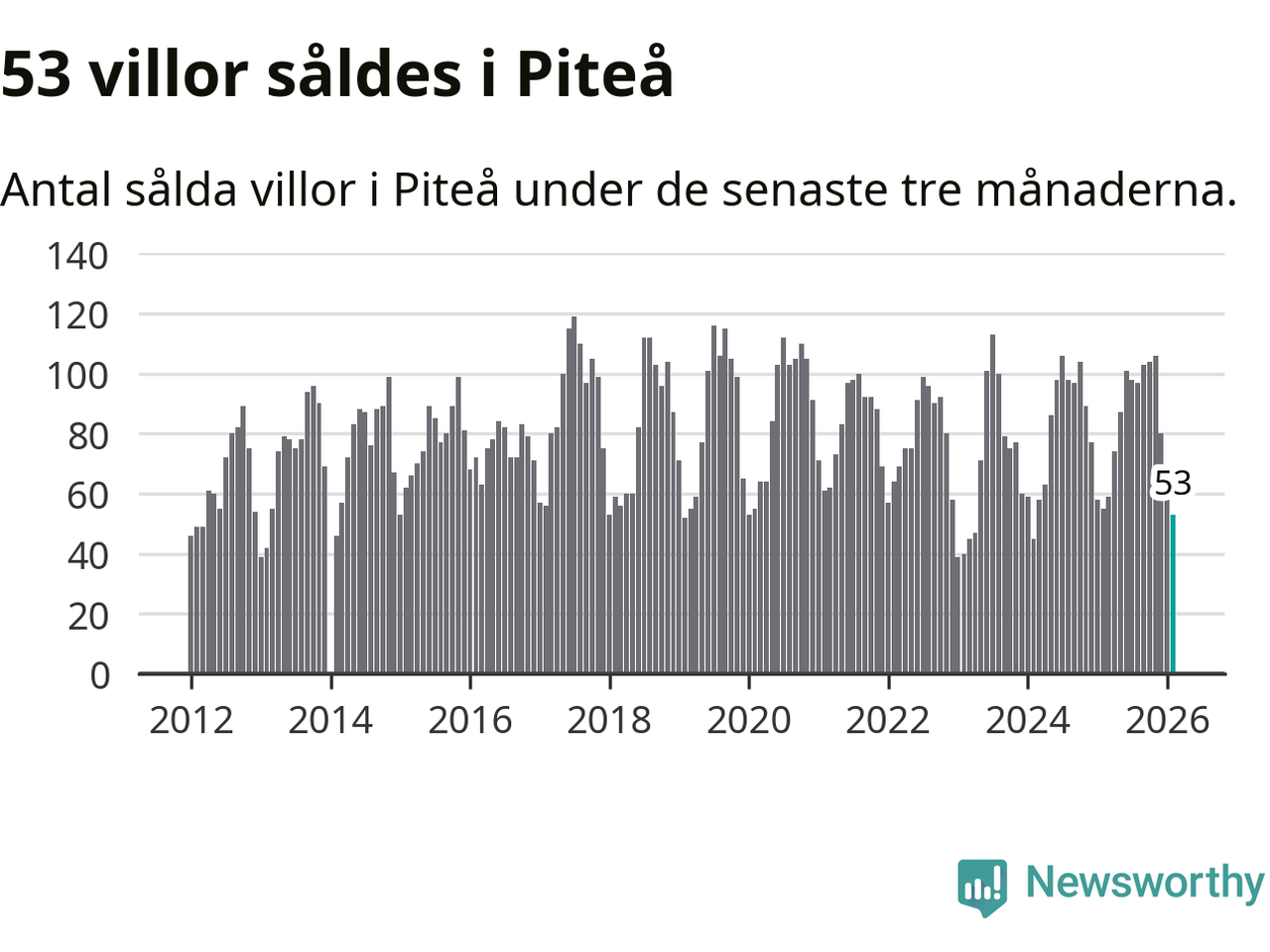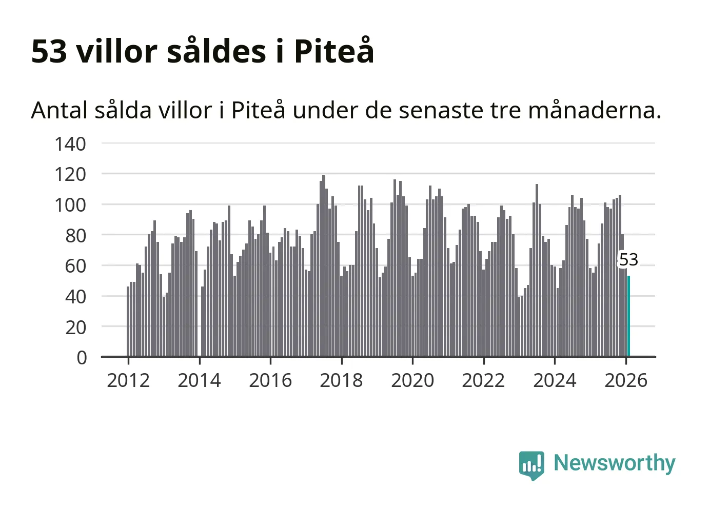 Sammanlagt såldes 53 villor i Piteå kommun mellan december och februari till ett genomsnittligt pris på 2,5 miljoner kronor. I fjol gjordes 55 affärer vid den här tiden på året.