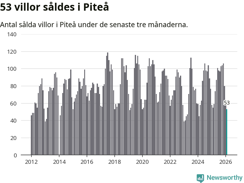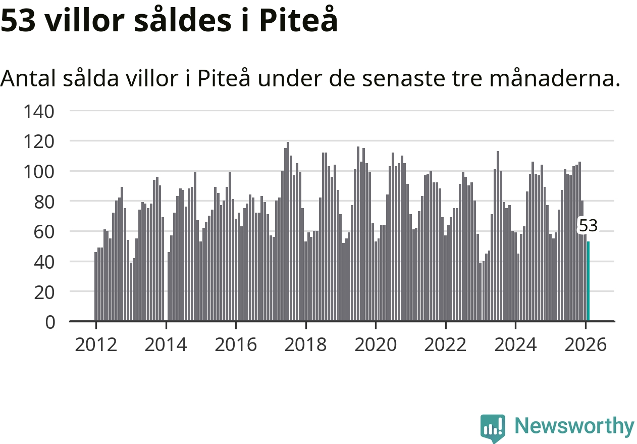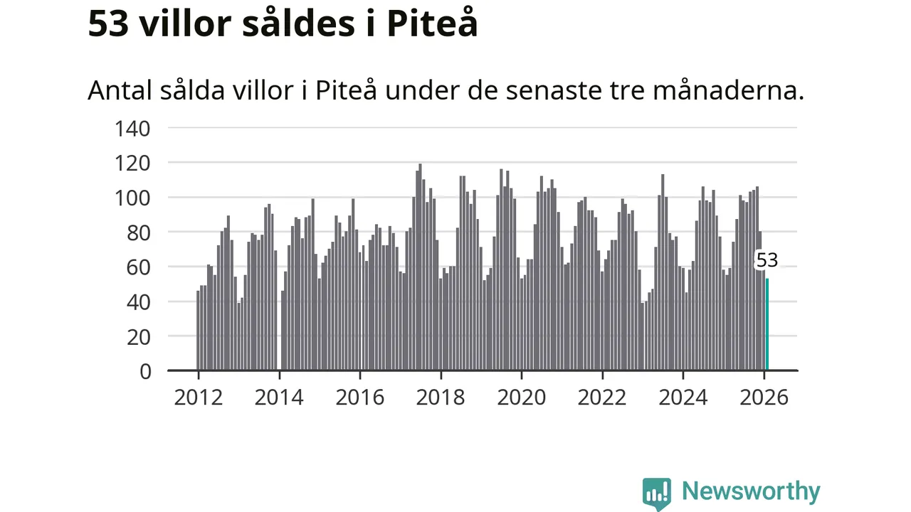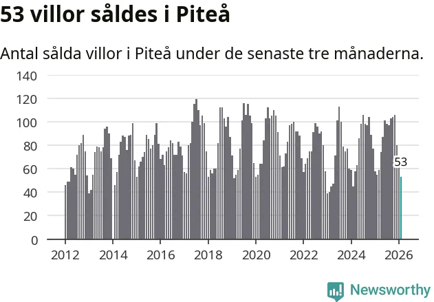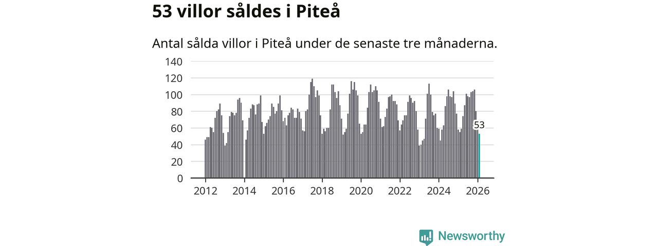 Sammanlagt såldes 53 villor i Piteå kommun mellan december och februari till ett genomsnittligt pris på 2,5 miljoner kronor. I fjol gjordes 55 affärer vid den här tiden på året.