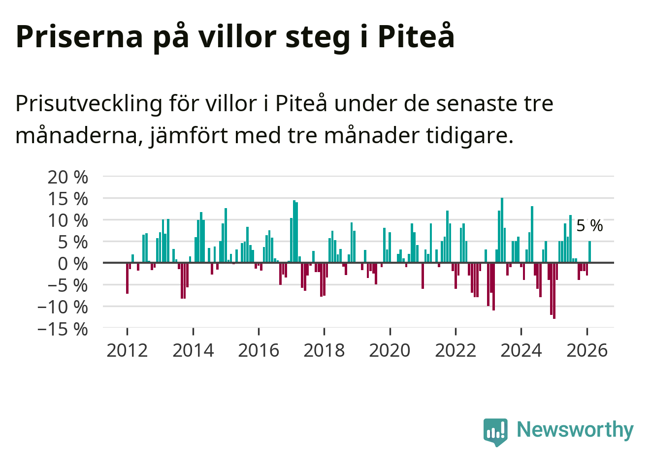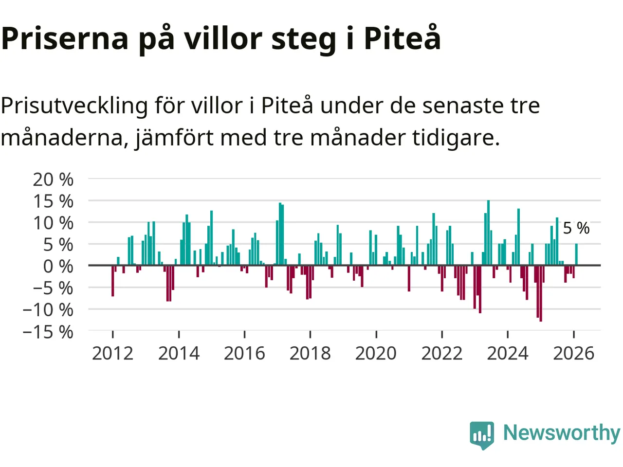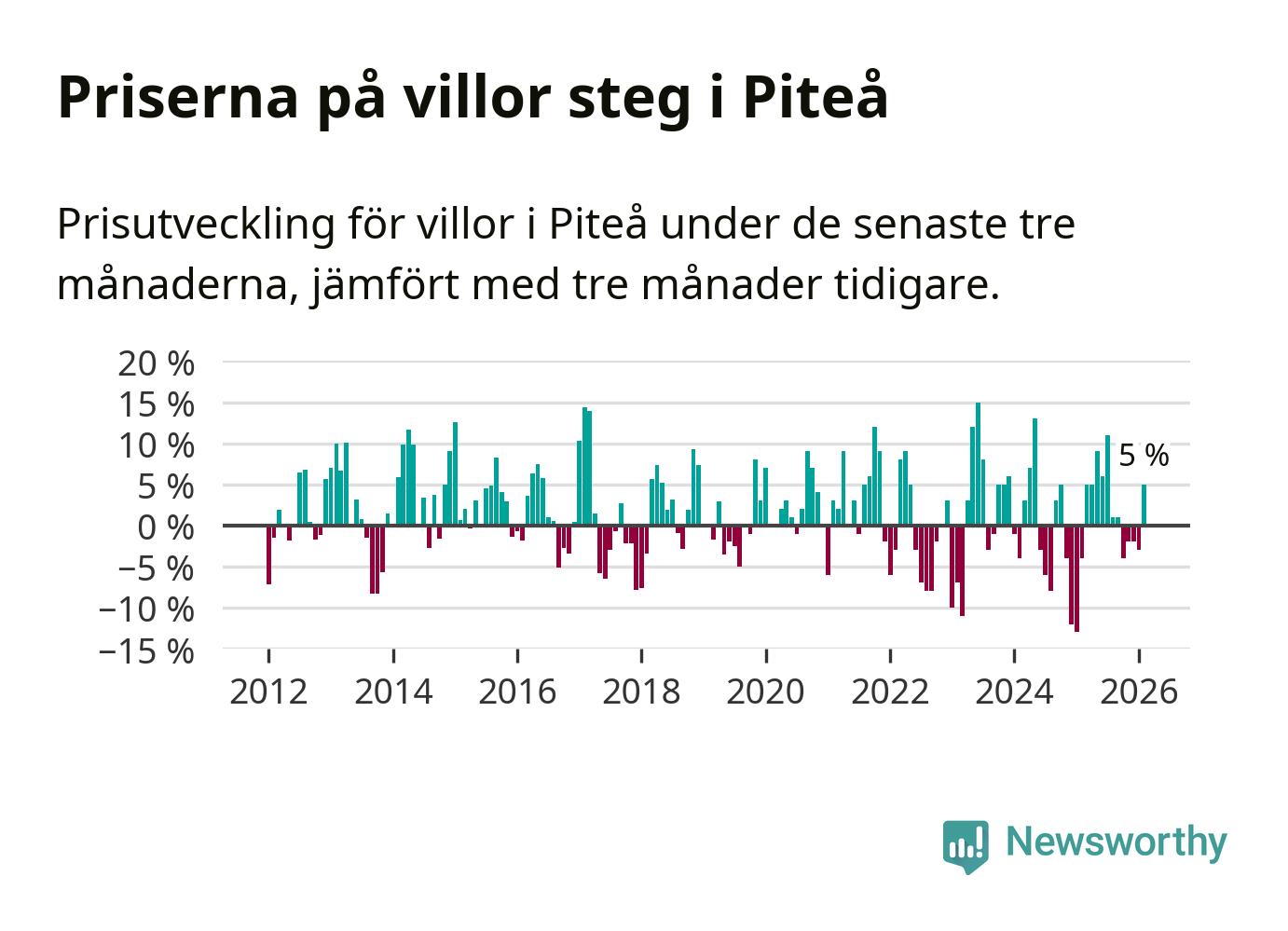 Villapriserna har gått upp i Piteå kommun. Medelpriset på försäljningarna under de senaste tre månaderna visar på en uppgång med 5 procent.