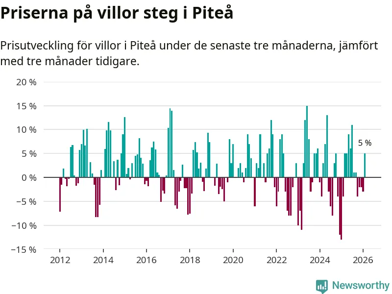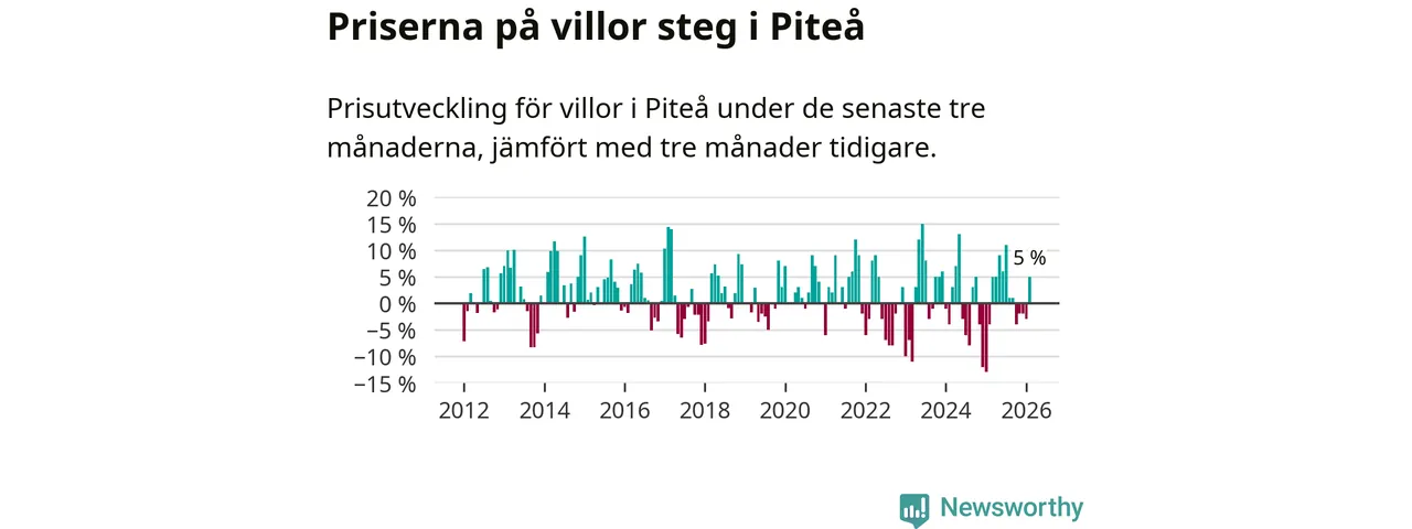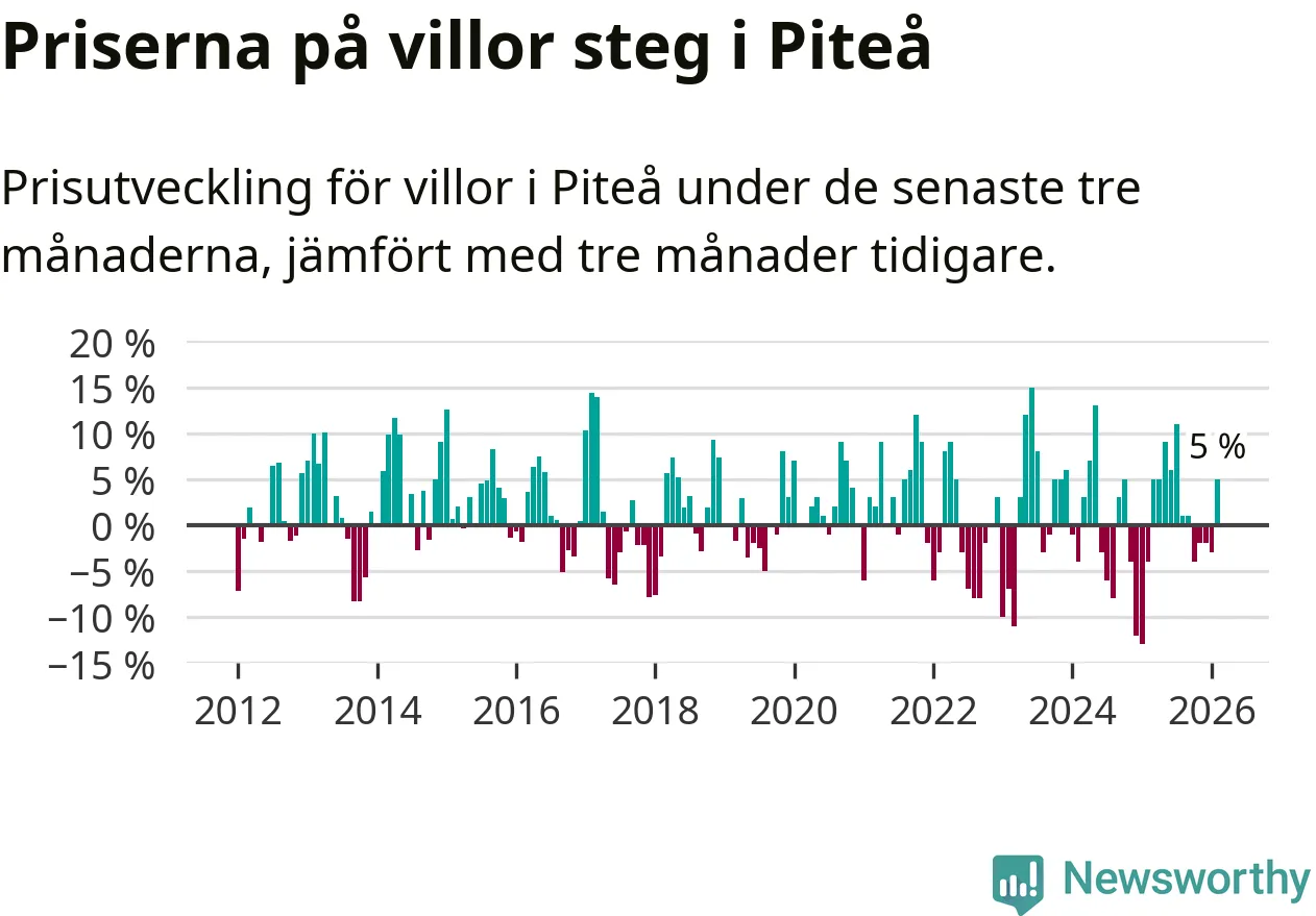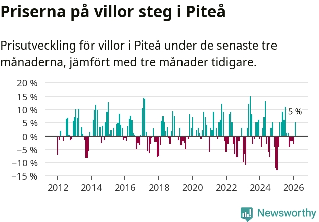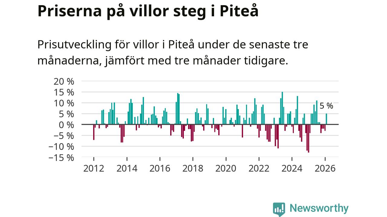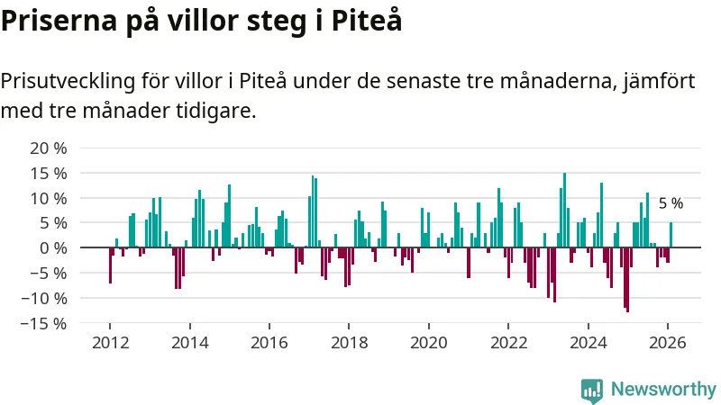 Villapriserna har gått upp i Piteå kommun. Medelpriset på försäljningarna under de senaste tre månaderna visar på en uppgång med 5 procent.