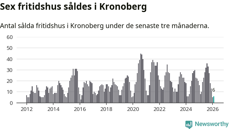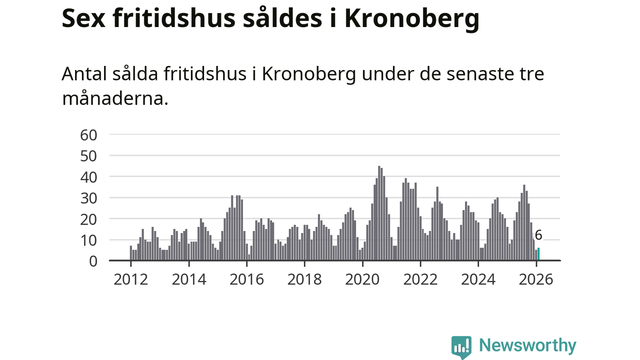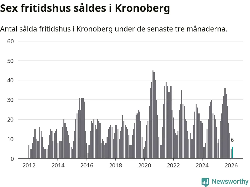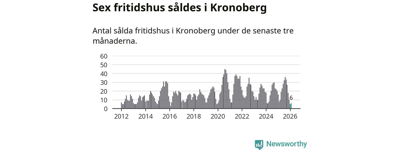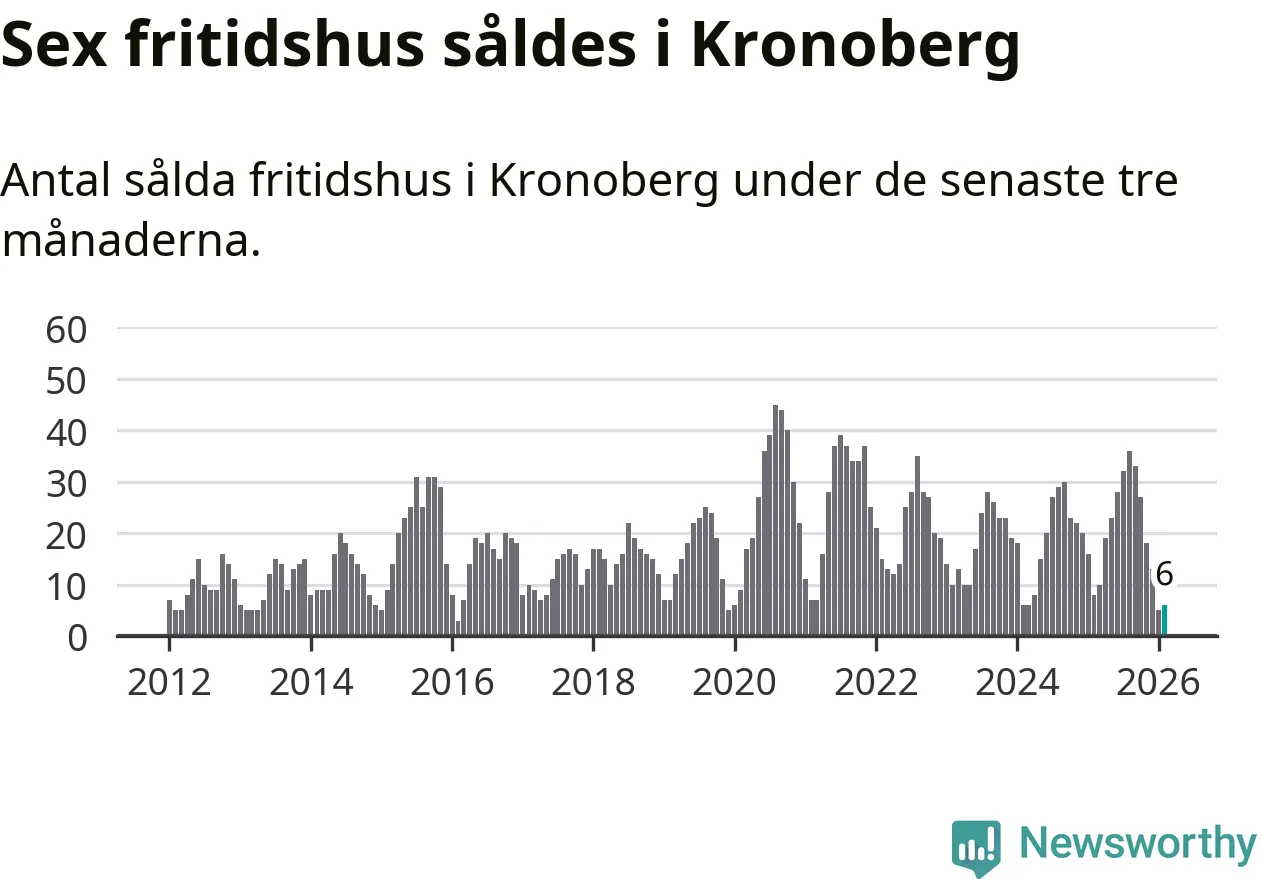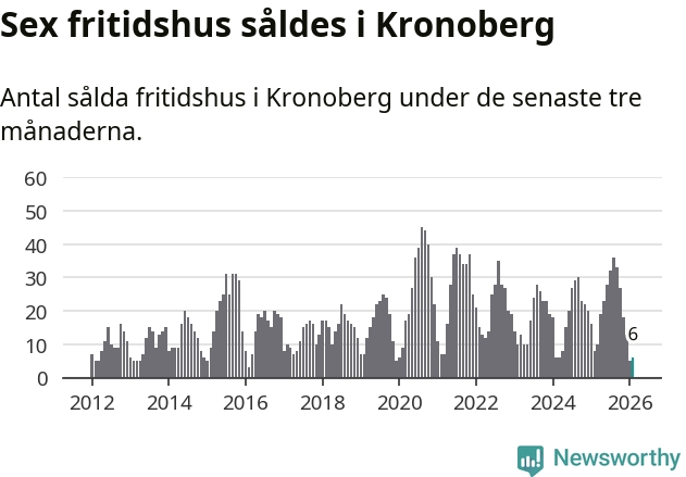 Sammanlagt såldes sex fritidshus i Kronobergs län mellan december 2025 och februari till ett genomsnittligt pris på 1,4 miljoner kronor. I fjol gjordes åtta affärer vid den här tiden på året.