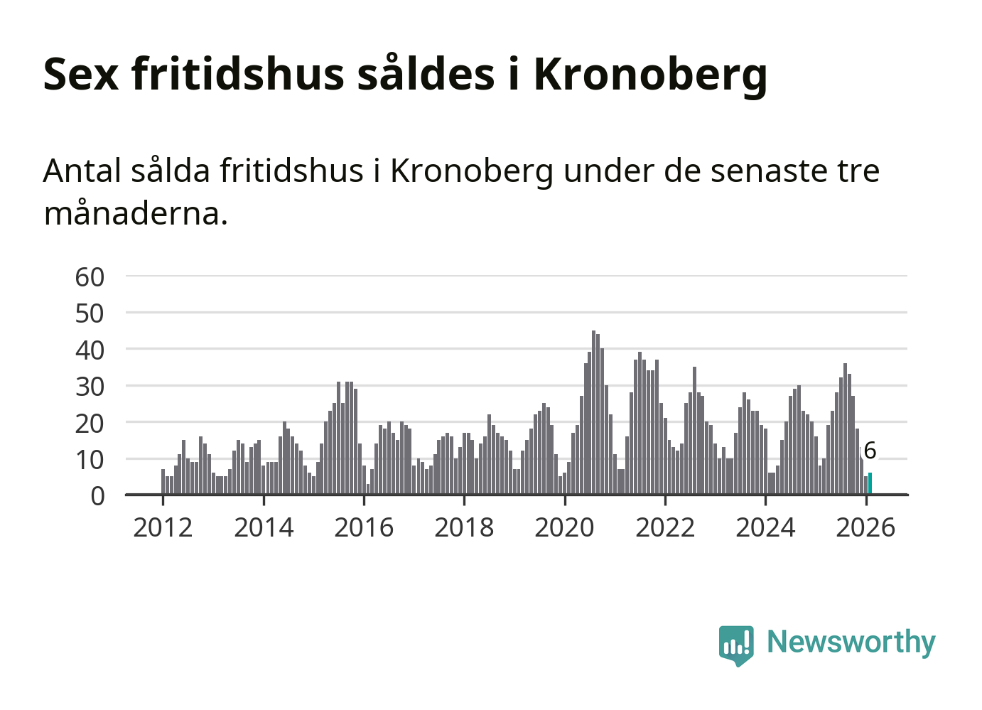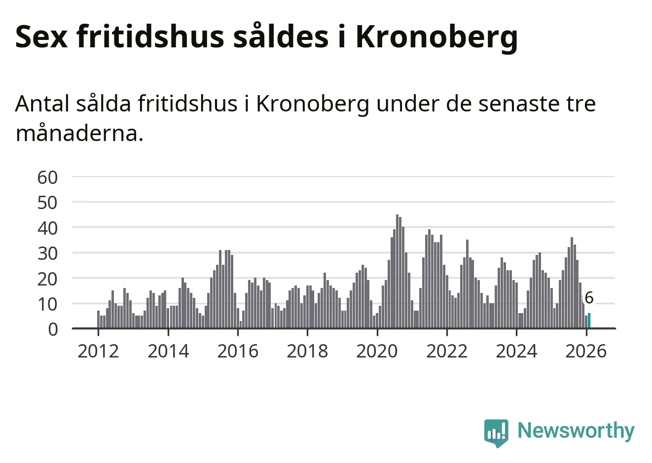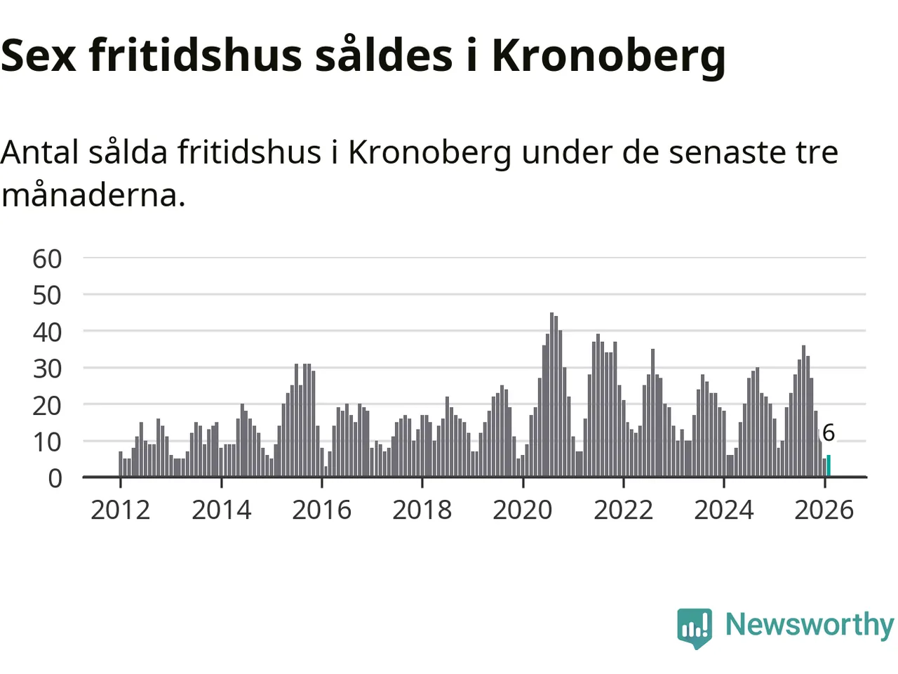 Sammanlagt såldes sex fritidshus i Kronobergs län mellan december 2025 och februari till ett genomsnittligt pris på 1,4 miljoner kronor. I fjol gjordes åtta affärer vid den här tiden på året.