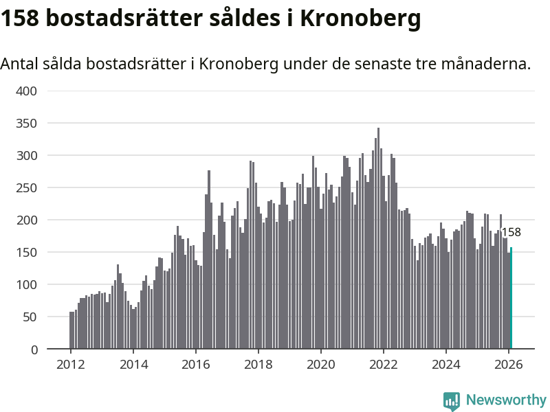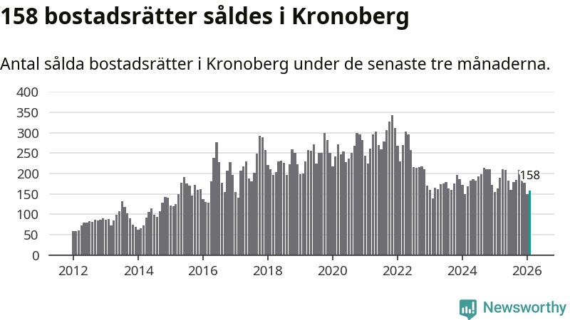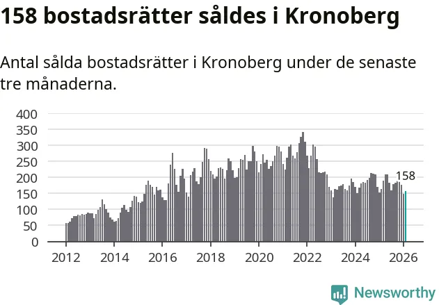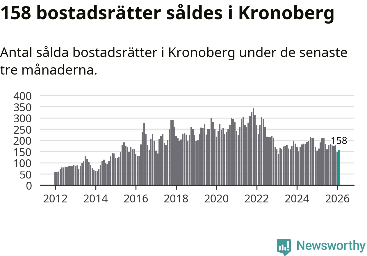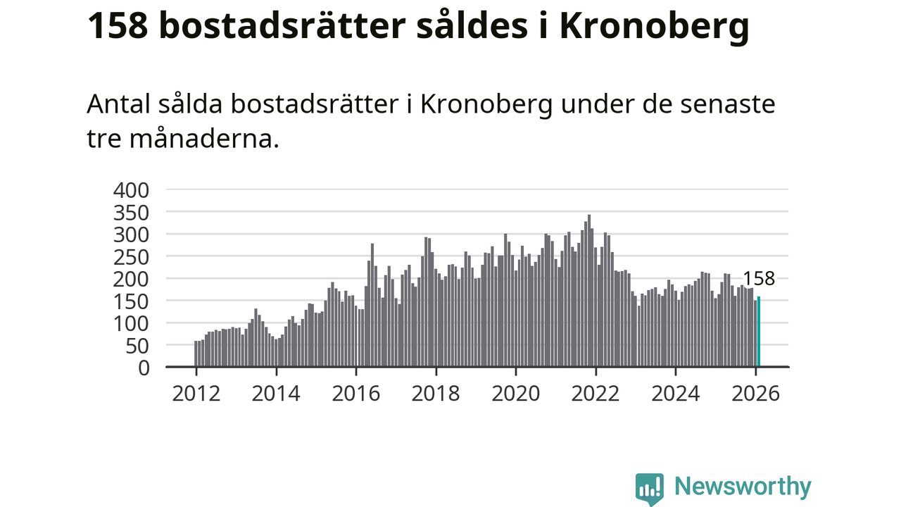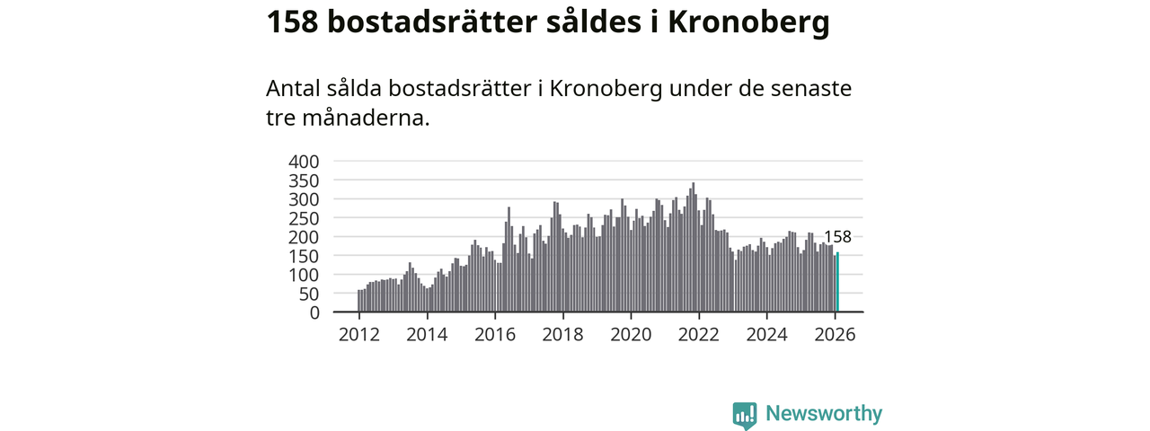 Sammanlagt såldes 158 bostadsrätter i Kronobergs län mellan december och februari till ett genomsnittligt pris på 1,6 miljoner kronor. I fjol gjordes 163 affärer vid den här tiden på året.
