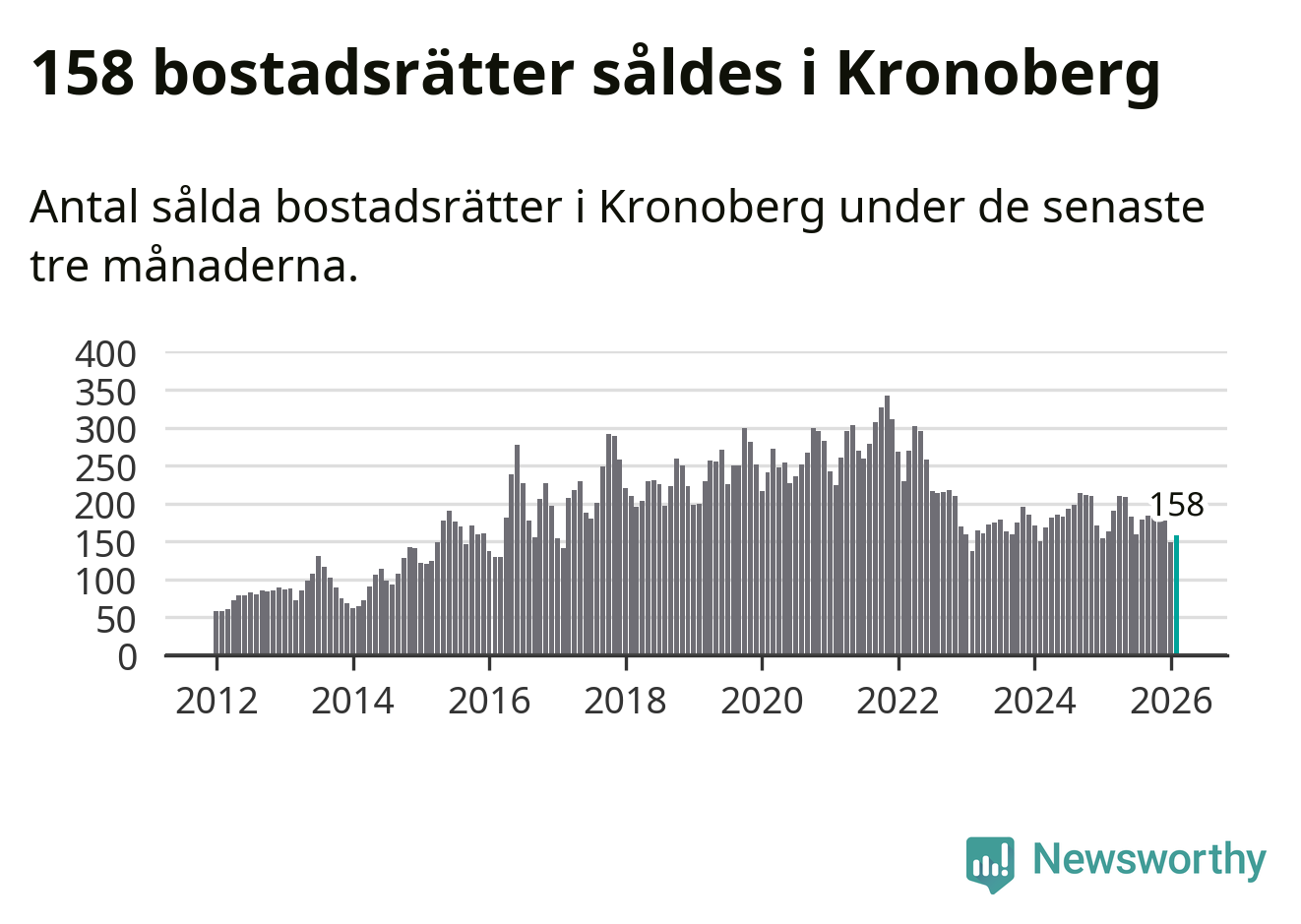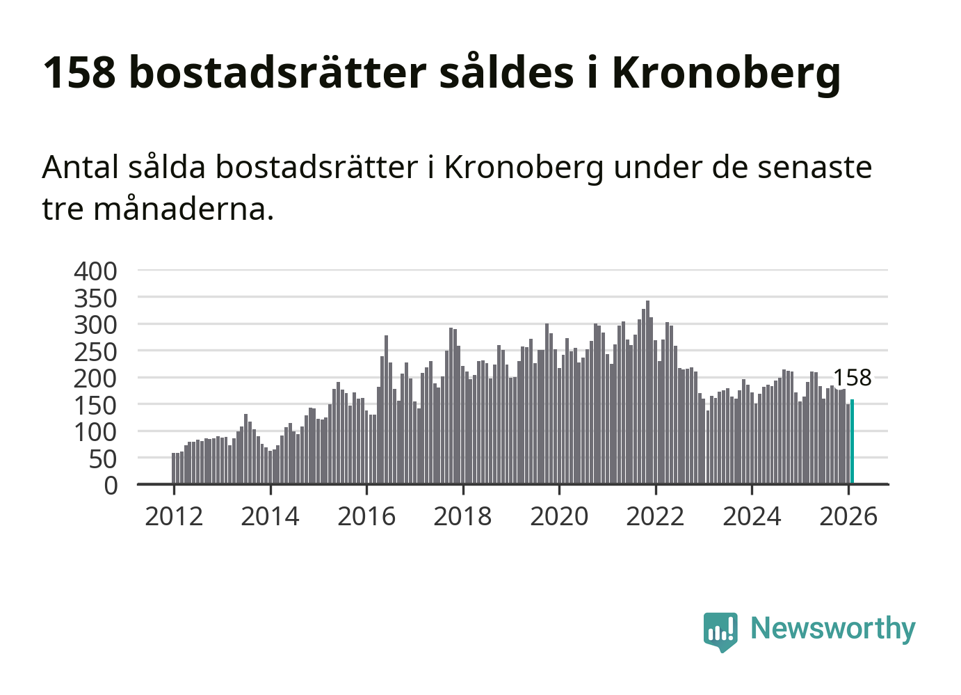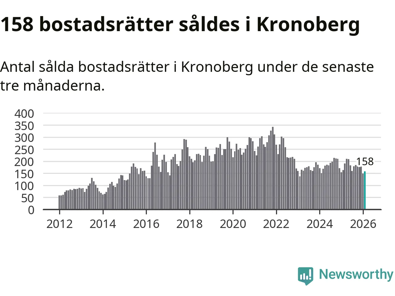 Sammanlagt såldes 158 bostadsrätter i Kronobergs län mellan december och februari till ett genomsnittligt pris på 1,6 miljoner kronor. I fjol gjordes 163 affärer vid den här tiden på året.