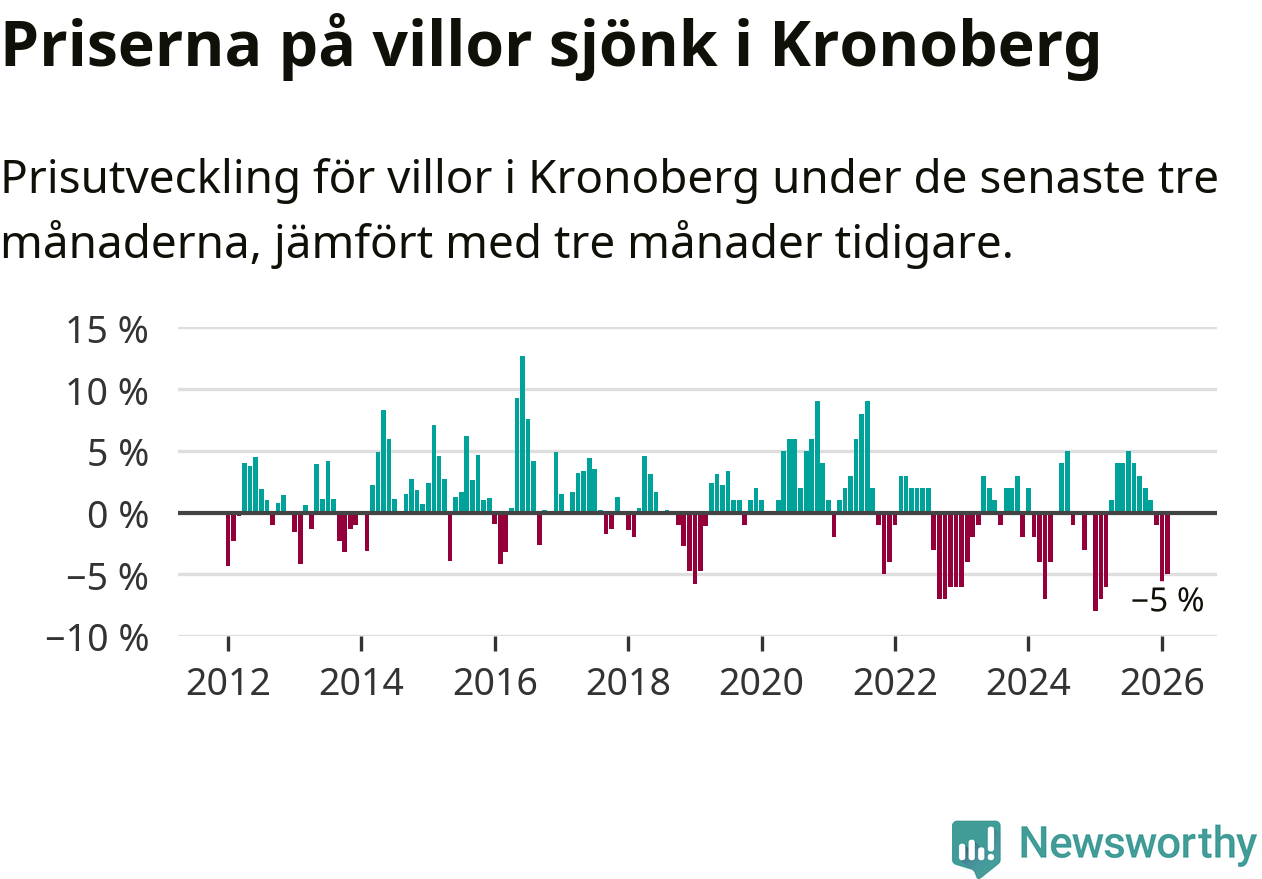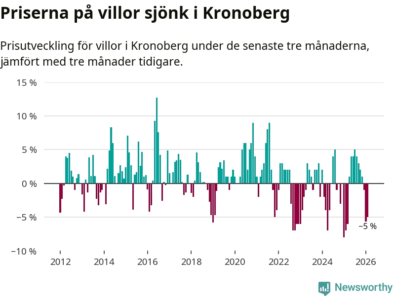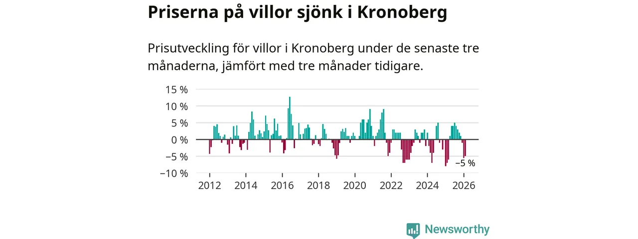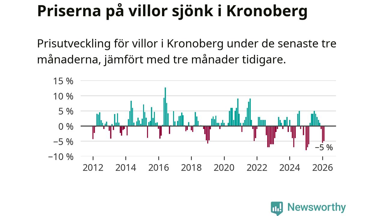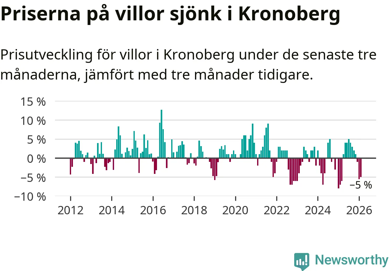 Villapriserna sjönk mellan december och februari med 5 procent i Kronobergs län. Det är en betydande nedgång jämfört med det gångna året då priserna i snitt ökat med 1 procent.