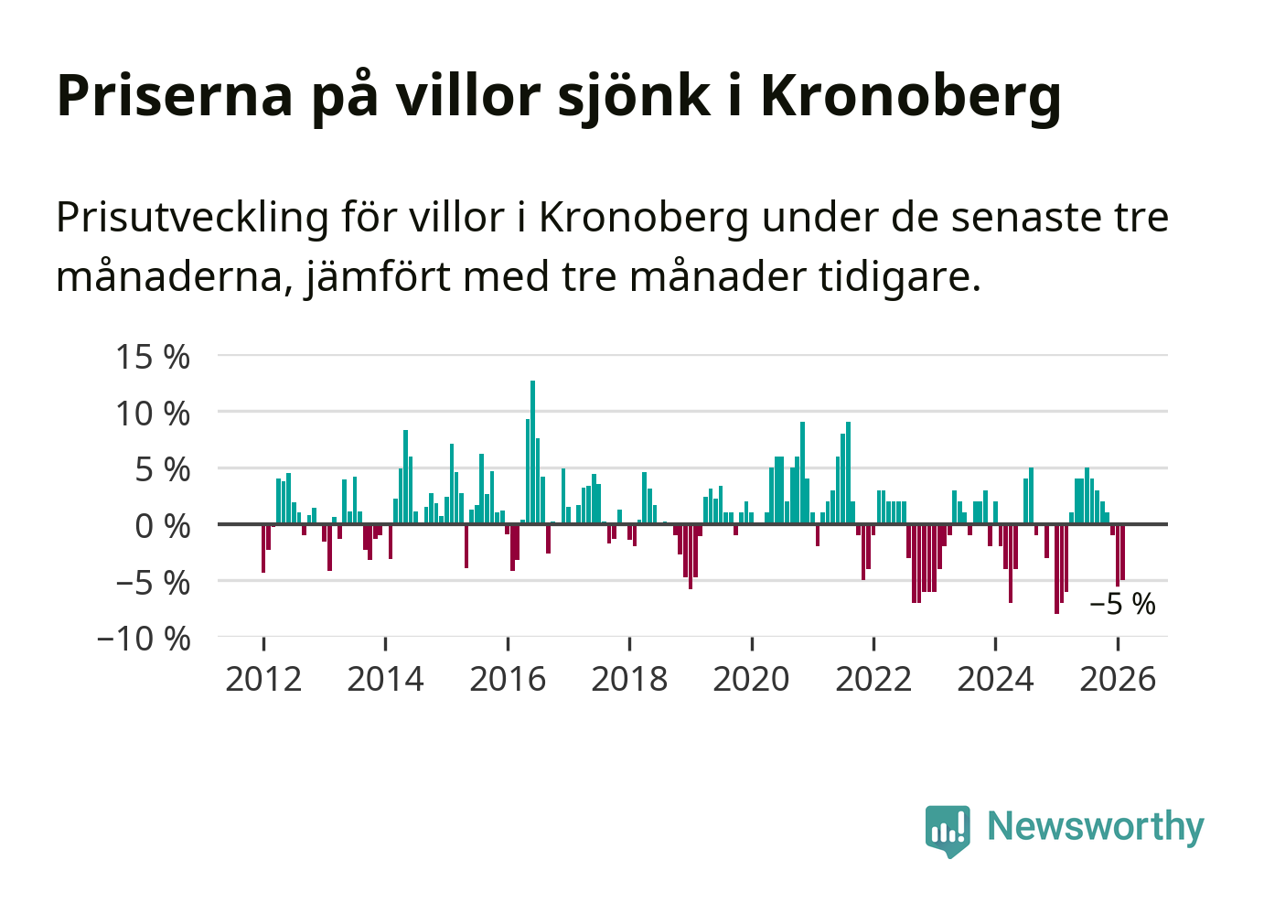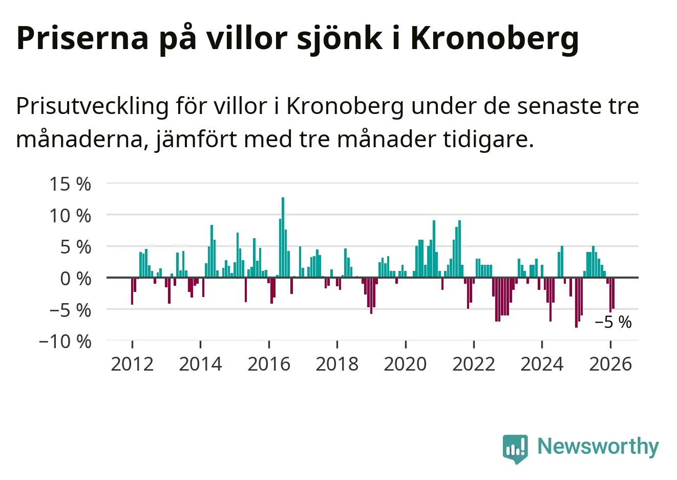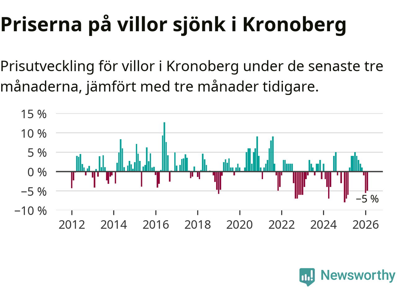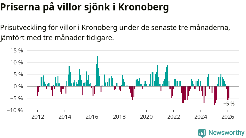 Villapriserna sjönk mellan december och februari med 5 procent i Kronobergs län. Det är en betydande nedgång jämfört med det gångna året då priserna i snitt ökat med 1 procent.