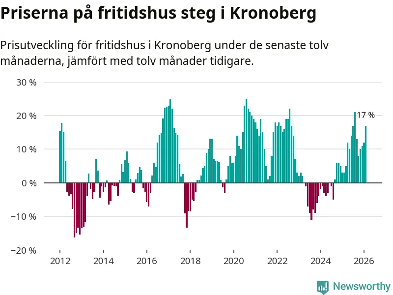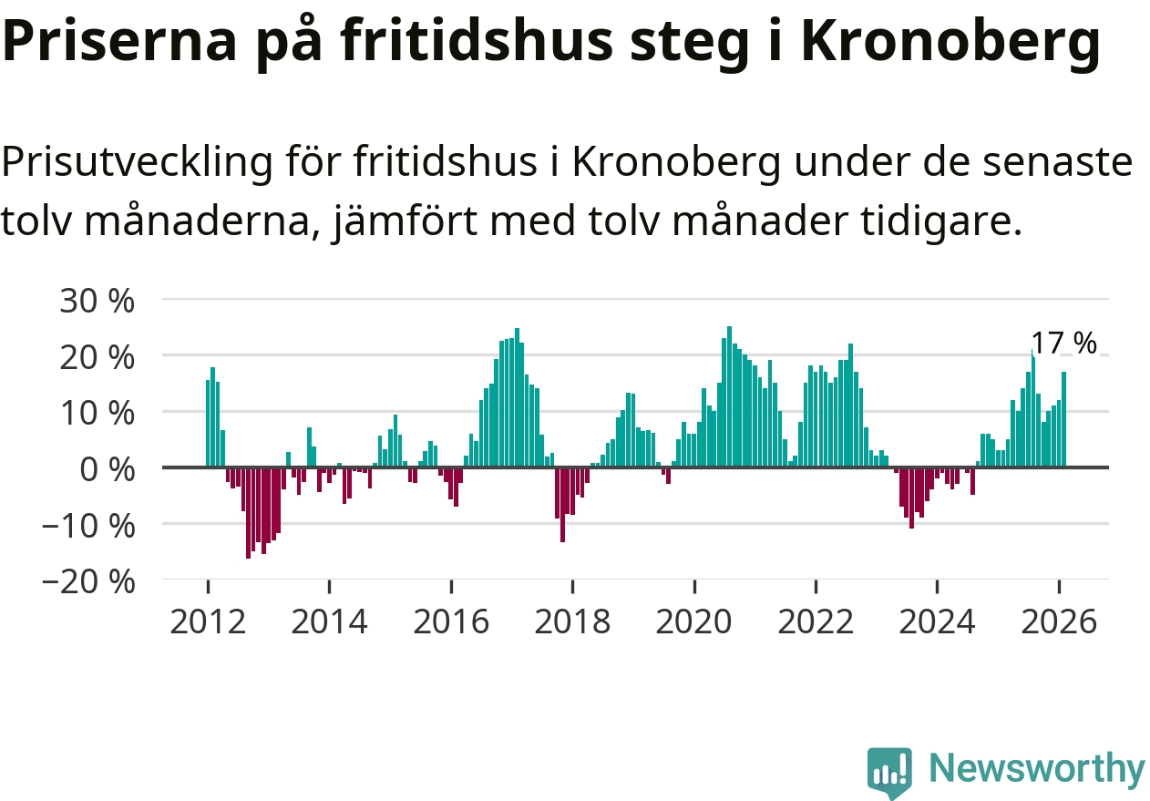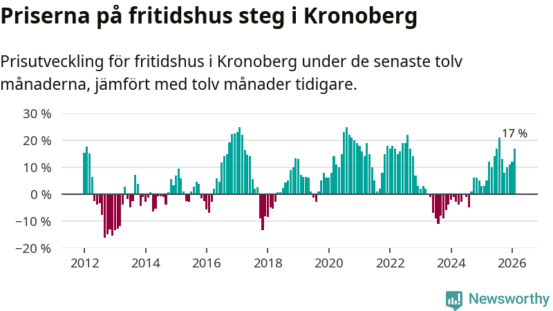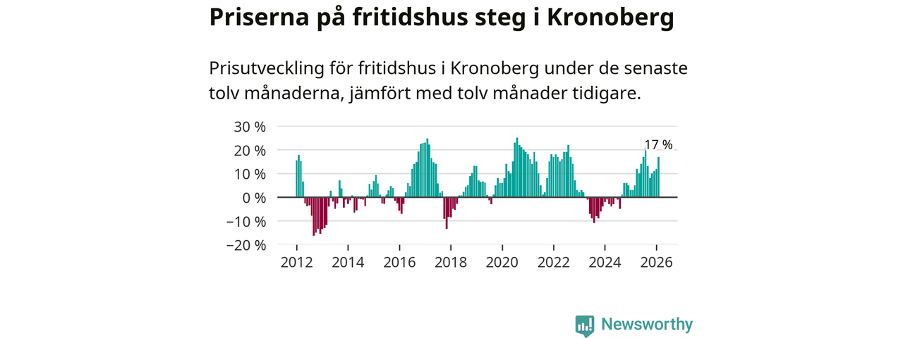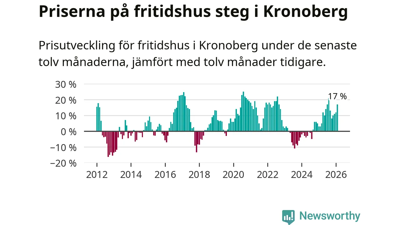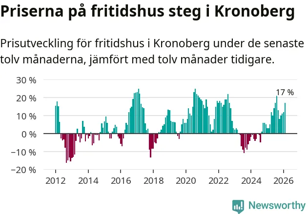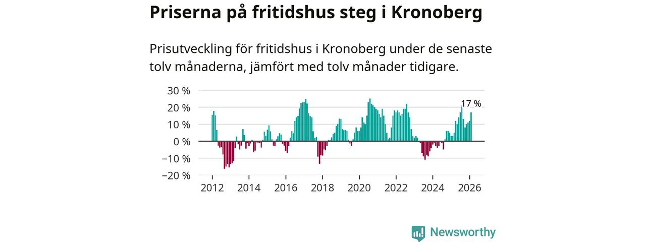 Priserna på fritidshus har gått upp i Kronobergs län. Medelpriset på försäljningarna under de senaste tolv månaderna visar på en uppgång med 17 procent.