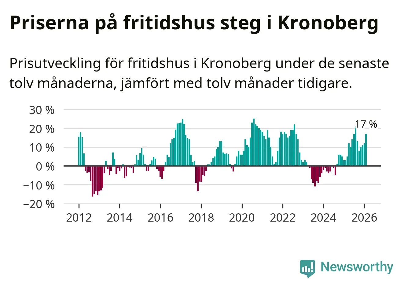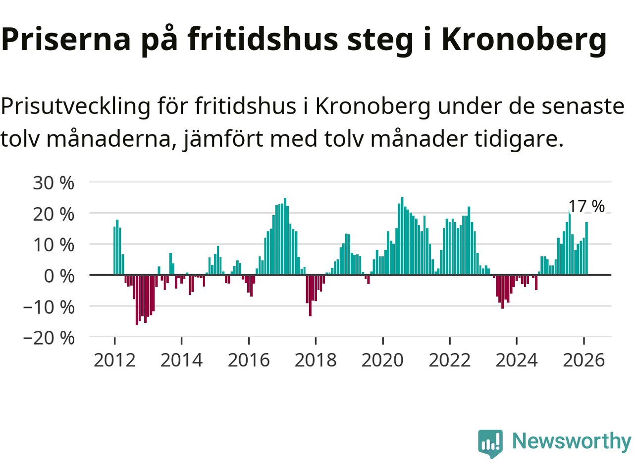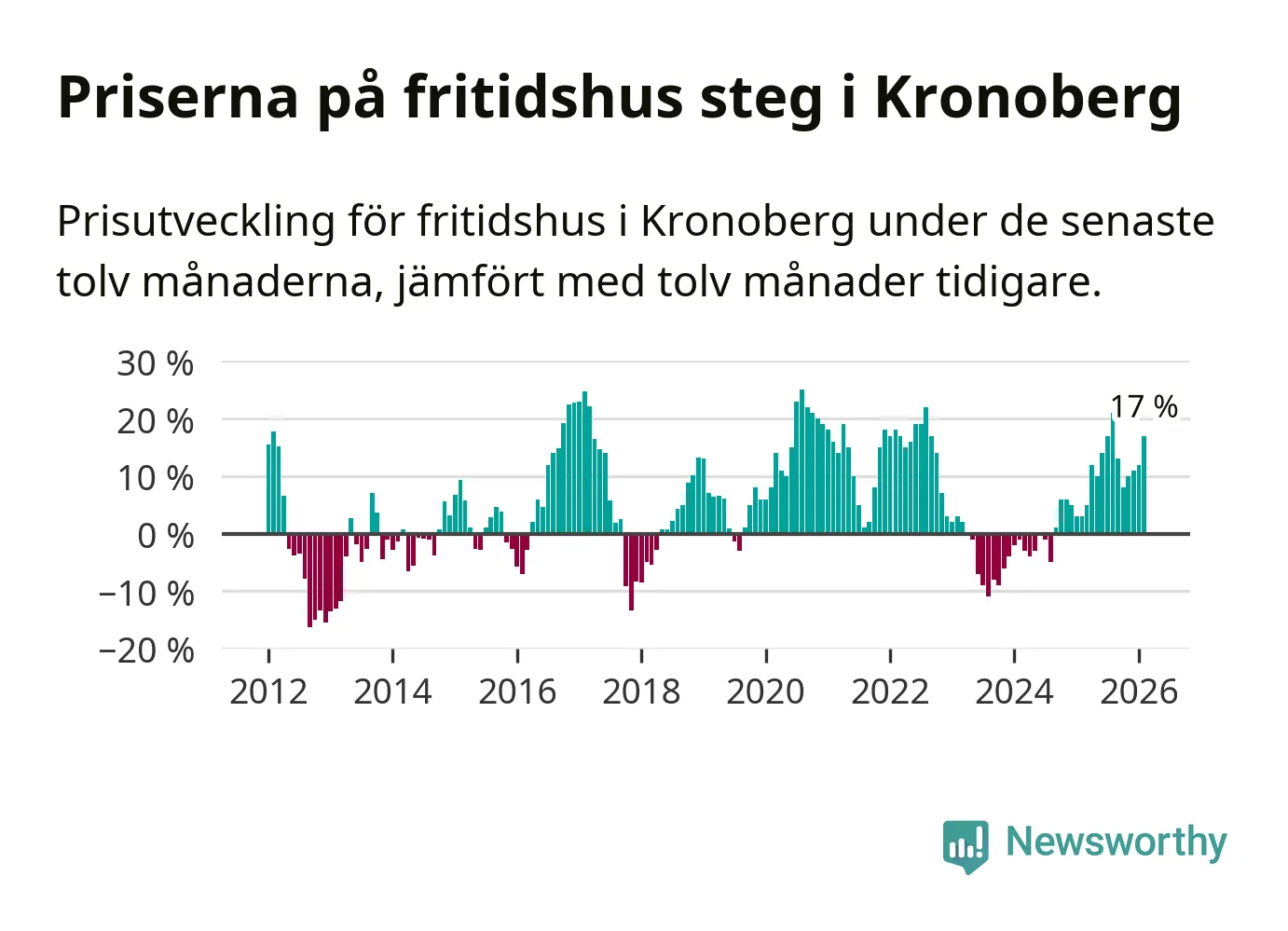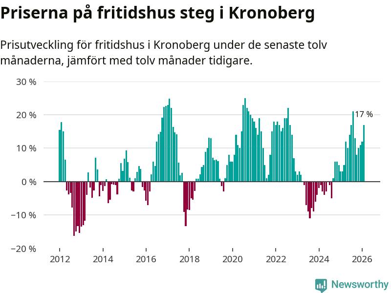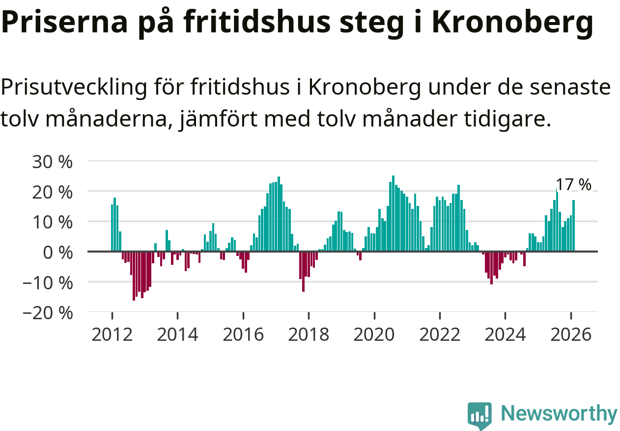 Priserna på fritidshus har gått upp i Kronobergs län. Medelpriset på försäljningarna under de senaste tolv månaderna visar på en uppgång med 17 procent.