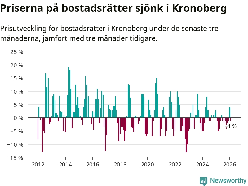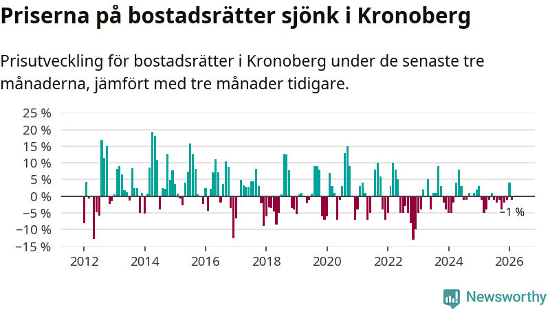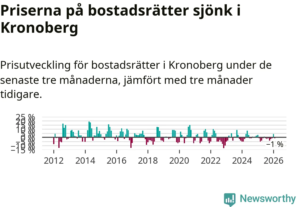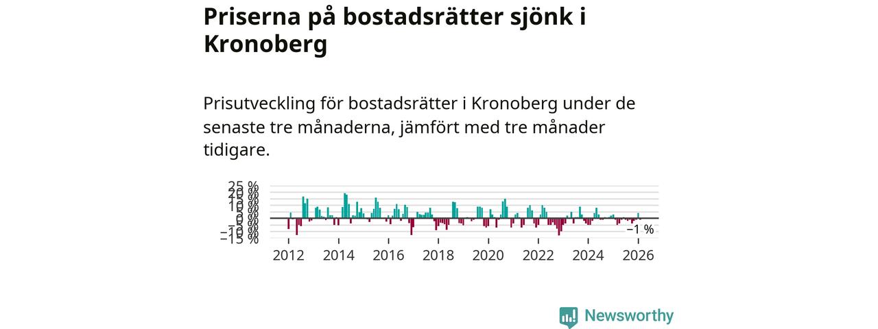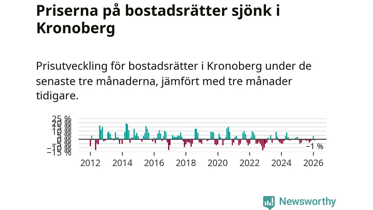 Priserna på bostadsrätter har gått ner i Kronobergs län. Medelpriset på försäljningarna under de senaste tre månaderna visar på en nedgång med 1 procent.