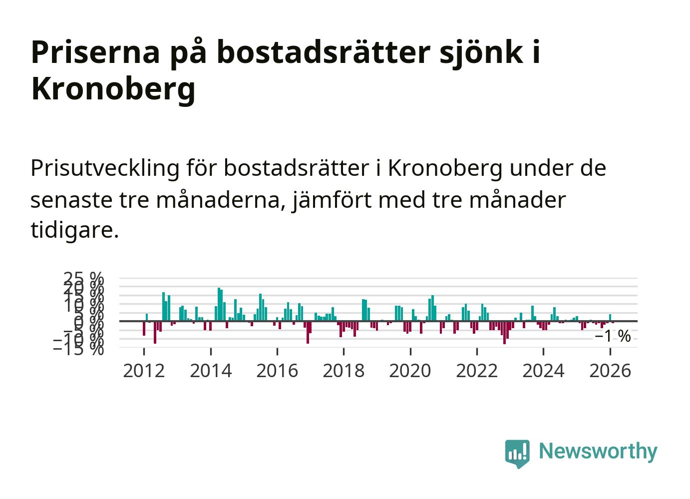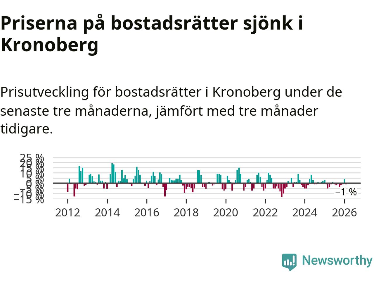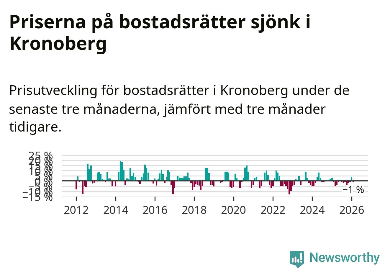 Priserna på bostadsrätter har gått ner i Kronobergs län. Medelpriset på försäljningarna under de senaste tre månaderna visar på en nedgång med 1 procent.