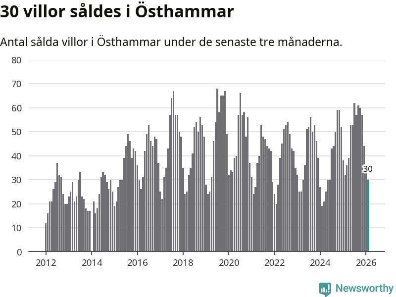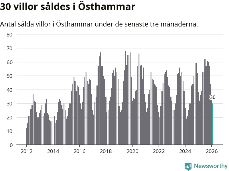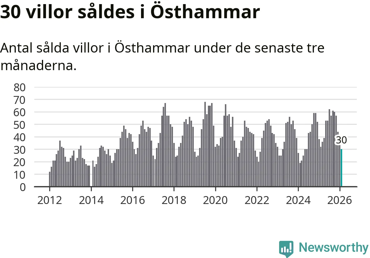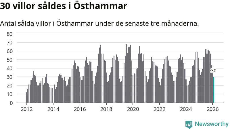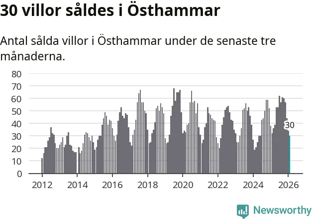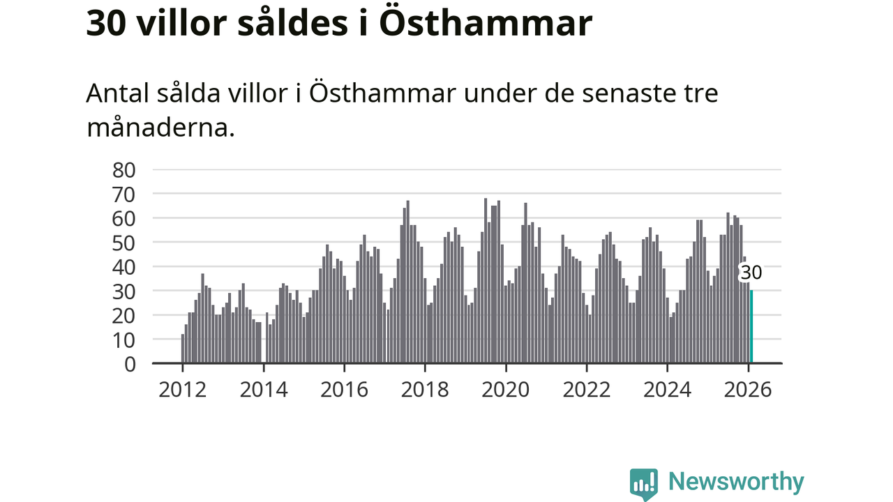 Sammanlagt såldes 30 villor i Östhammars kommun mellan december och februari till ett genomsnittligt pris på 2,7 miljoner kronor. I fjol gjordes 32 affärer vid den här tiden på året.