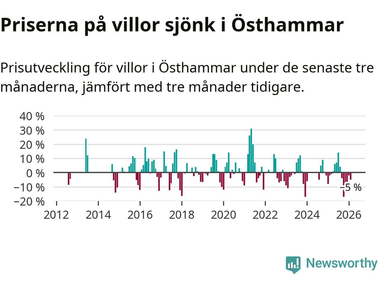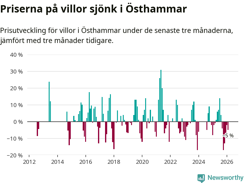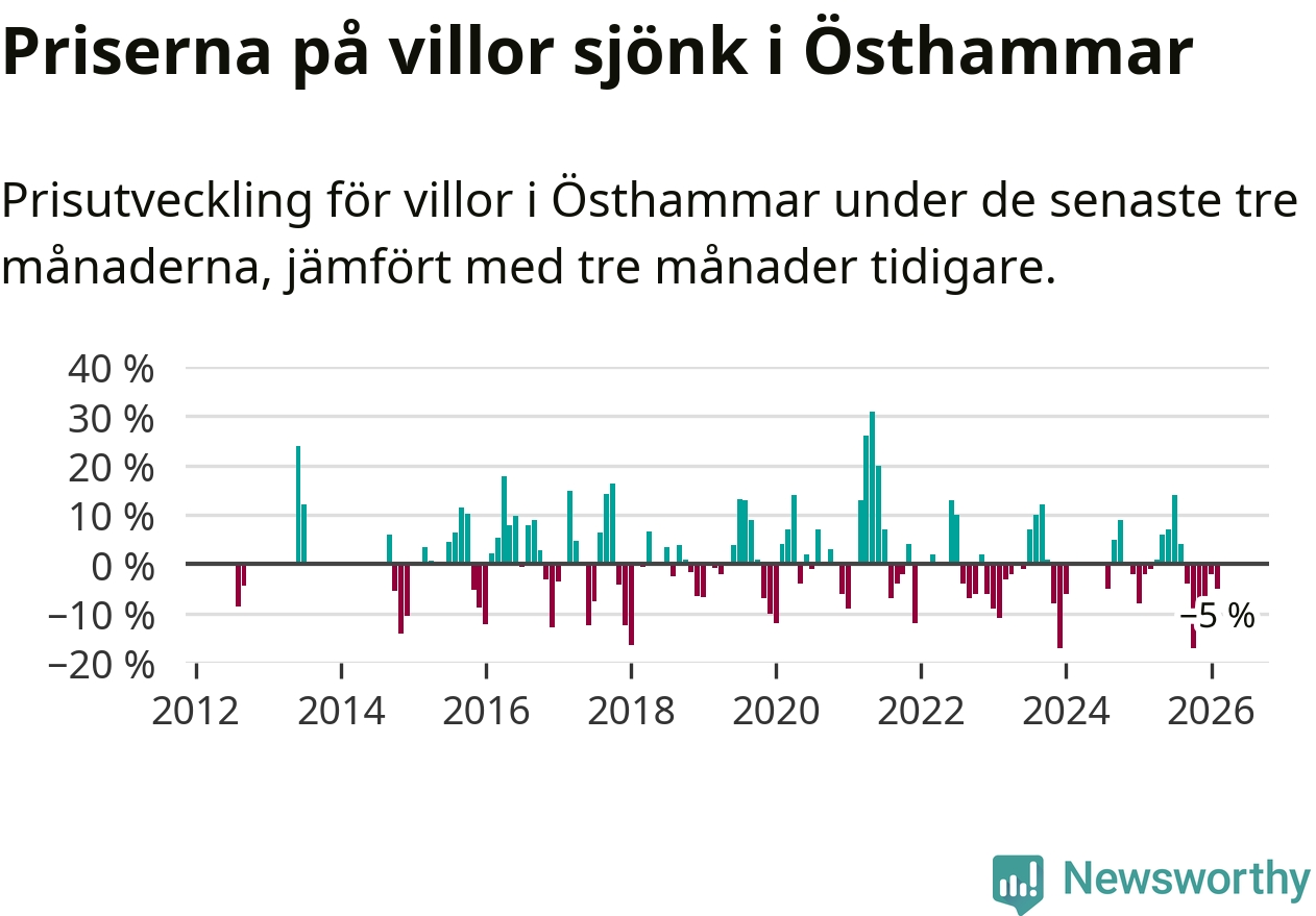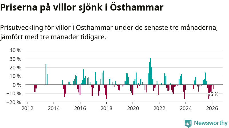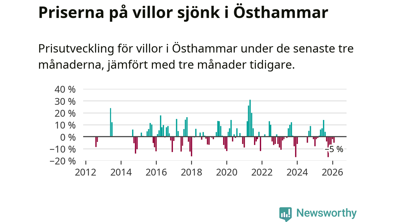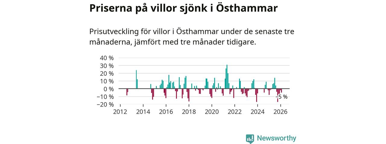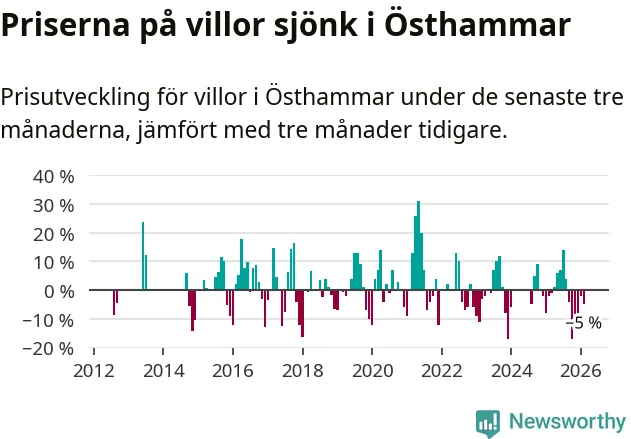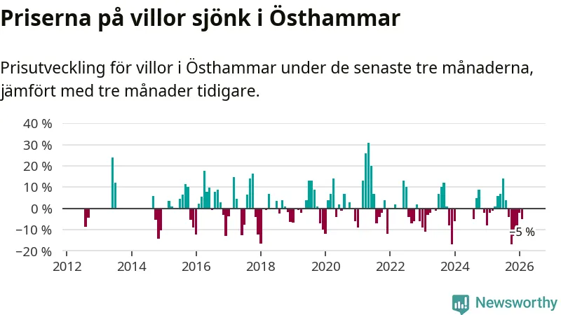 Villapriserna har gått ner i Östhammars kommun. Medelpriset på försäljningarna under de senaste tre månaderna visar på en nedgång med 5 procent.