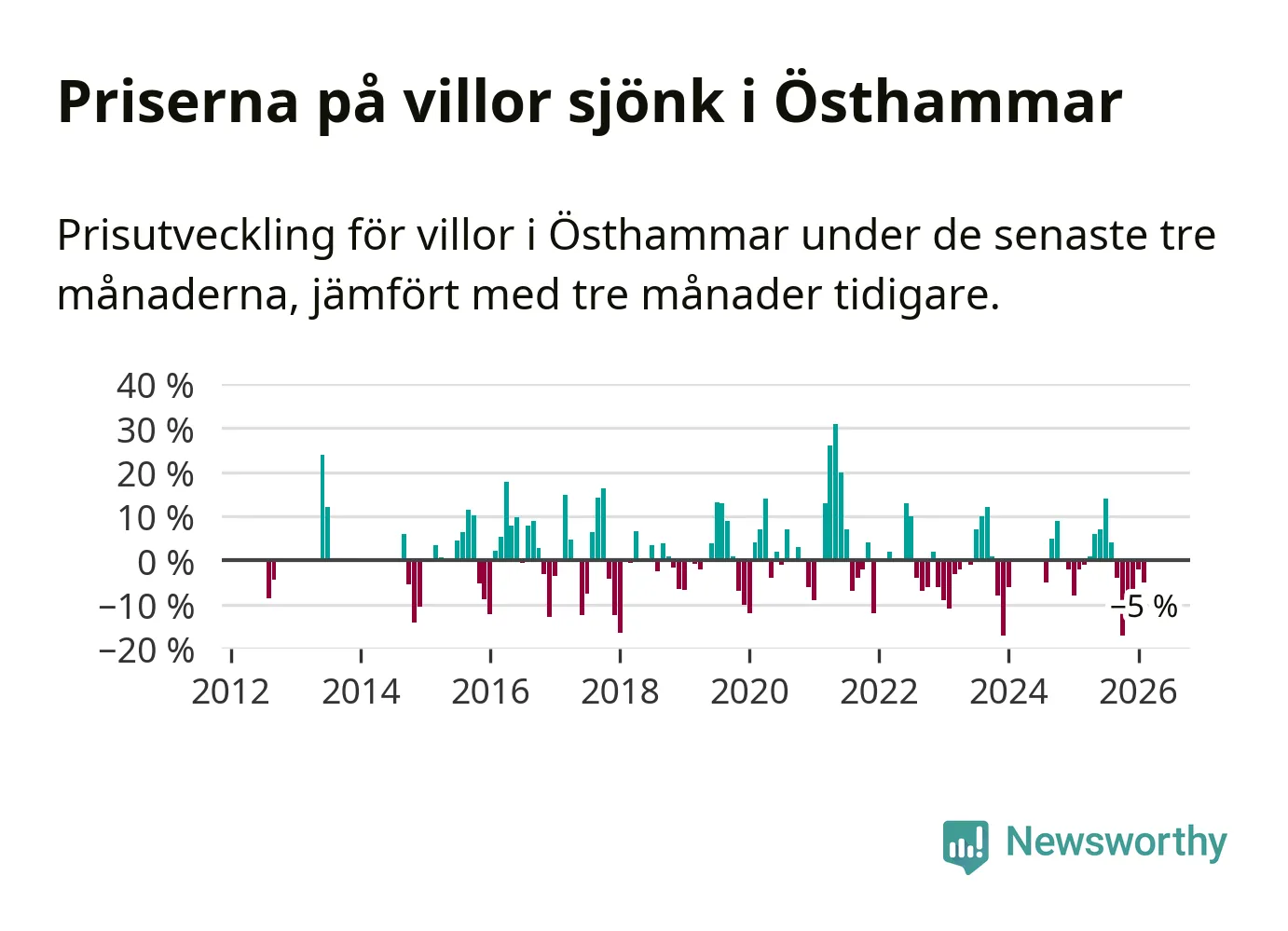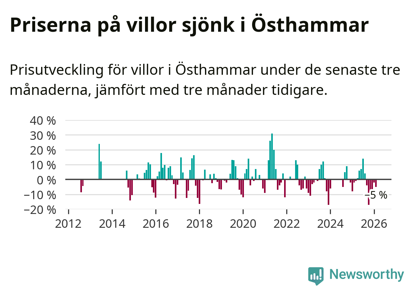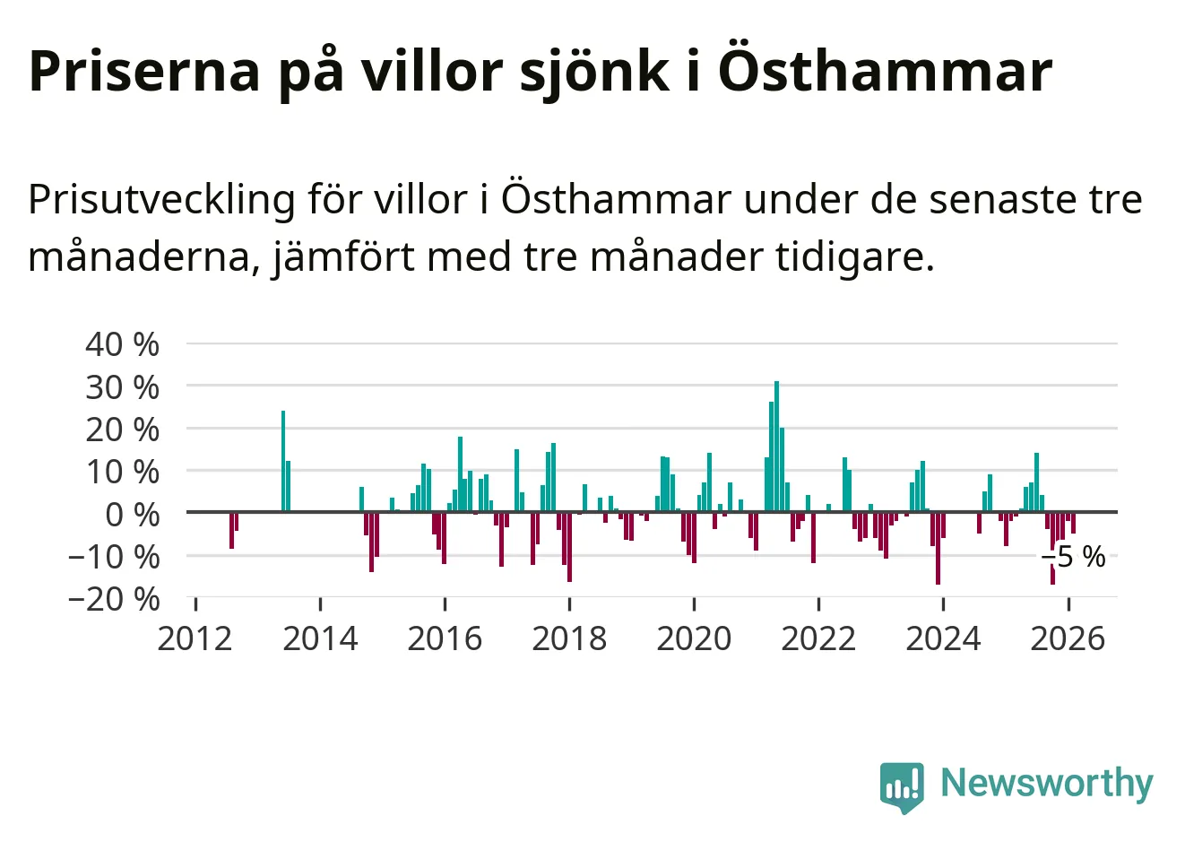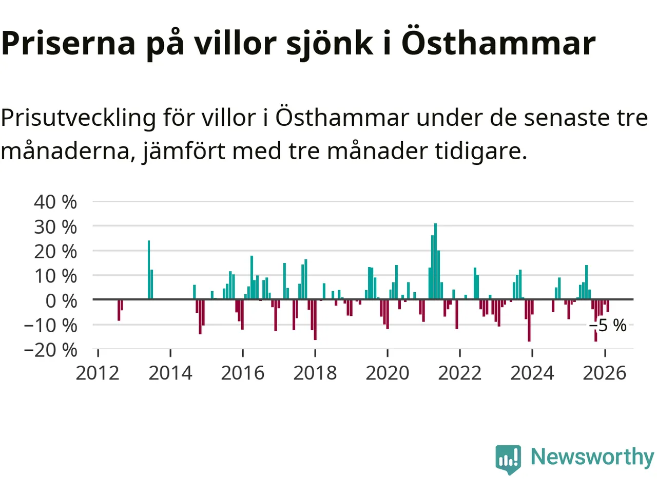 Villapriserna har gått ner i Östhammars kommun. Medelpriset på försäljningarna under de senaste tre månaderna visar på en nedgång med 5 procent.
