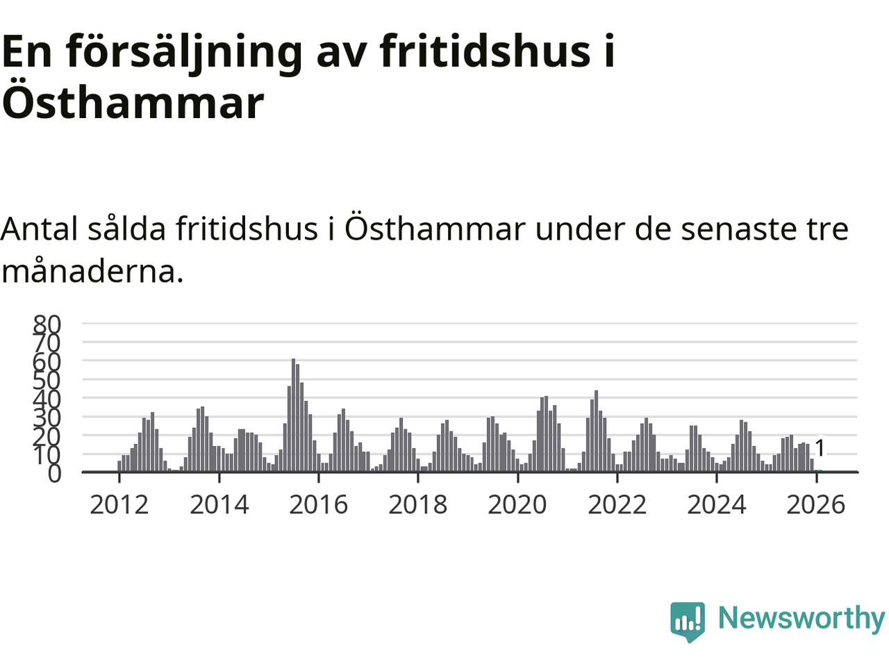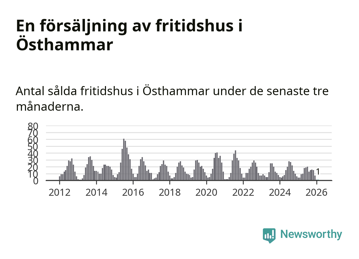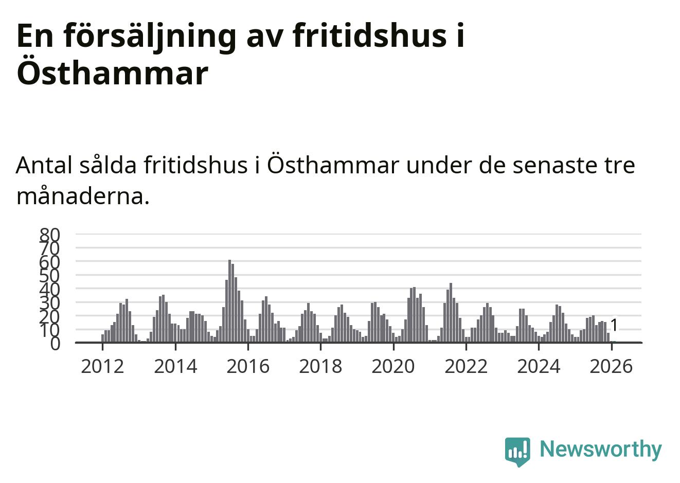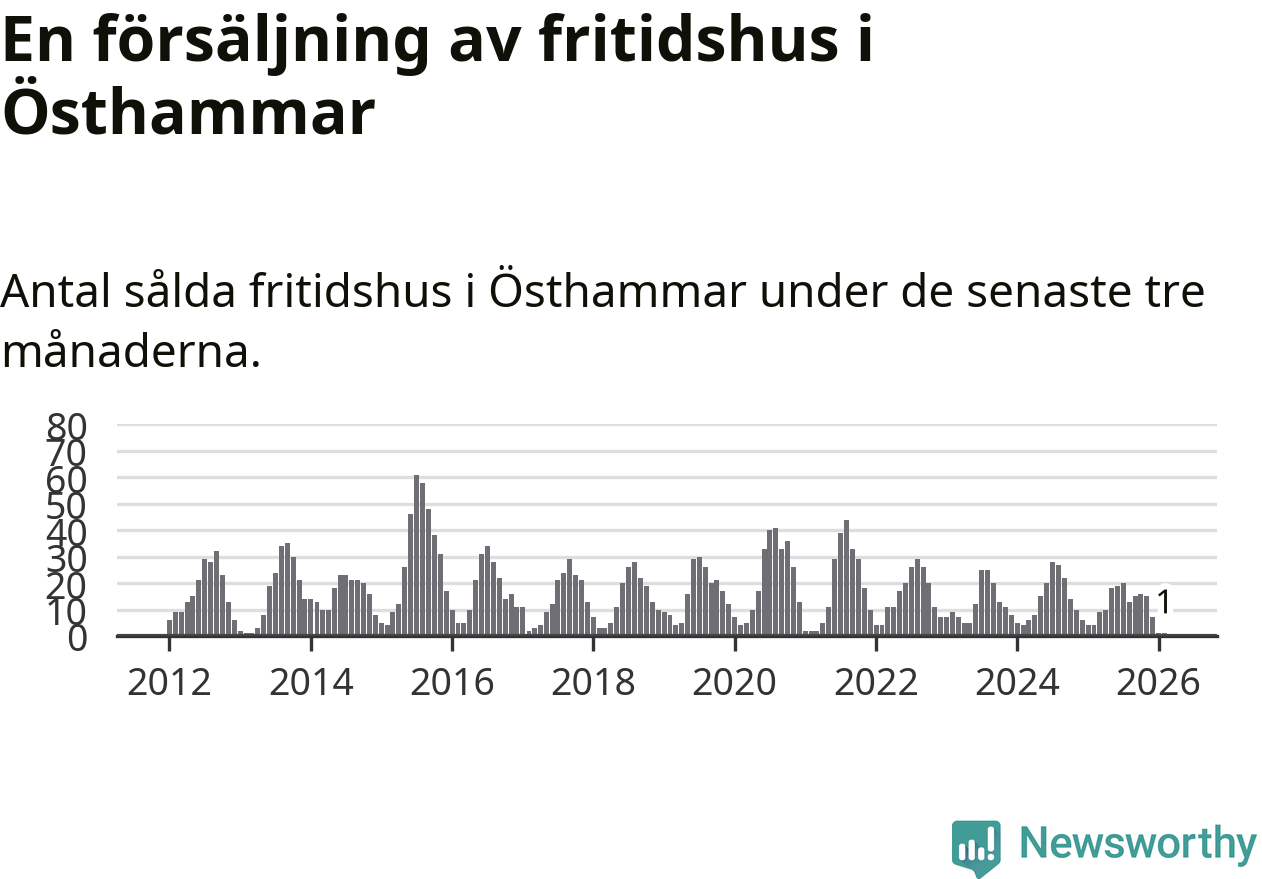 Sammanlagt såldes ett fritidshus i Östhammars kommun mellan december 2025 och februari till ett genomsnittligt pris på 2,0 miljoner kronor. I fjol gjordes fyra affärer vid den här tiden på året.