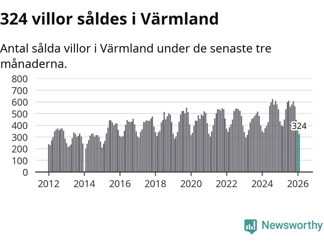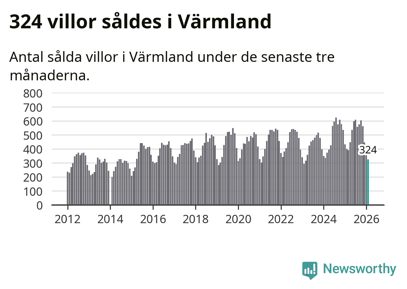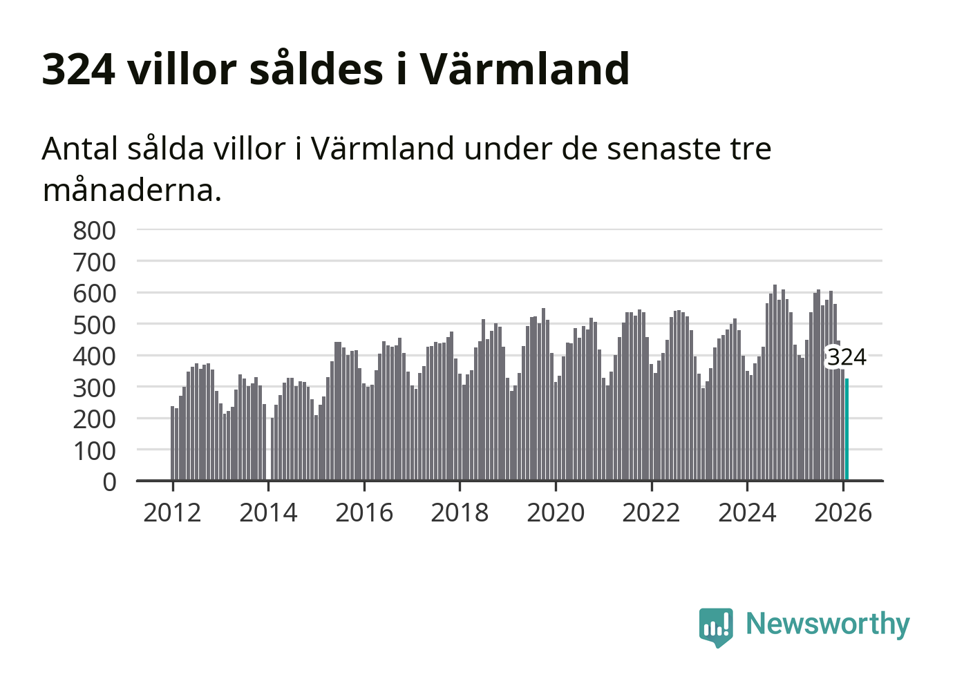 Mellan december och februari såldes 324 villor i Värmlands län. Det är relativt få sett till aktiviteten på bostadsmarknaden i länet under de senaste tolv månaderna, samt det historiska snittet för den här tiden på året.