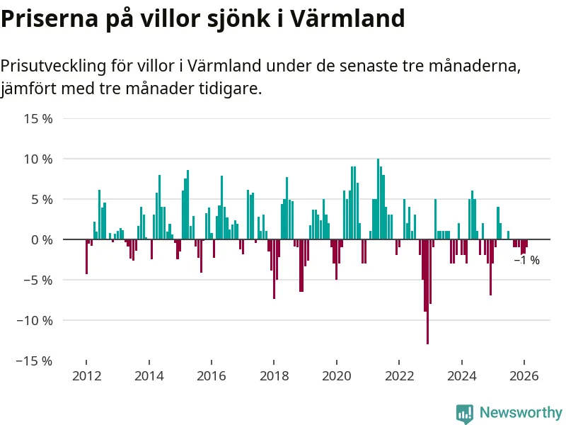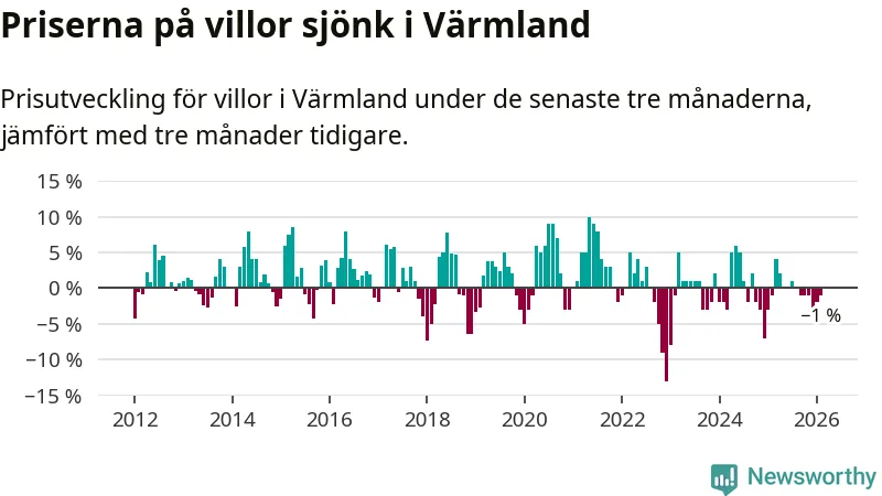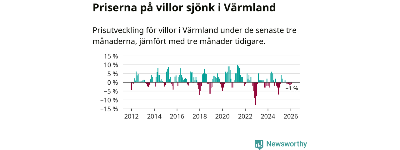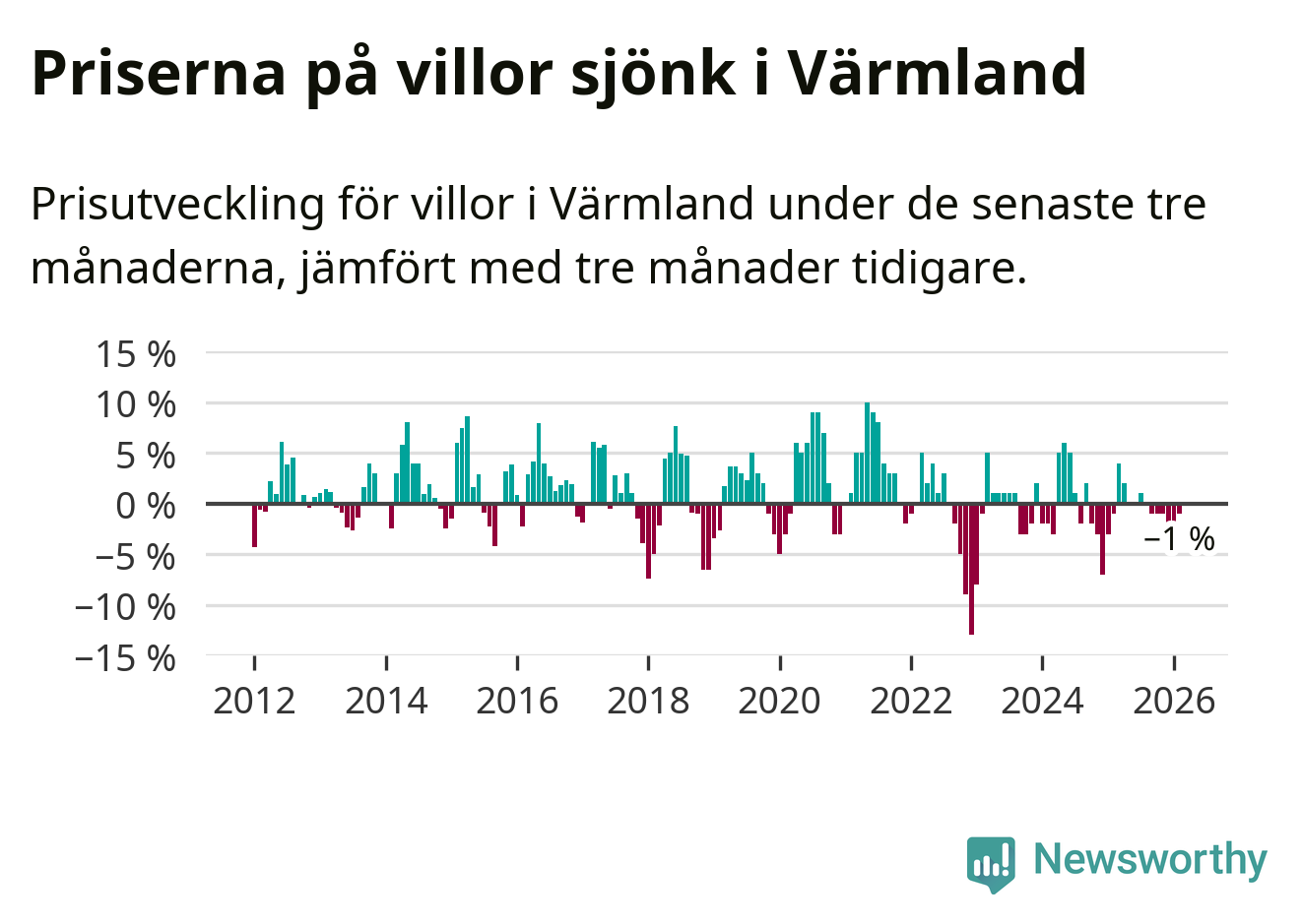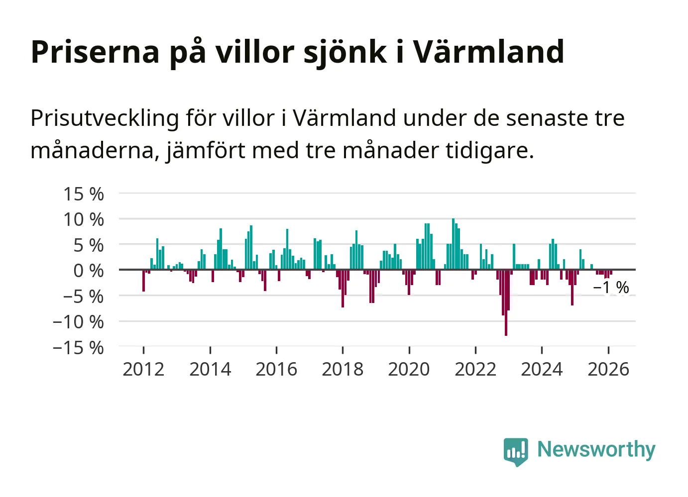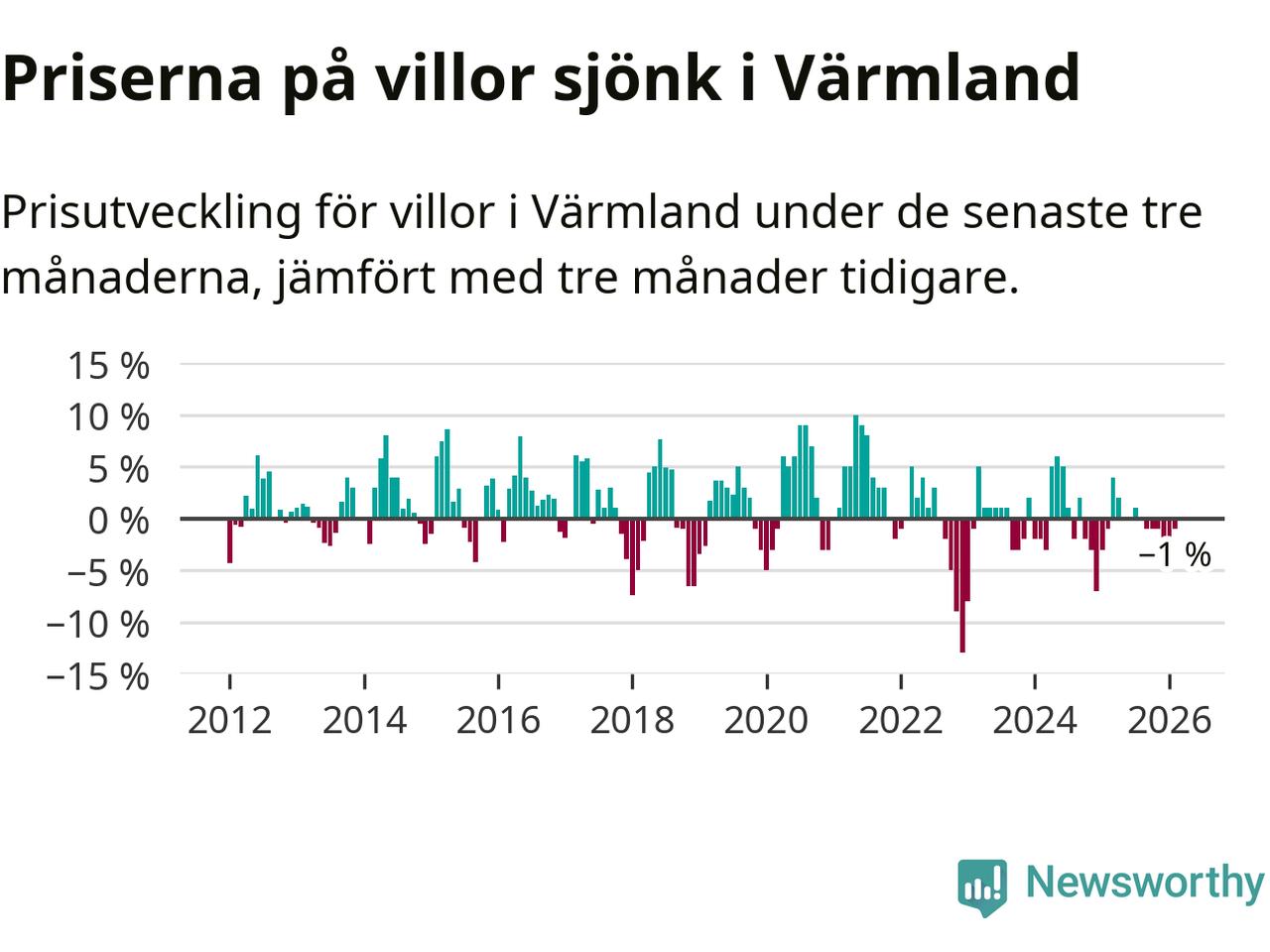 Statistiken visar även på en prisnedgång i Värmlands län. Medelpriset på försäljningarna av villor i länet var 1 procent lägre än för tre månader sedan. Även i hela Sverige sjunker villapriserna. I hela riket noterades en prisnedgång på 1 procent.