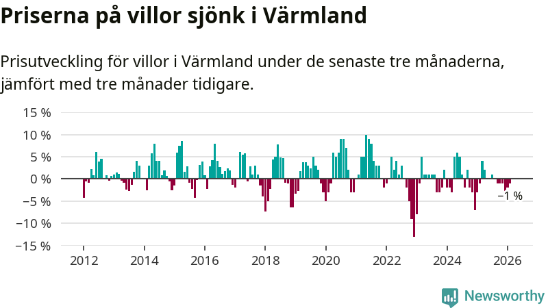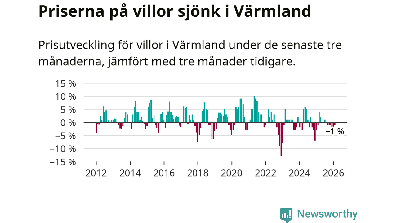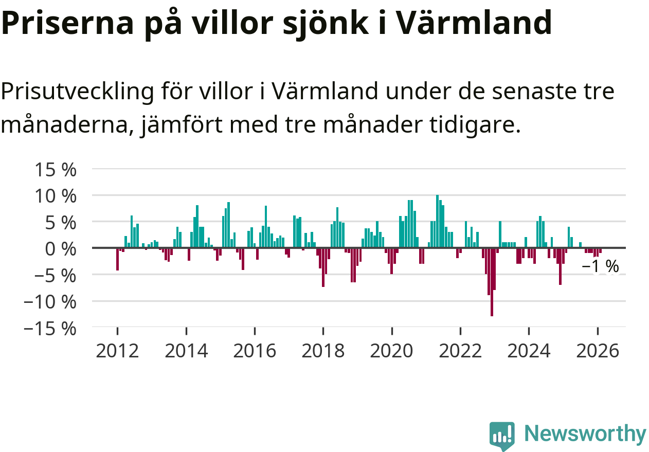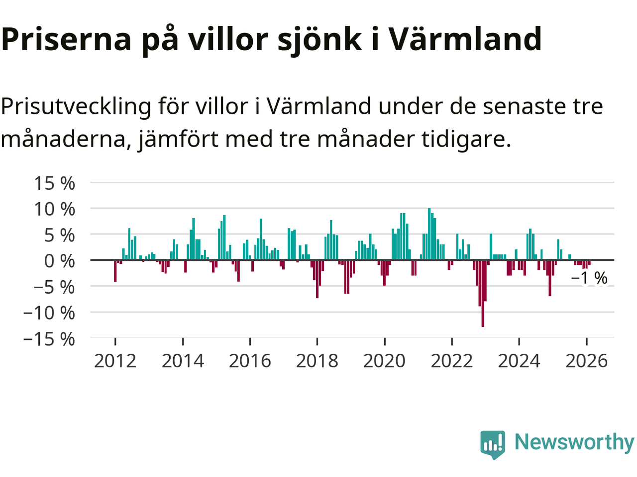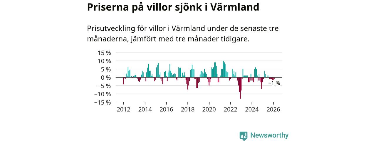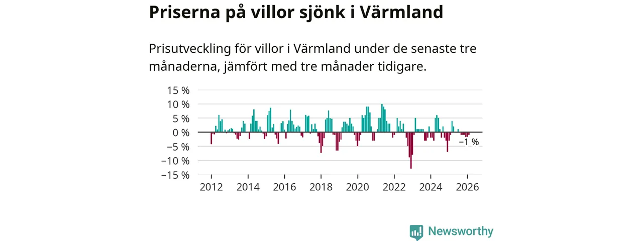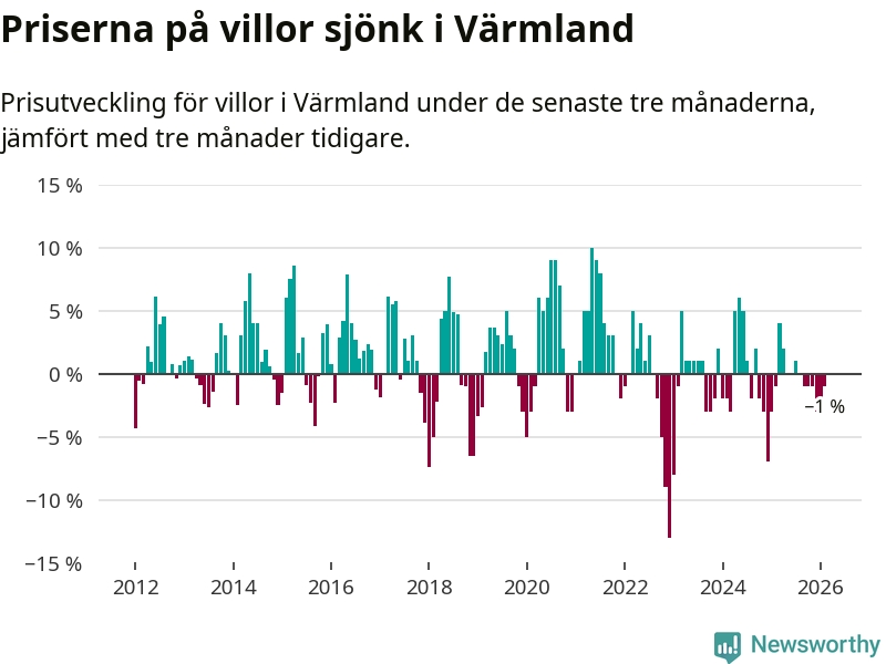 Statistiken visar även på en prisnedgång i Värmlands län. Medelpriset på försäljningarna av villor i länet var 1 procent lägre än för tre månader sedan. Även i hela Sverige sjunker villapriserna. I hela riket noterades en prisnedgång på 1 procent.