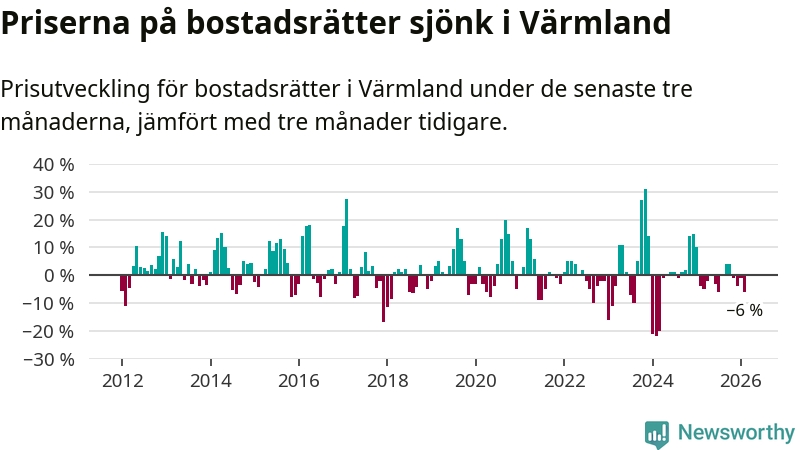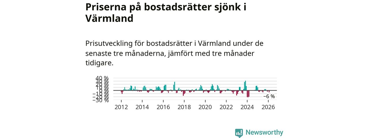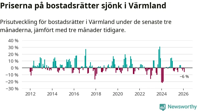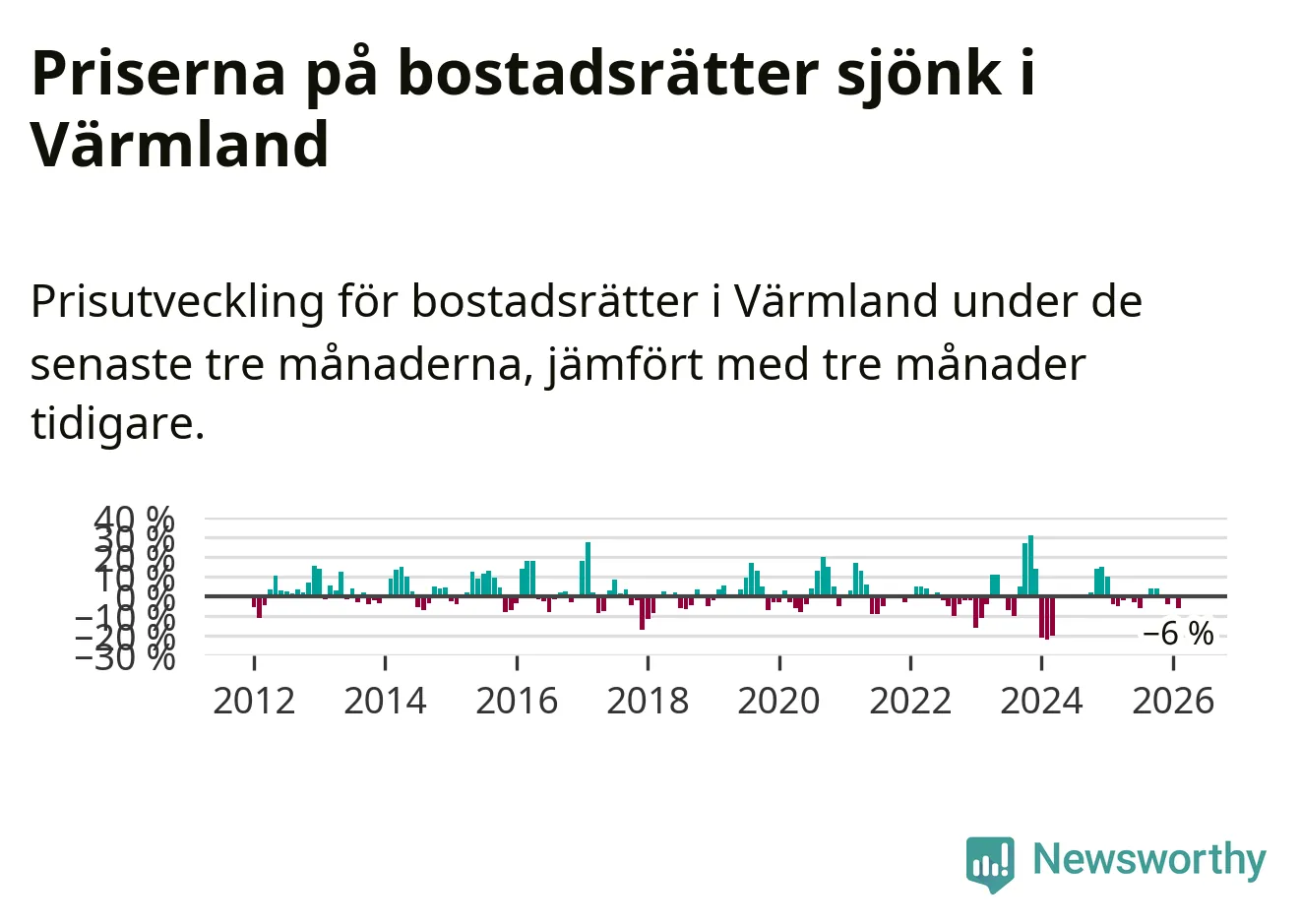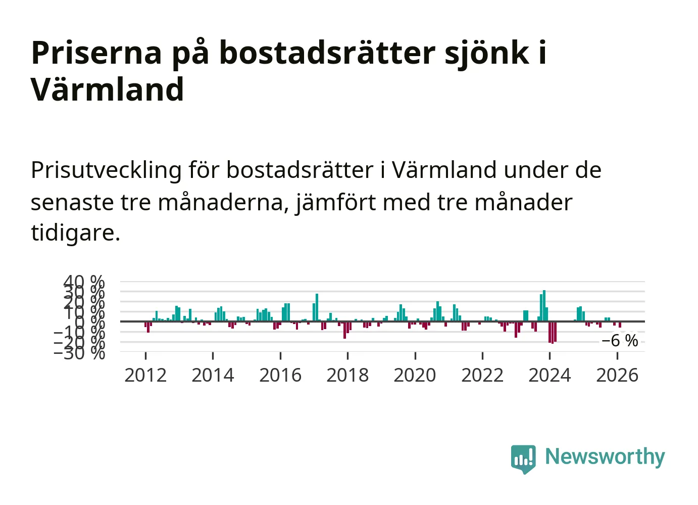 På grund av få försäljningar saknas uppgifter om prisförändringar för bostadsrätter i 13 av länets 16 kommuner. Bland de tre vi har uppgifter om sjunker priserna i samtliga.I Värmlands län som helhet går priserna på bostadsrätter ner med 6 procent. I hela Sverige däremot ligger priserna på bostadsrätter stilla.