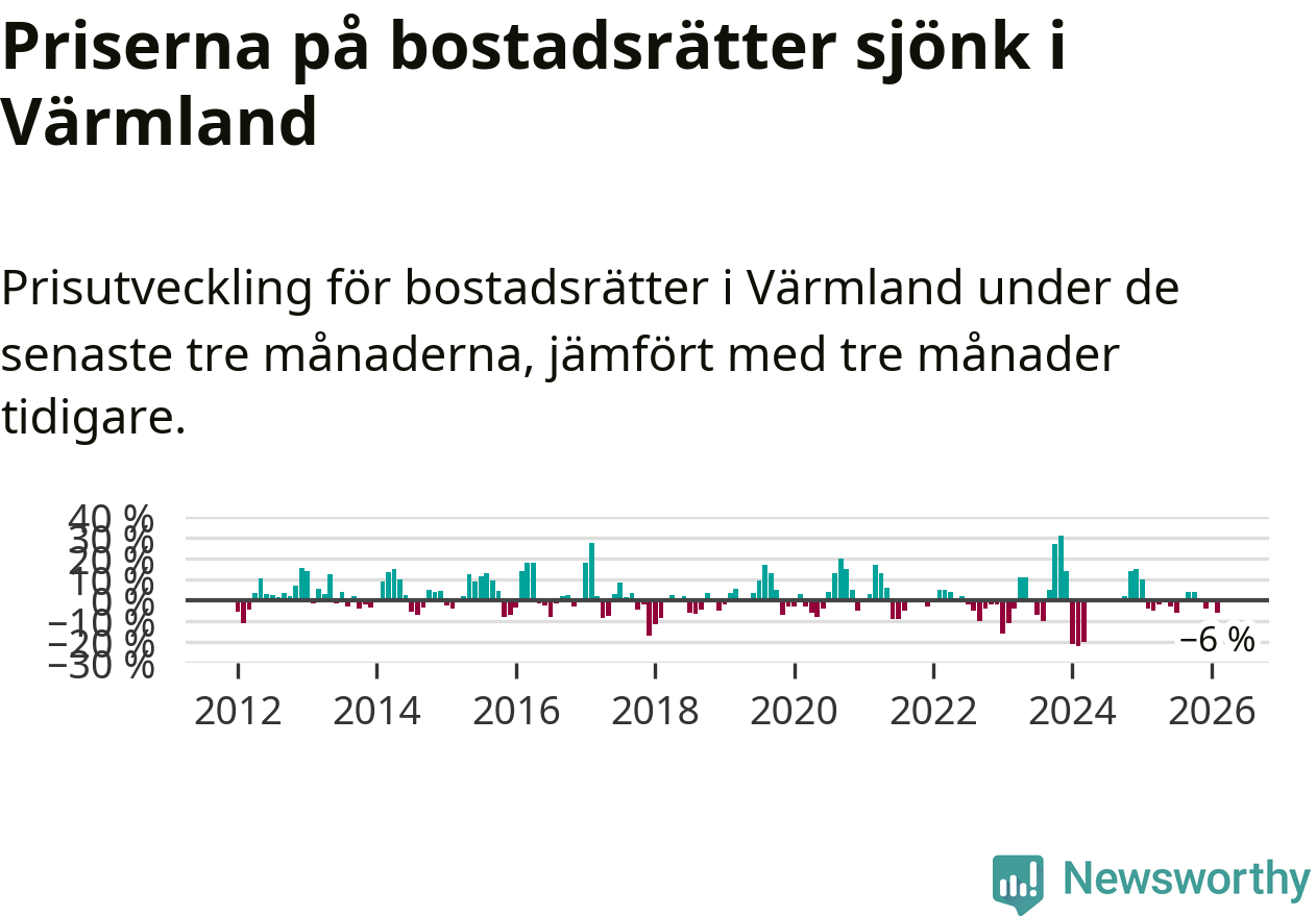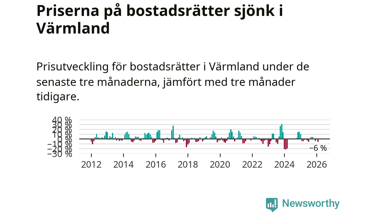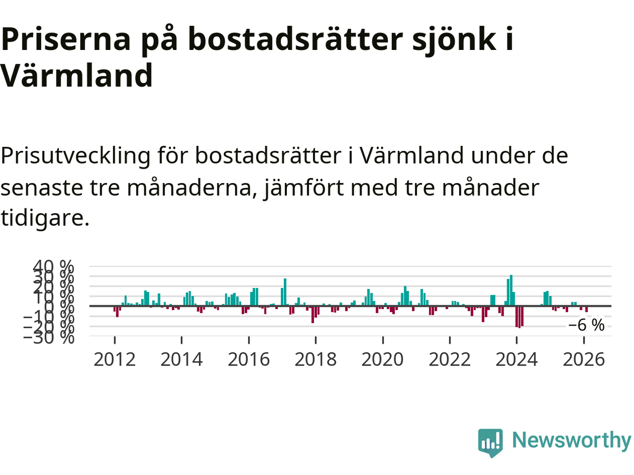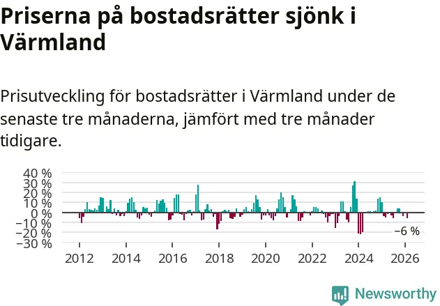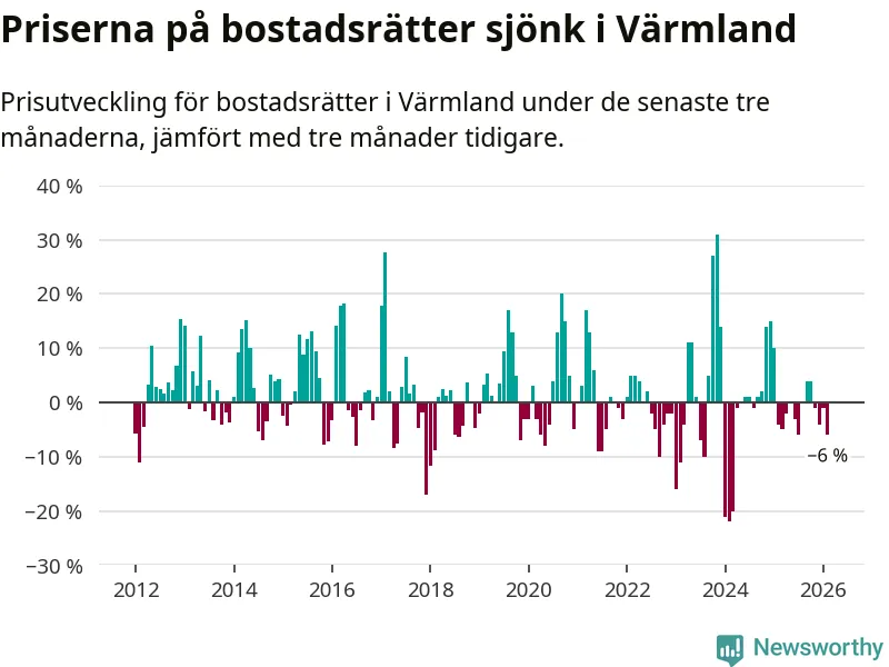 På grund av få försäljningar saknas uppgifter om prisförändringar för bostadsrätter i 13 av länets 16 kommuner. Bland de tre vi har uppgifter om sjunker priserna i samtliga.I Värmlands län som helhet går priserna på bostadsrätter ner med 6 procent. I hela Sverige däremot ligger priserna på bostadsrätter stilla.