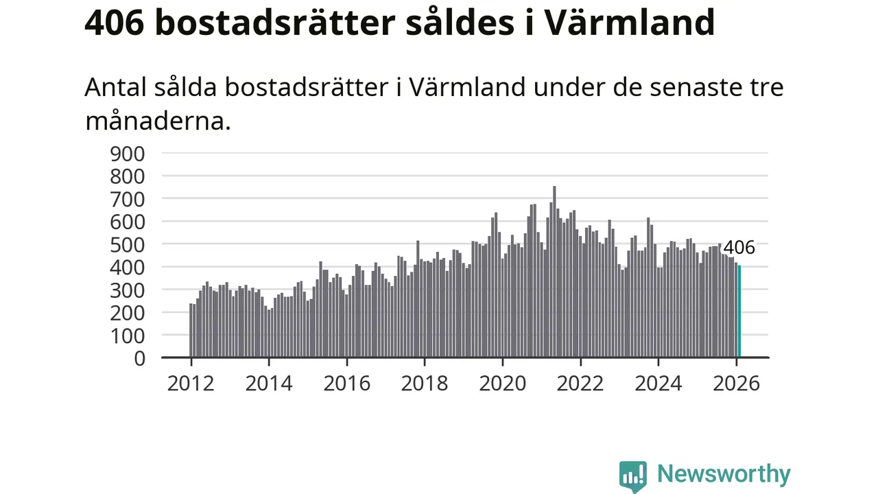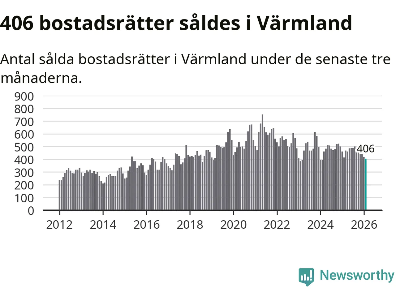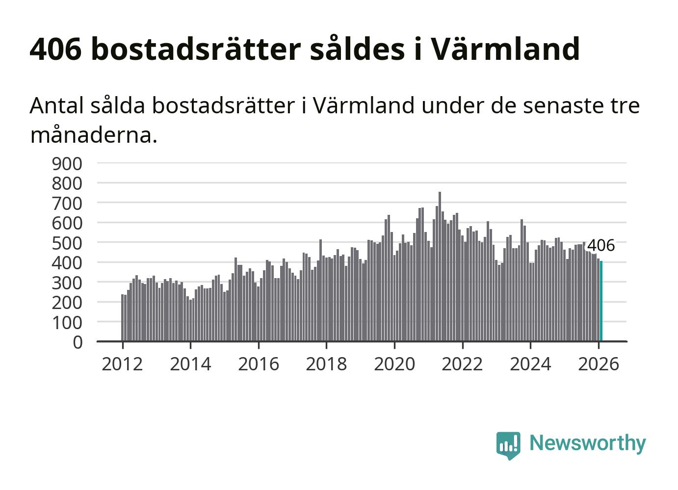 Sammanlagt såldes 406 bostadsrätter i Värmlands län mellan december och februari till ett genomsnittligt pris på 1,4 miljoner kronor. I fjol gjordes 414 affärer vid den här tiden på året.