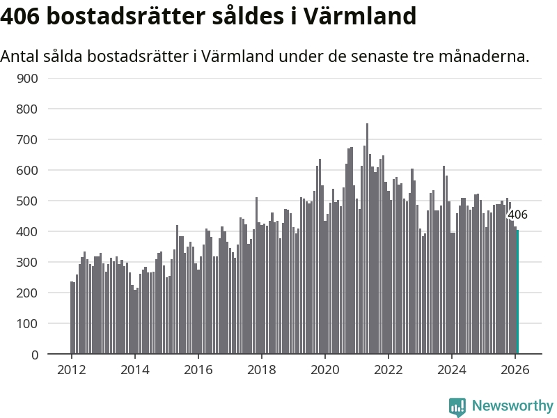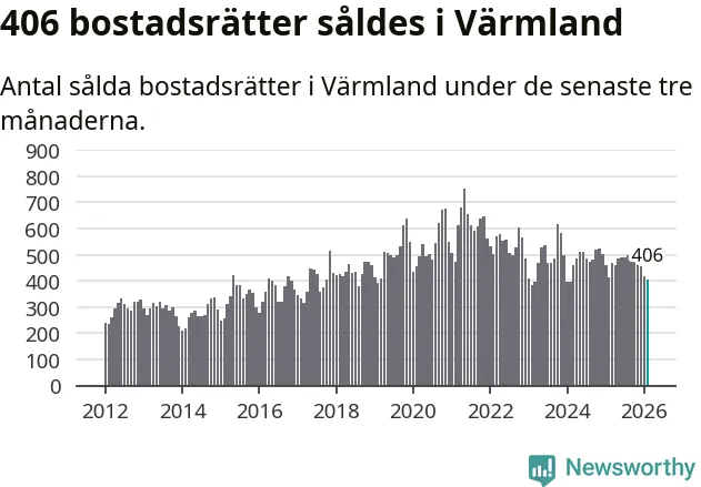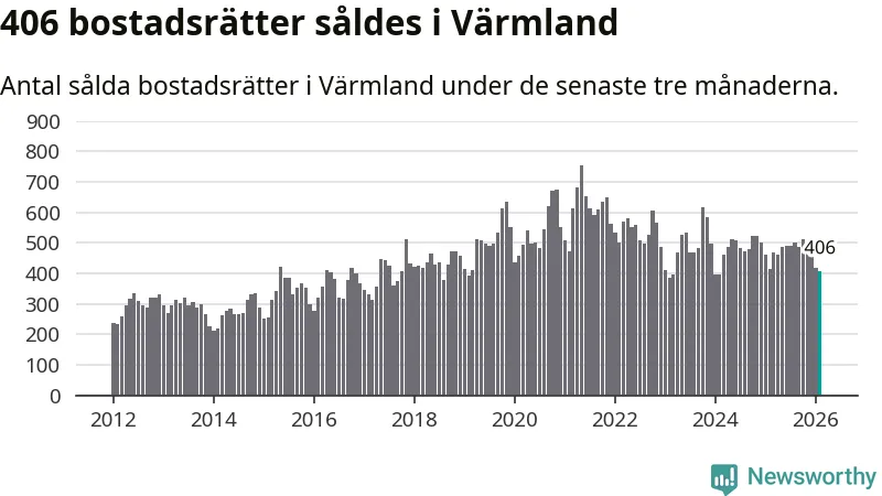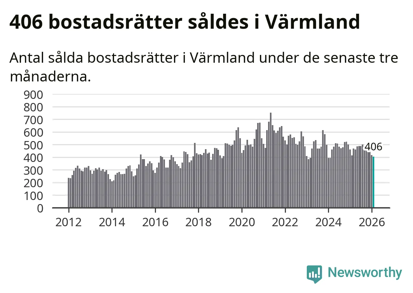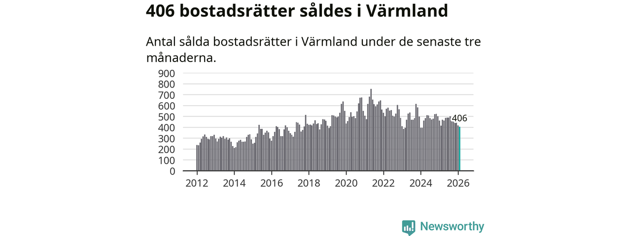 Sammanlagt såldes 406 bostadsrätter i Värmlands län mellan december och februari till ett genomsnittligt pris på 1,4 miljoner kronor. I fjol gjordes 414 affärer vid den här tiden på året.