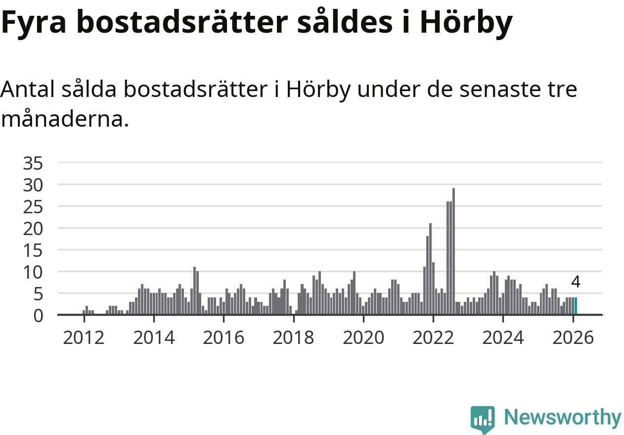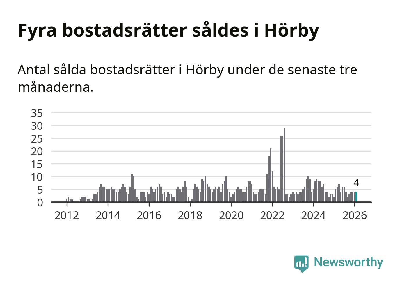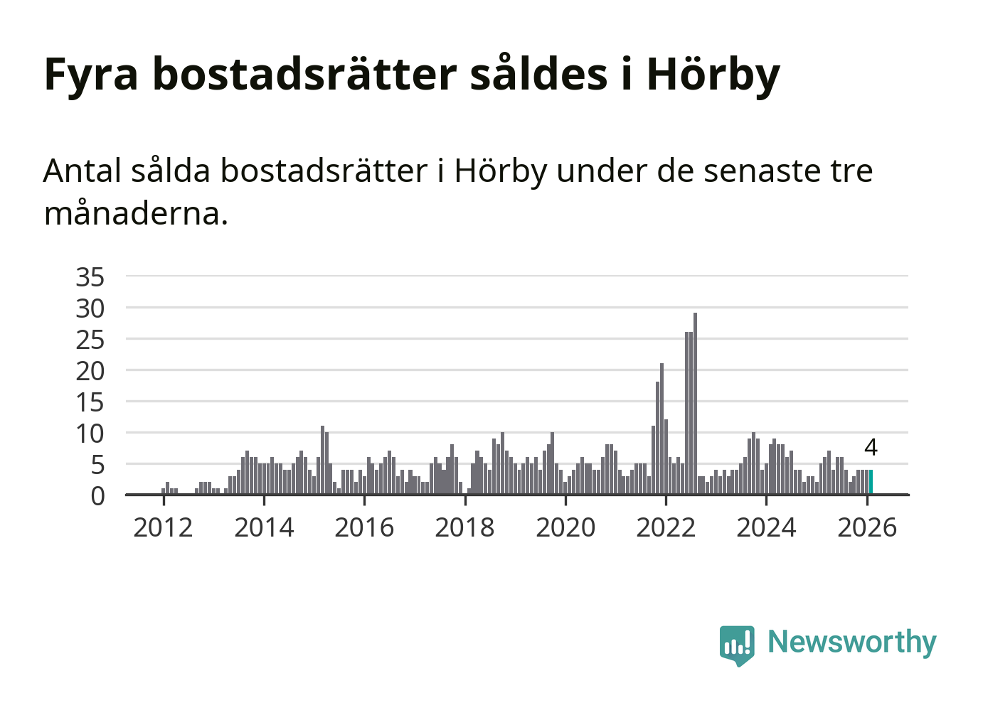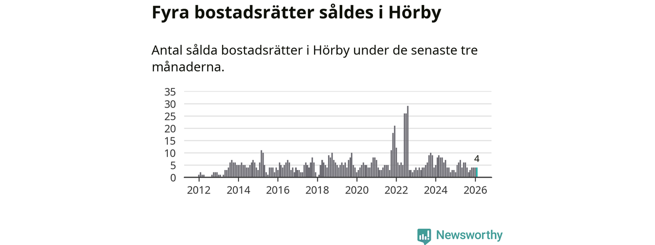Mellan december och februari gjordes sammanlagt fyra affärer med bostadsrätter i Hörby kommun. Det kan jämföras med fem vid motsvarande tid i fjol.
