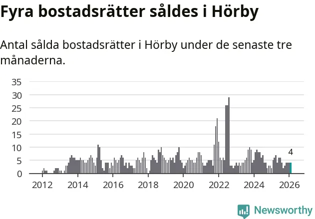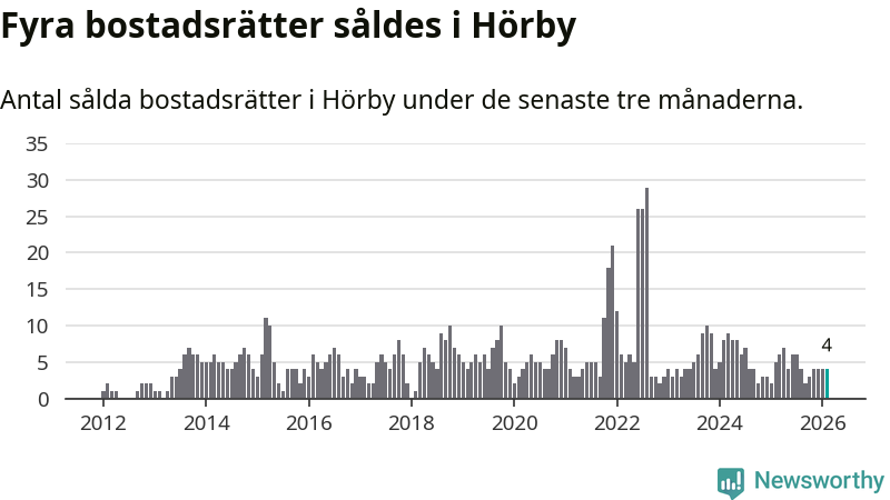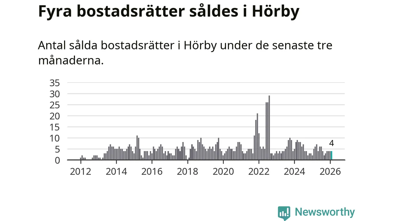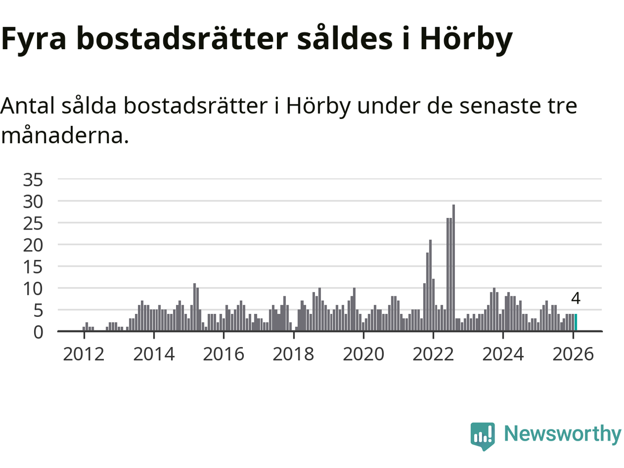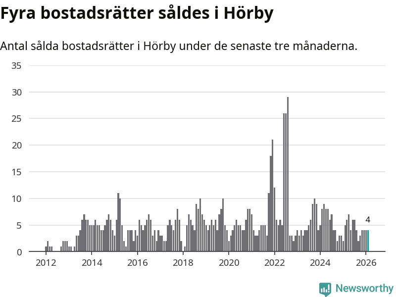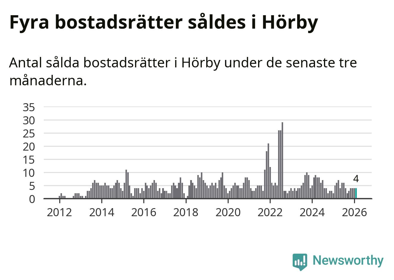 Mellan december och februari gjordes sammanlagt fyra affärer med bostadsrätter i Hörby kommun. Det kan jämföras med fem vid motsvarande tid i fjol.