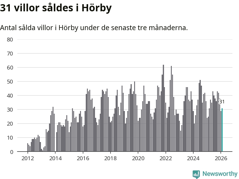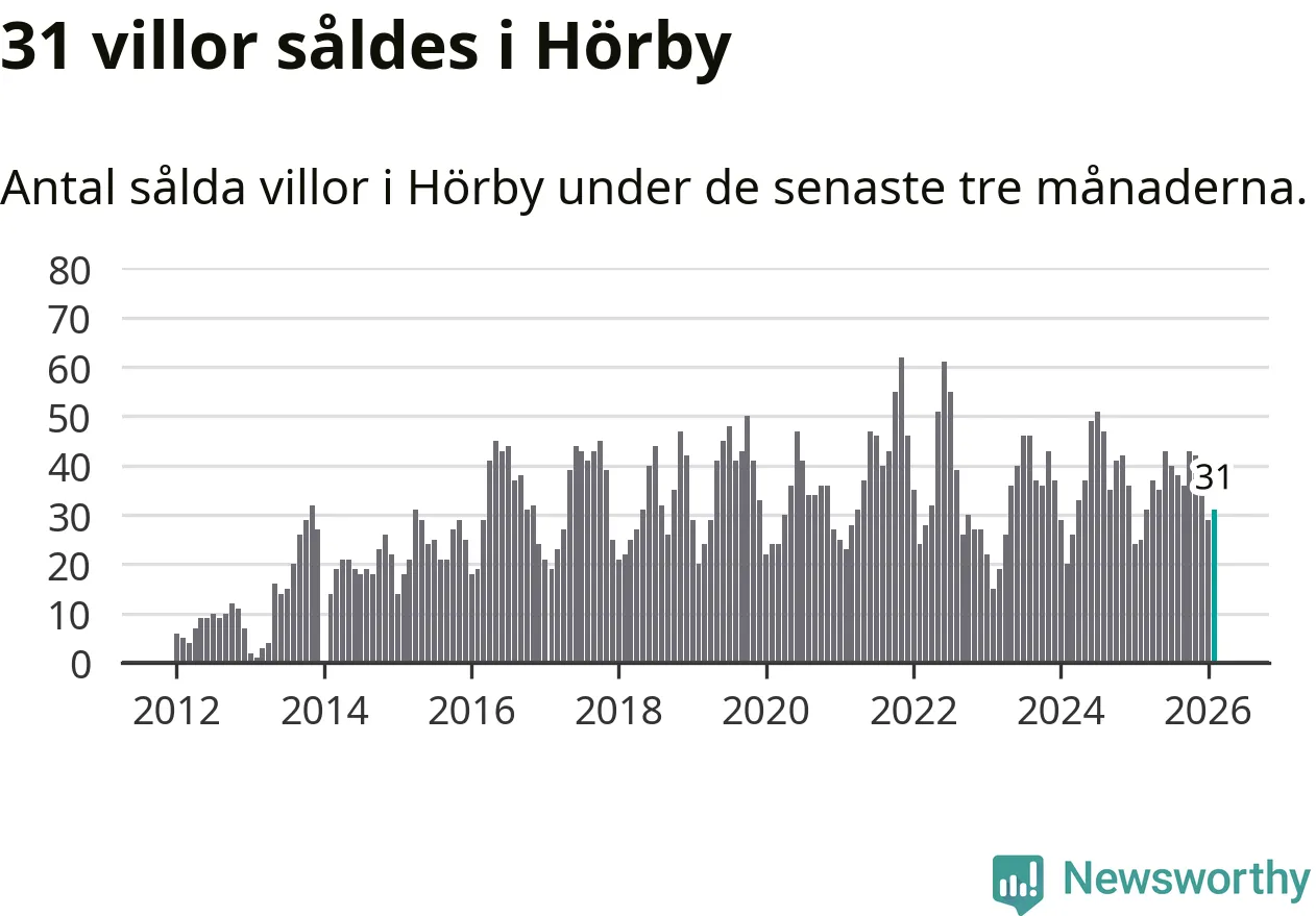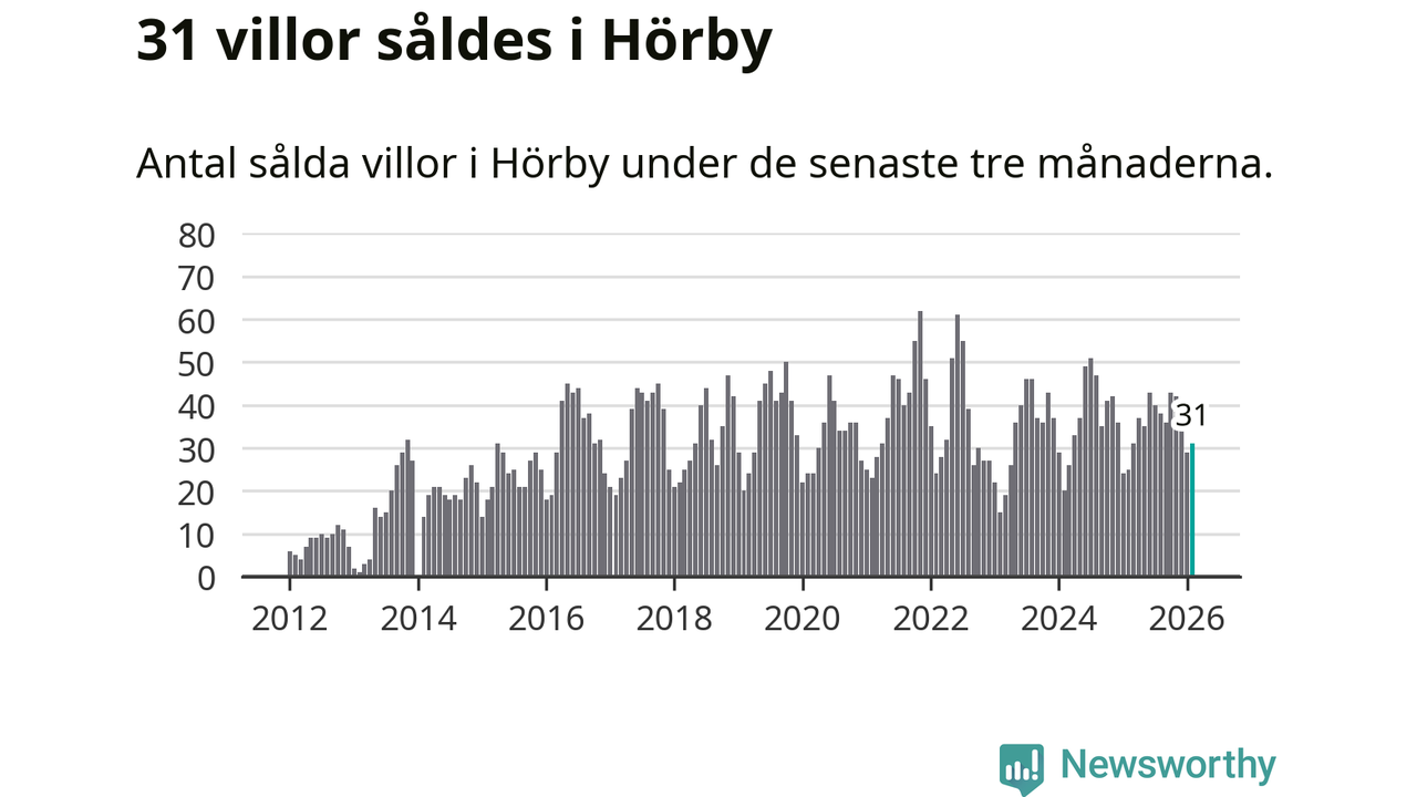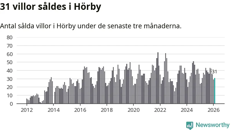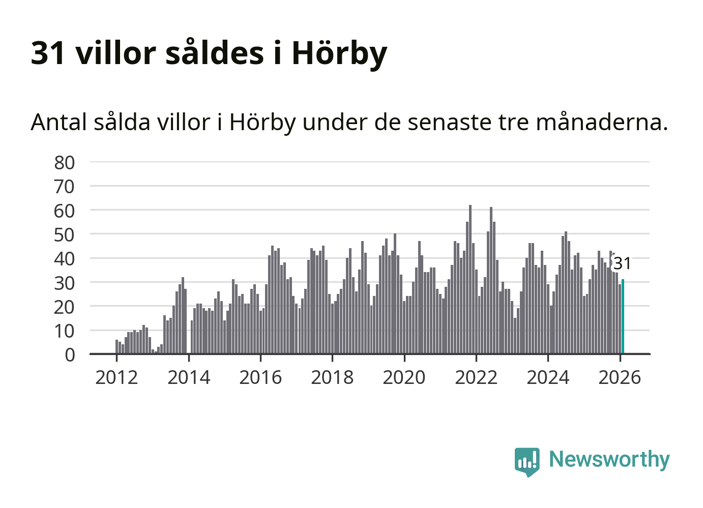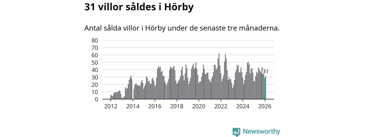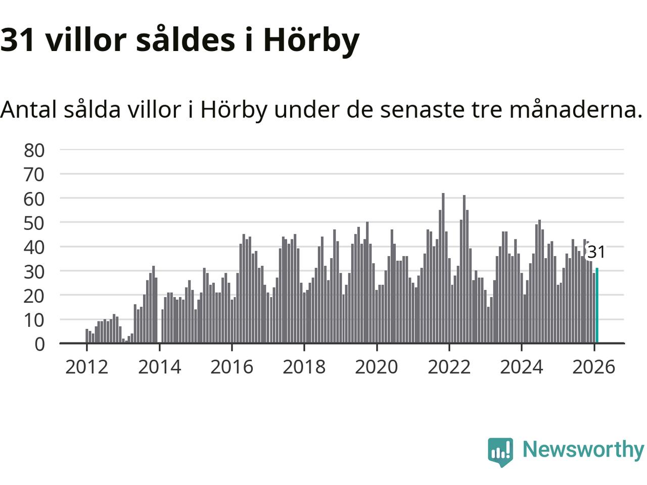 Mellan december och februari gjordes sammanlagt 31 affärer med villor i Hörby kommun. Det kan jämföras med 25 vid motsvarande tid i fjol.
