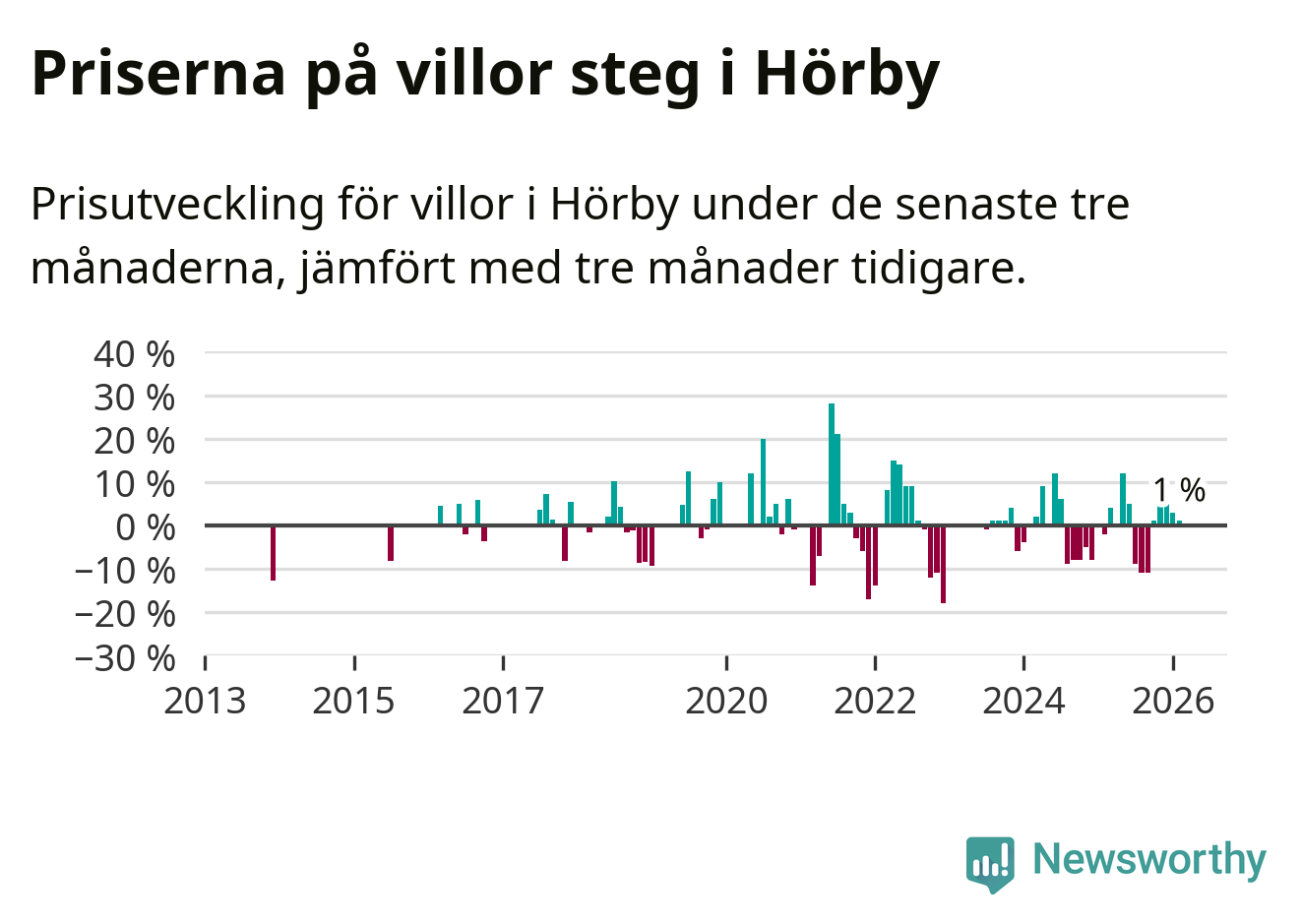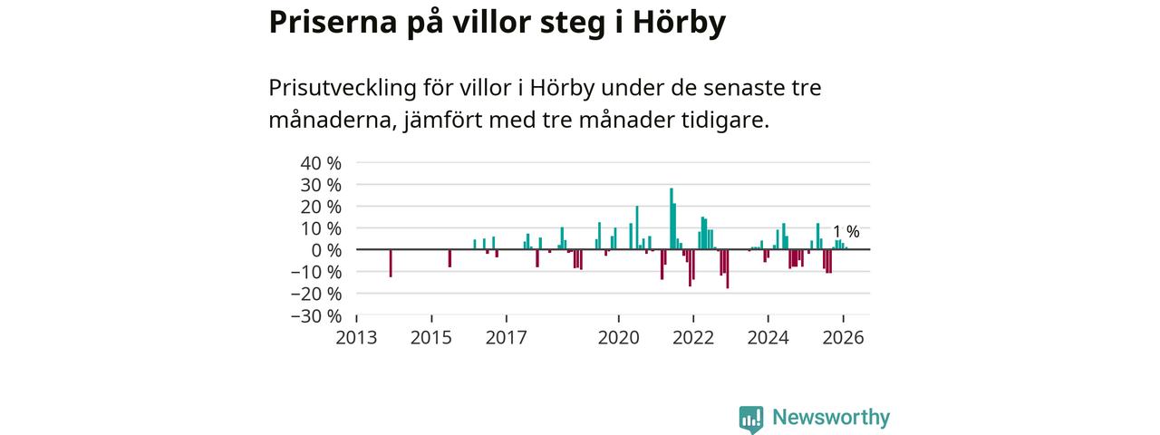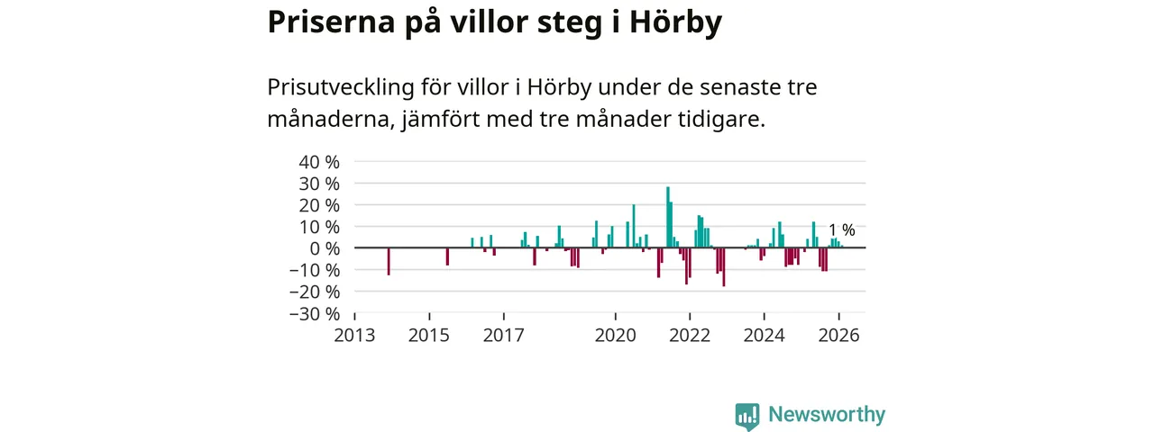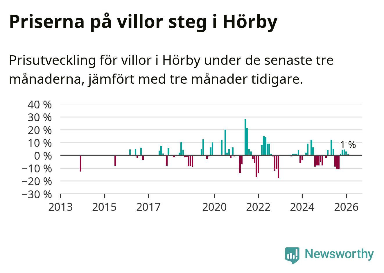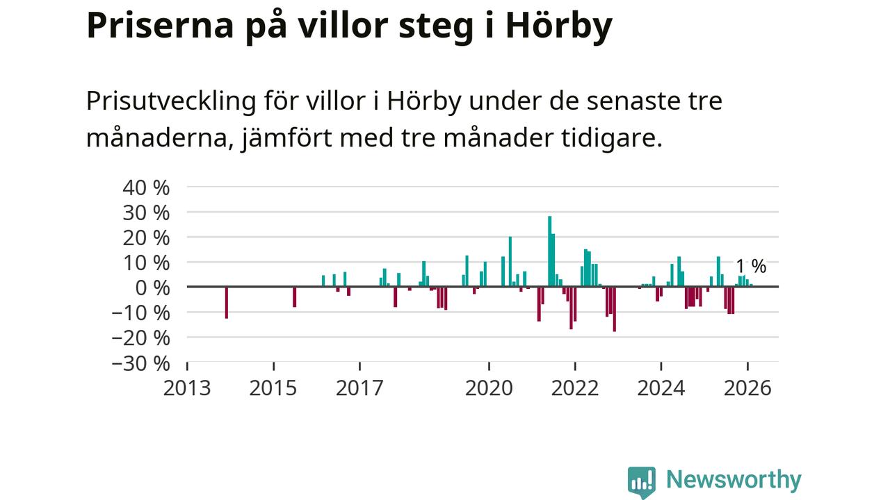 Statistiken visar även på en prisuppgång i Hörby kommun. Medelpriset på försäljningarna av villor i kommunen var 1 procent högre än för tre månader sedan. I hela Skåne däremot sjunker villapriserna. I hela länet noterades en prisnedgång på 1 procent.