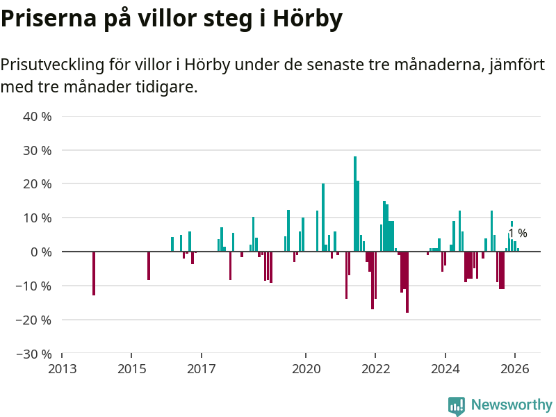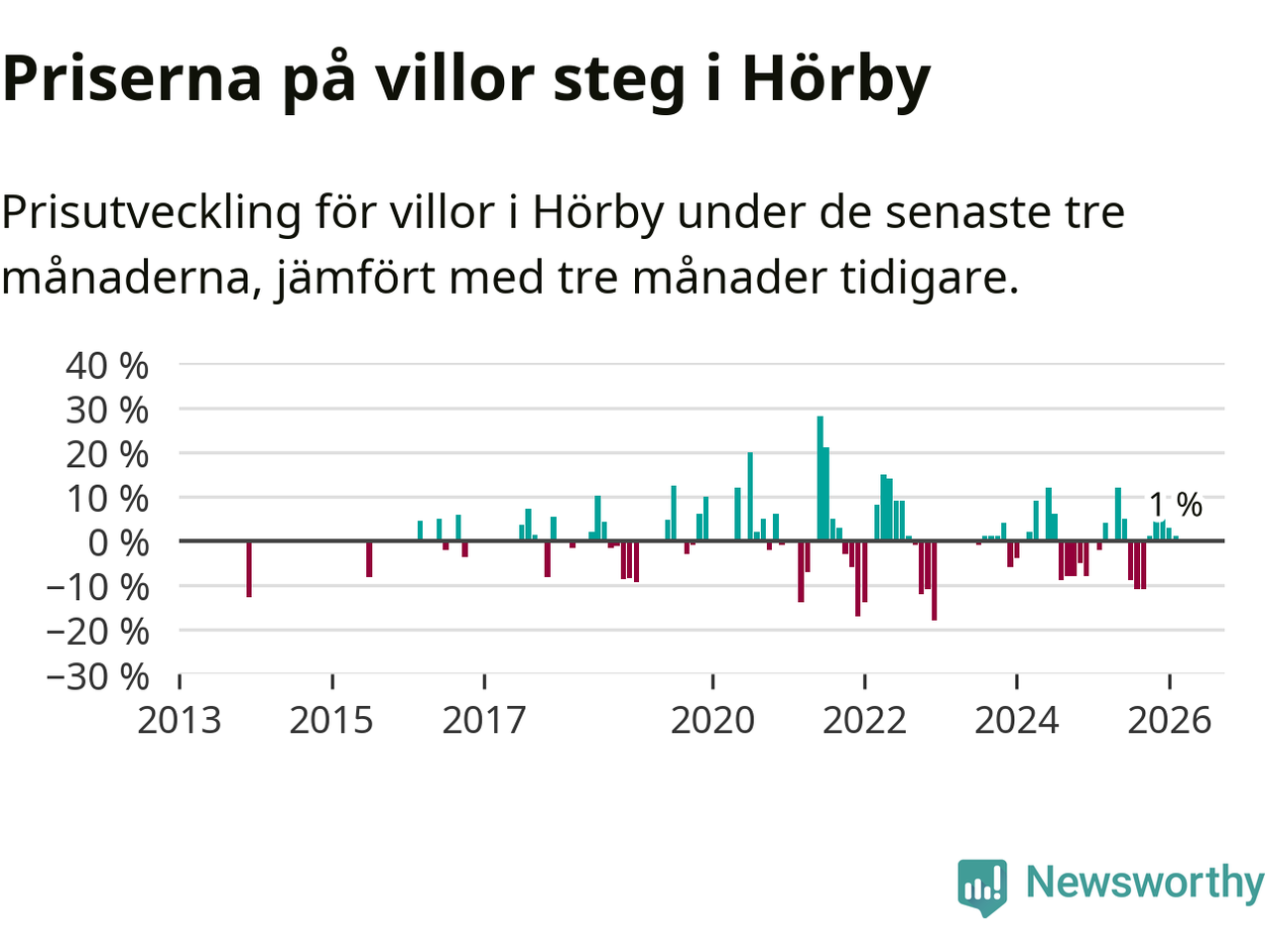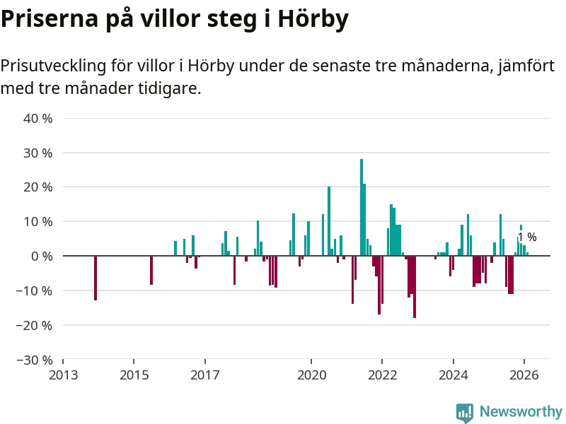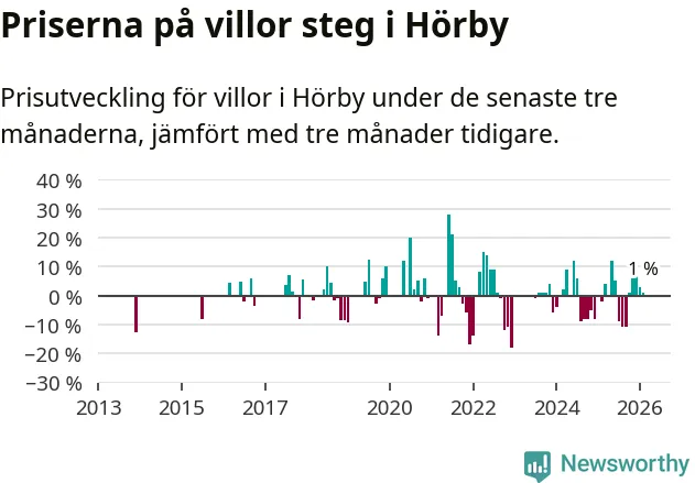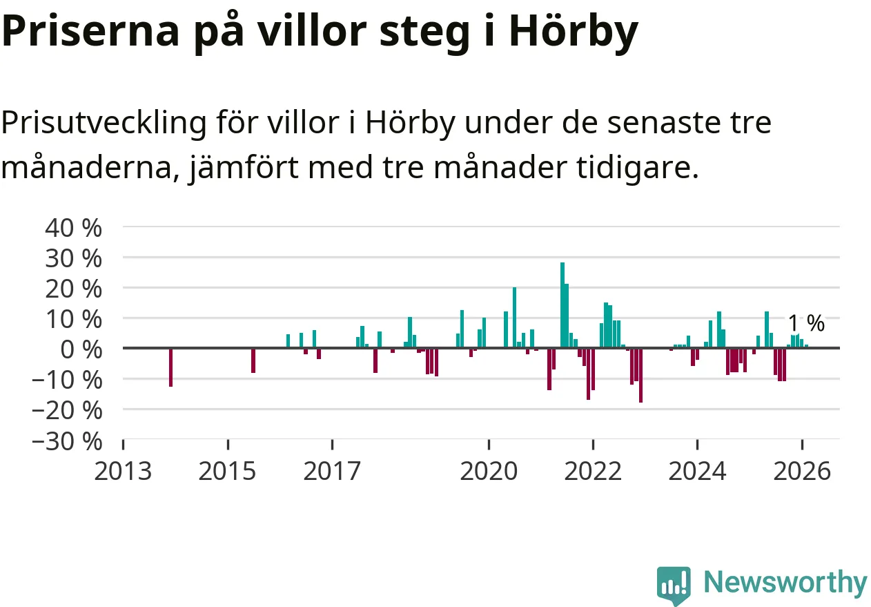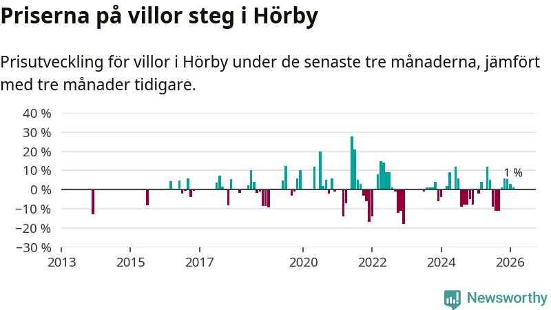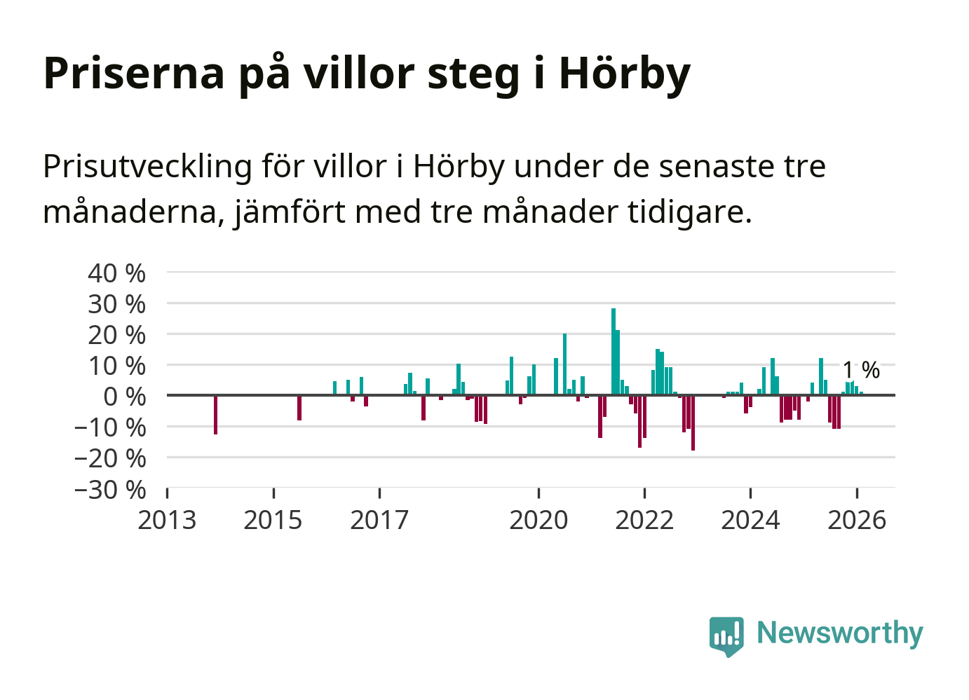 Statistiken visar även på en prisuppgång i Hörby kommun. Medelpriset på försäljningarna av villor i kommunen var 1 procent högre än för tre månader sedan. I hela Skåne däremot sjunker villapriserna. I hela länet noterades en prisnedgång på 1 procent.
