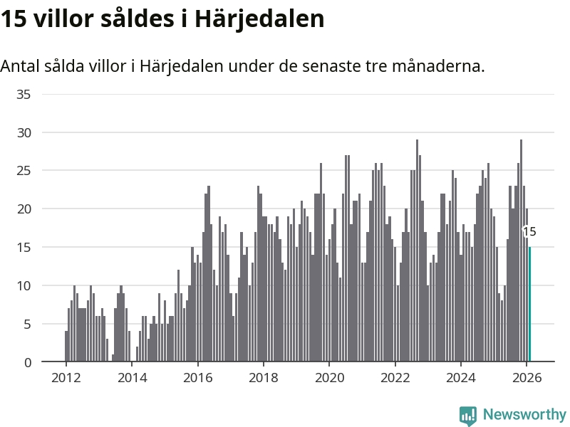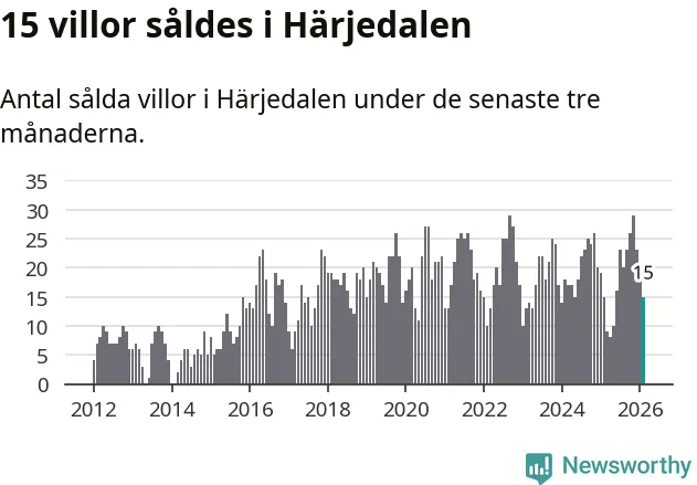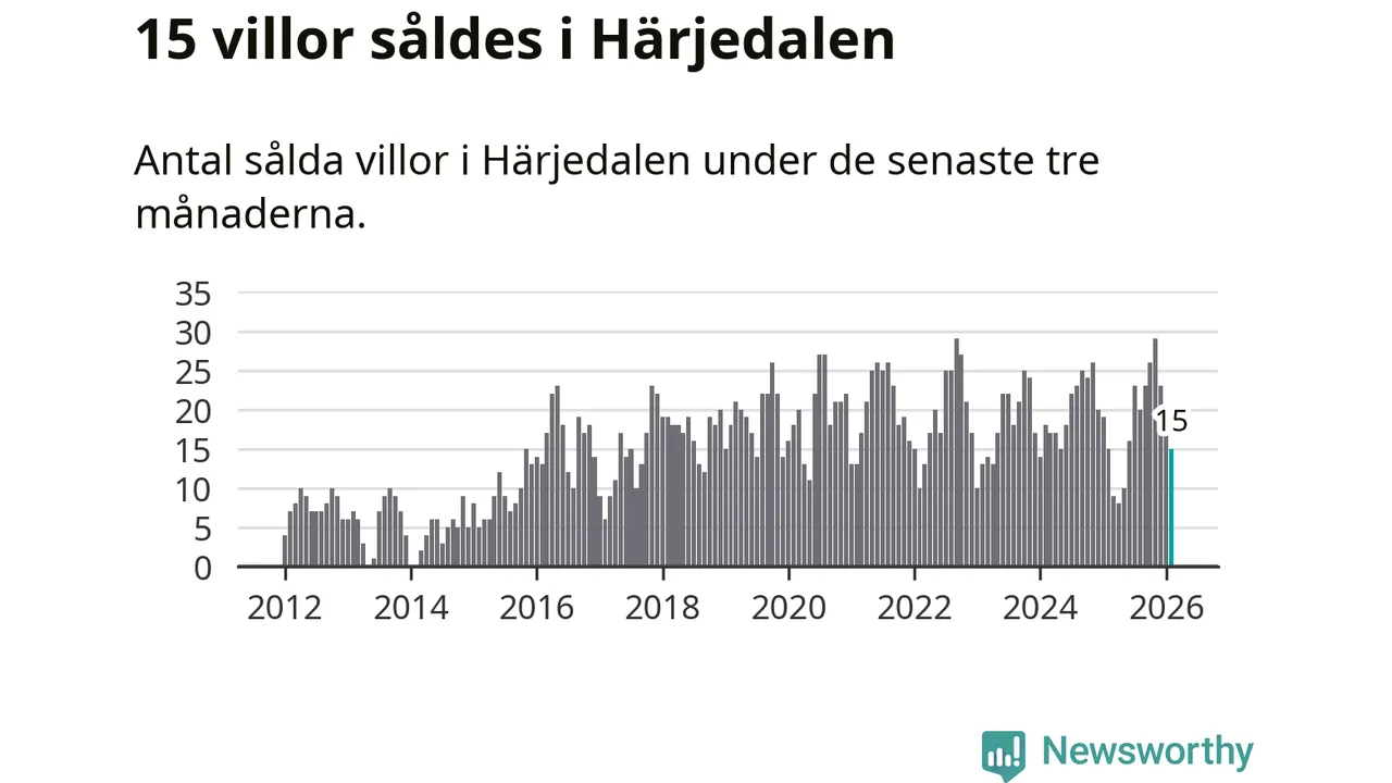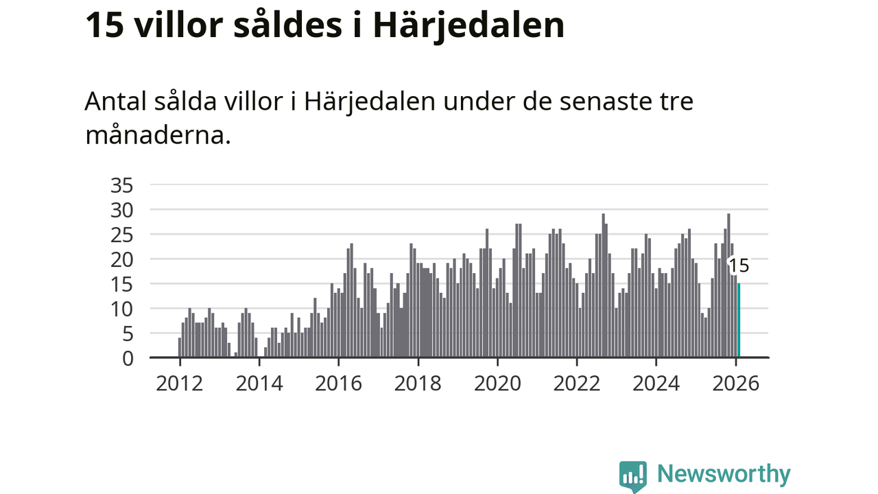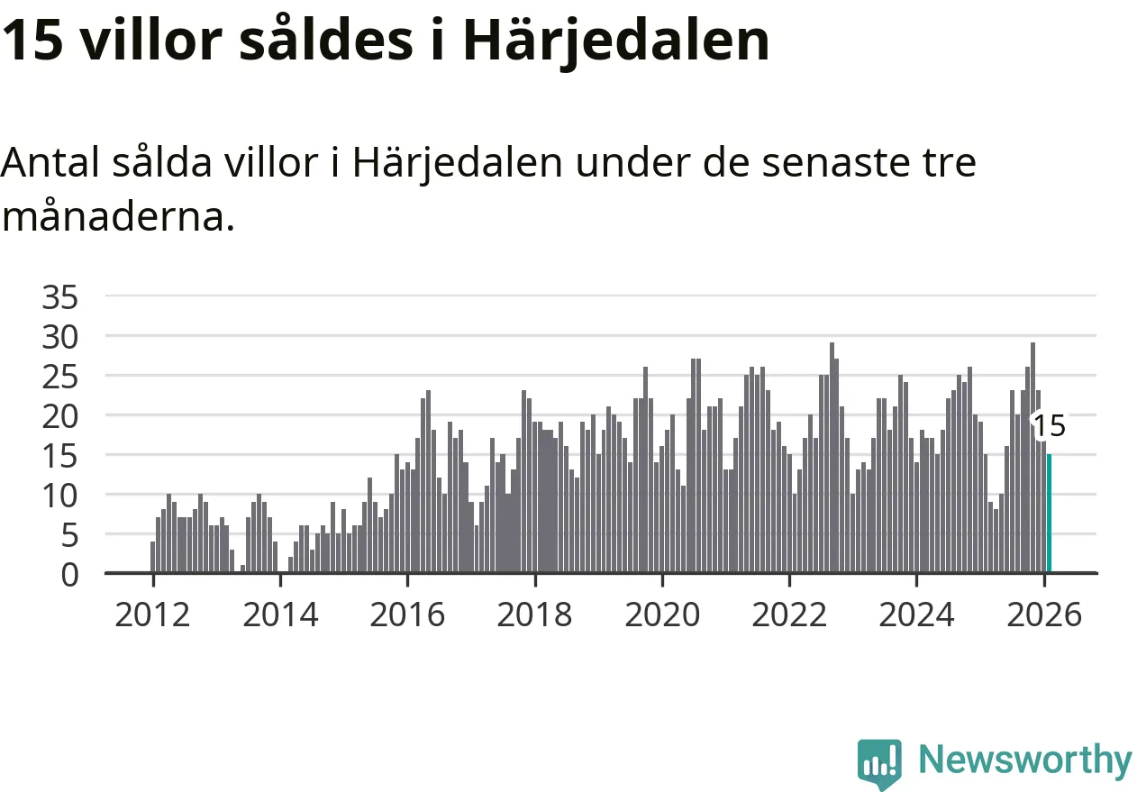 Mellan december och februari gjordes sammanlagt 15 affärer med villor i Härjedalens kommun. Det är lika många affärer som vid motsvarande tid i fjol.