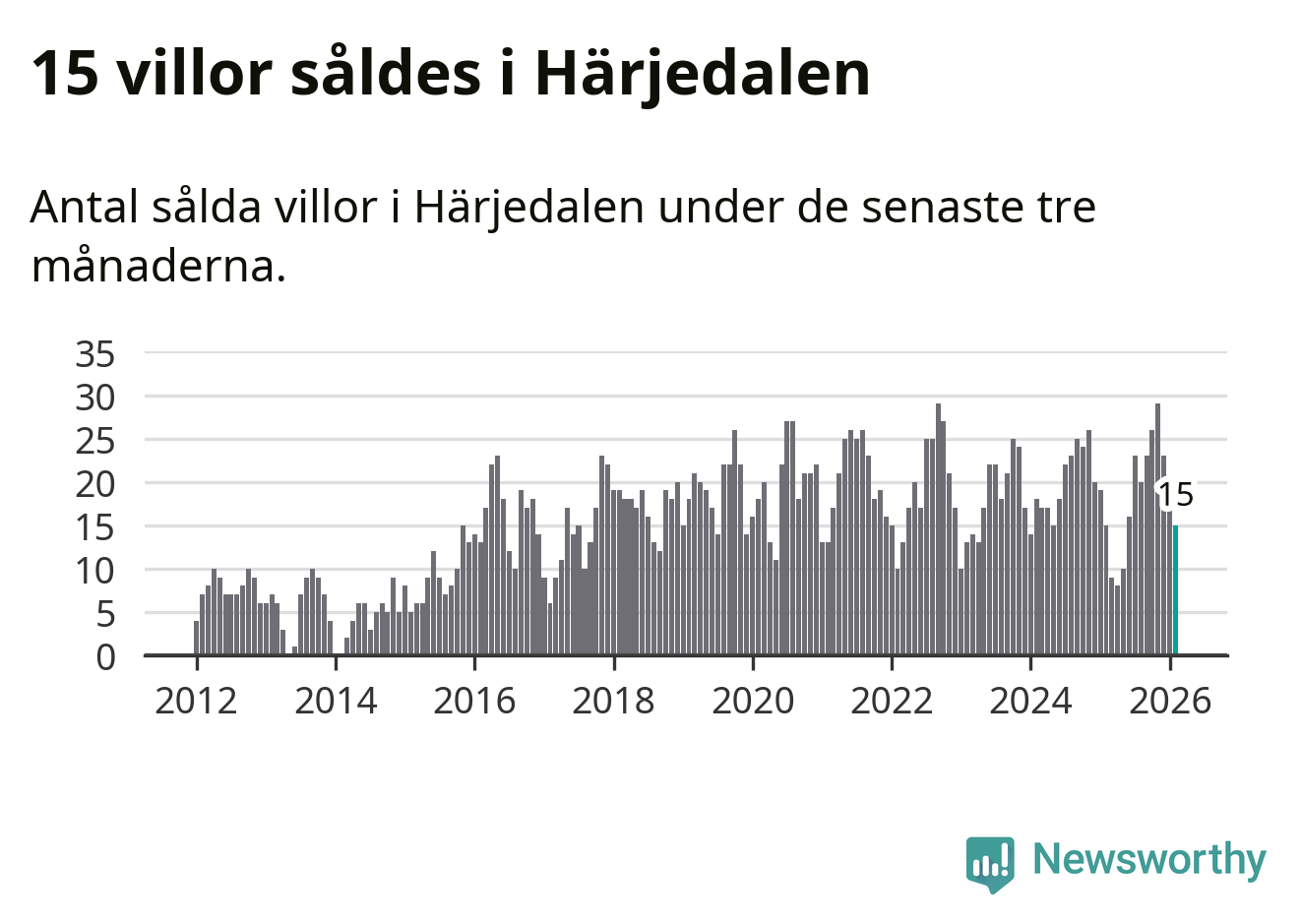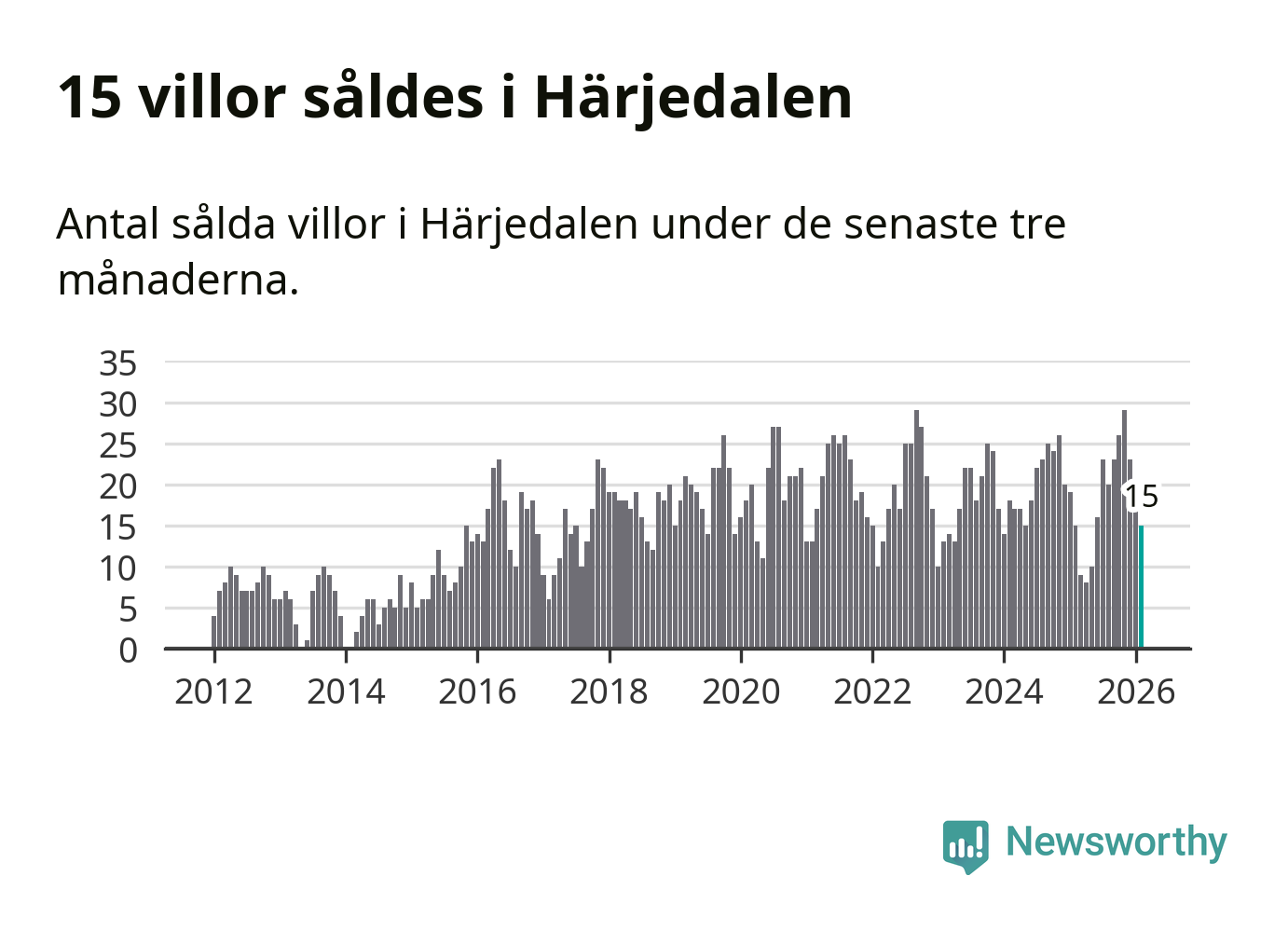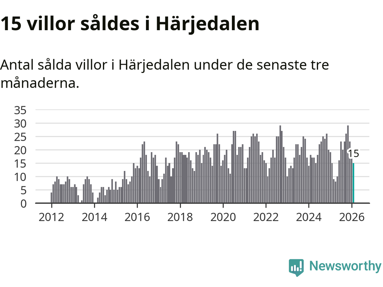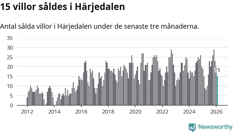 Mellan december och februari gjordes sammanlagt 15 affärer med villor i Härjedalens kommun. Det är lika många affärer som vid motsvarande tid i fjol.