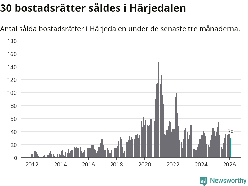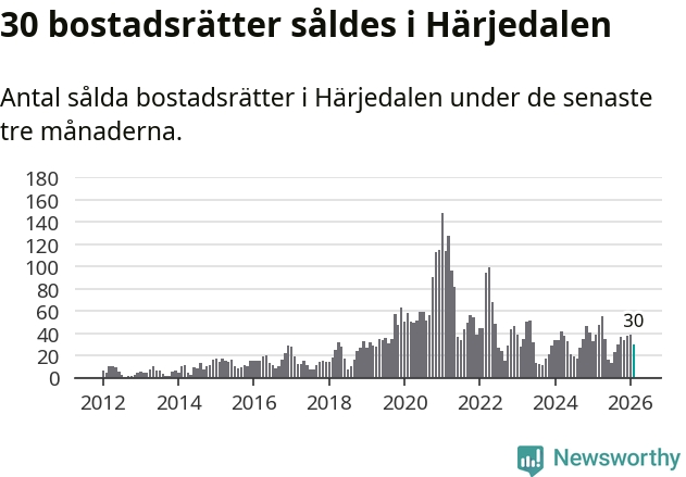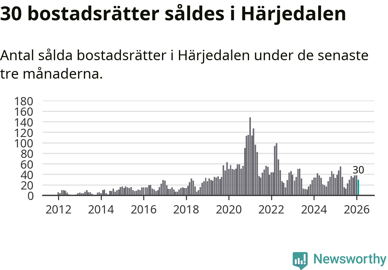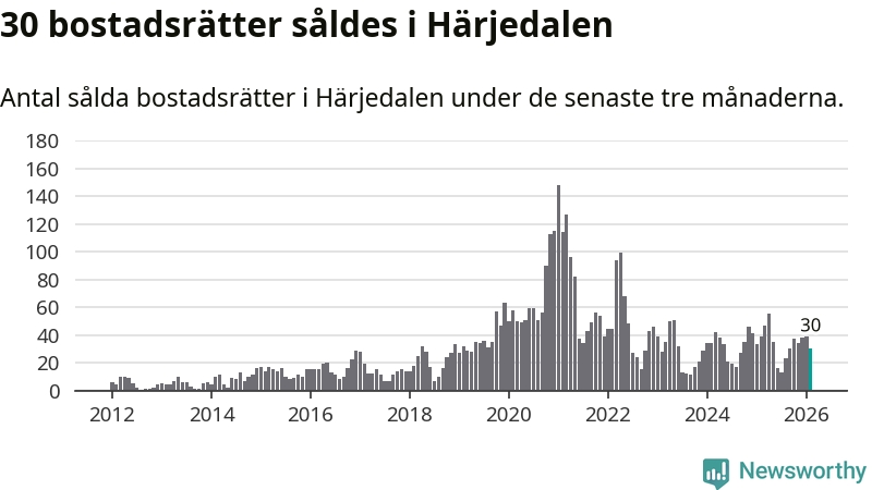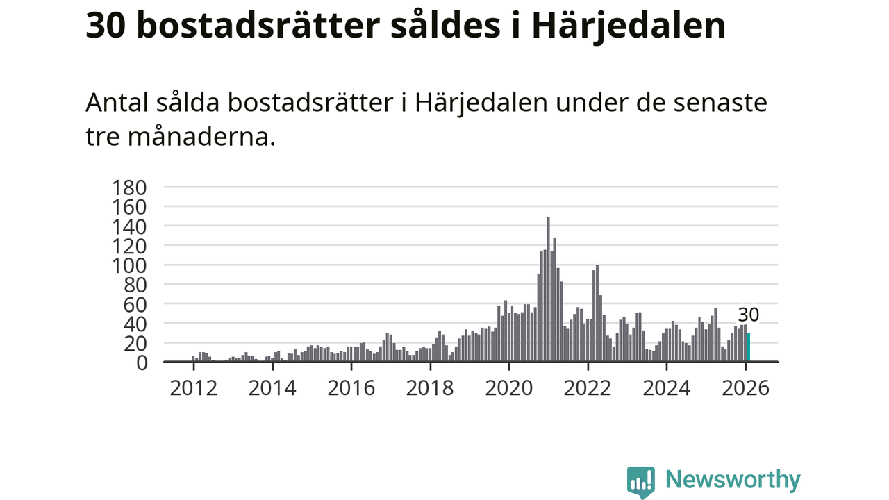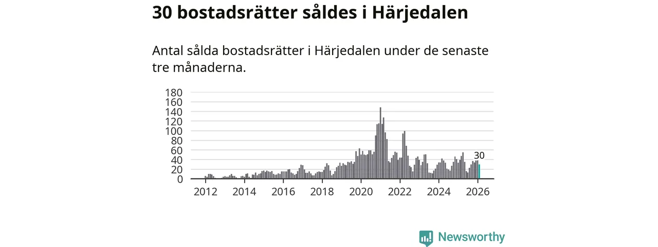 Sammanlagt såldes 30 bostadsrätter i Härjedalens kommun mellan december och februari till ett genomsnittligt pris på 3,0 miljoner kronor. I fjol gjordes 39 affärer vid den här tiden på året.