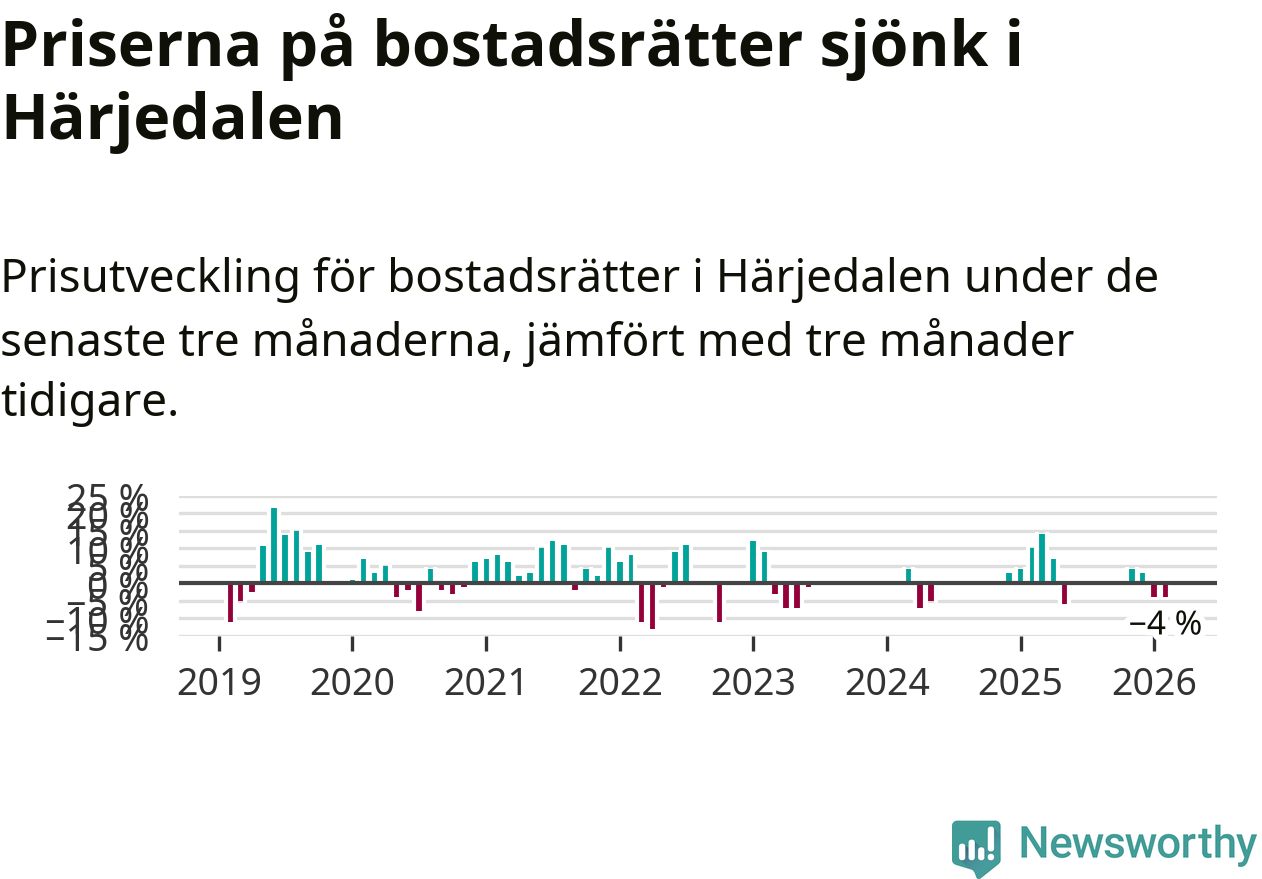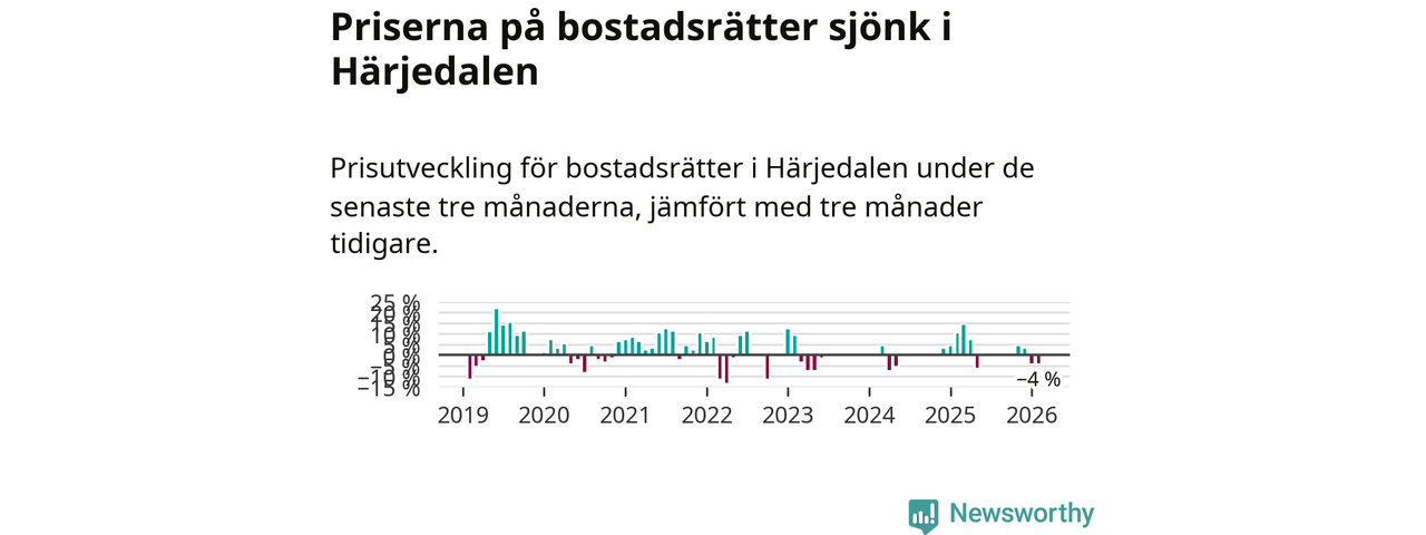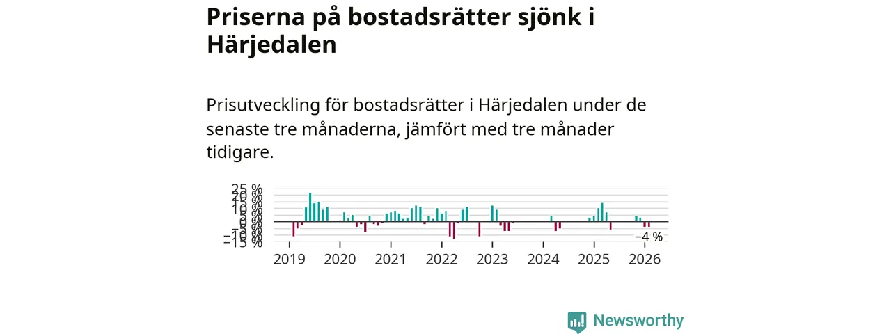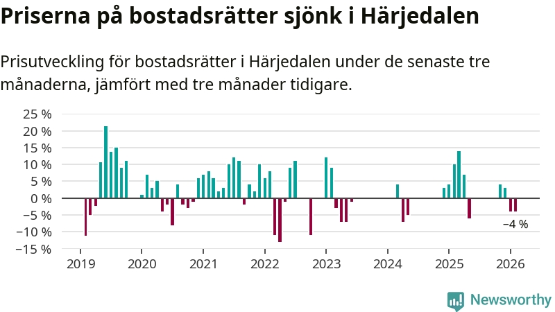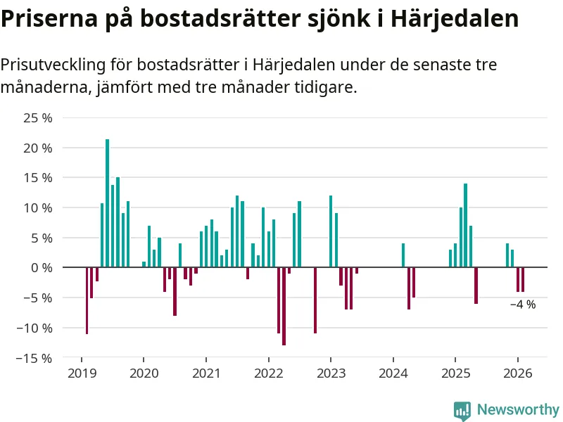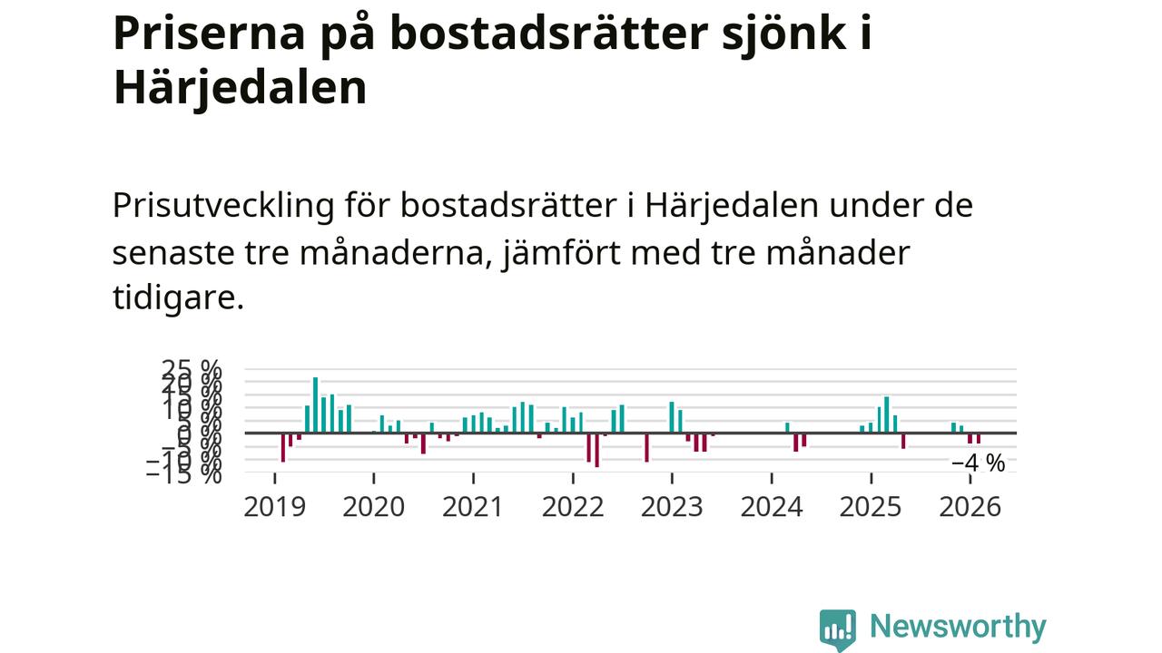 Priserna på bostadsrätter har gått ner i Härjedalens kommun. Medelpriset på försäljningarna under de senaste tre månaderna visar på en nedgång med 4 procent.